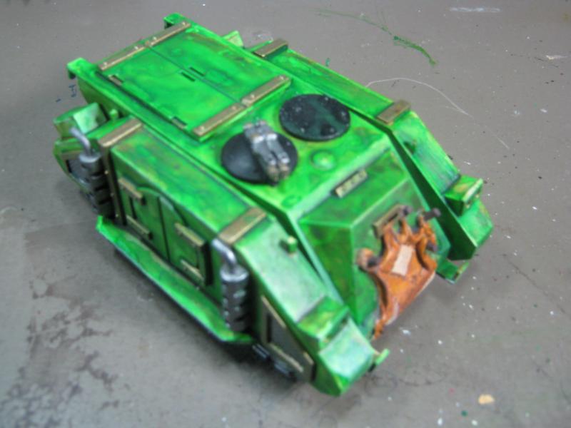 If you'd like to tone down your LR you may want to try creating a wash by mixing black with a dark red (like GW Red Gore or Scab Red) and then add a significant amount of water to it. Red is the natural contrast to green on the color wheel. I know you may be thinking red wash = pink, because often it does, so if you add some black to it, I think it may darken your land raider and keep some of the molded details. Another option would be to use some classic GW Chestnut Ink, if you can find any. As I believe it it OOP. Just some random thoughts on the matter.