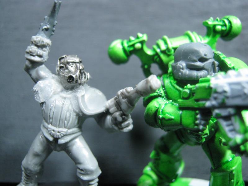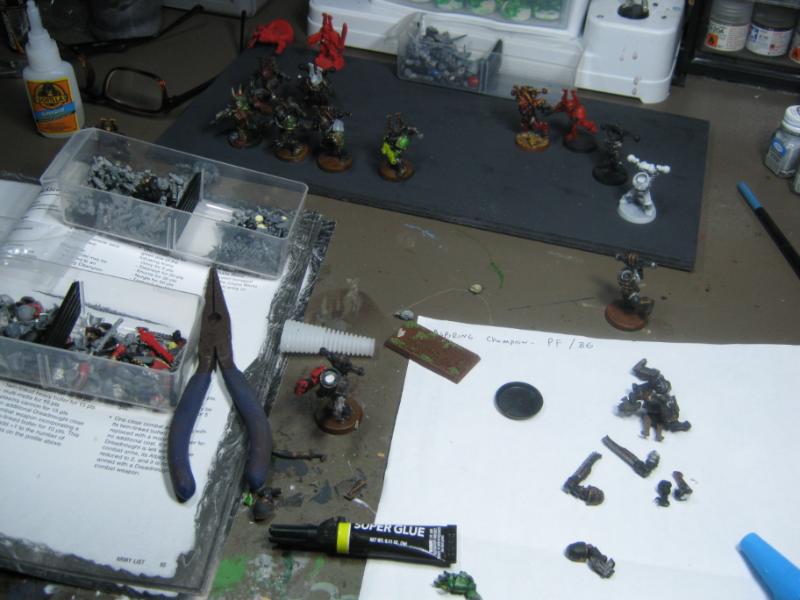 Until then, here's a teaser glimpse of the future- I've started to convert the next generation of my Death Guard Plague Marines. It's a bad photo and it's a mess, but a good idea of where I am starting. This will be an Aspiring Champion when it is done.