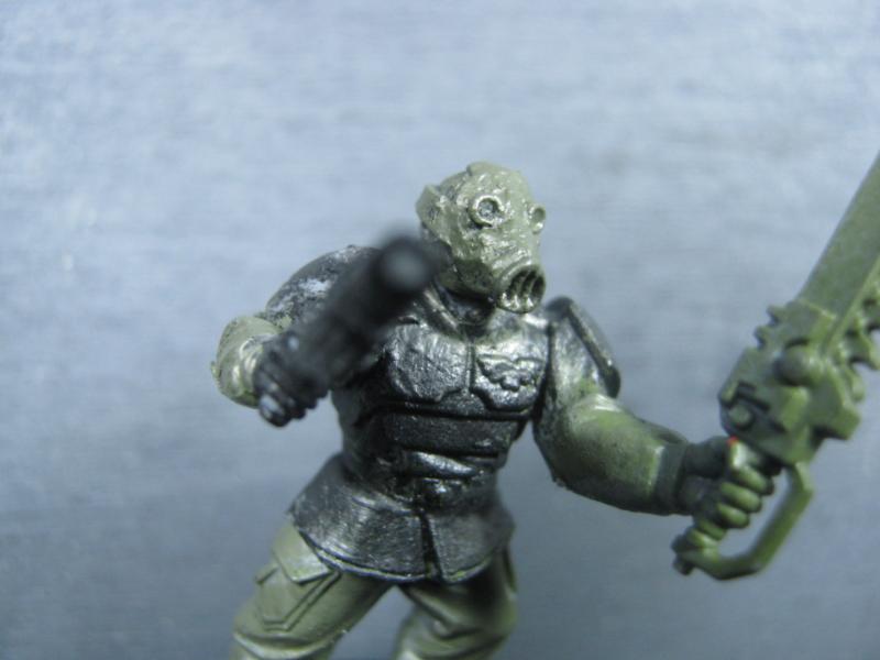 Anyway, therapy session over. Here's my latest update. I spent most of my weekend being social around real live people. You can imagine the detrimental effect that had on my modeling time. I was not able to get a lot done, but I was able to very carefully remove all mold lines, models some GS to fill connection seams (also used it to put a bit more "plague" on him) and decided on a Flesh Wash base instead of my regular home-brew Green Ink wash.