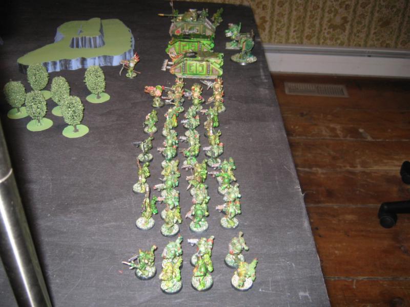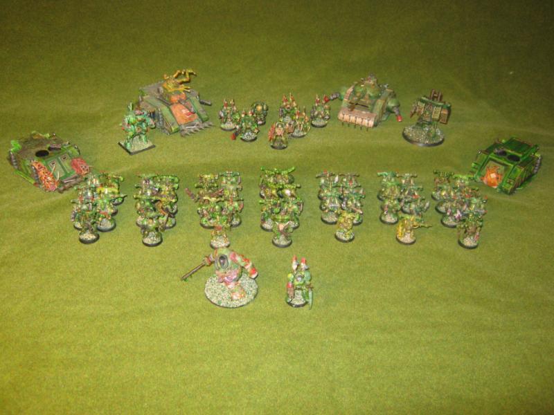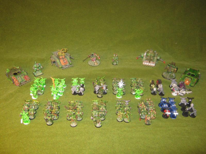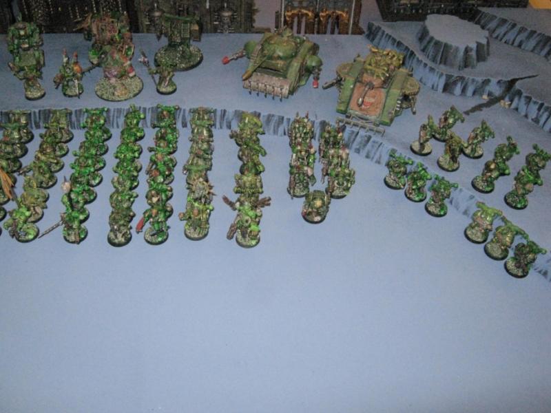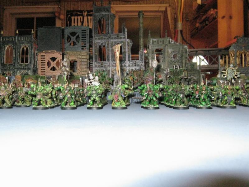 Overview of my army. I stated it in 1997 and have built on them over time. The Death Guard were part of a larger force comprised of World Eaters, Death Guard, Iron Warriors, and Black Legion. Each aspect of the force has grown over the years and after a recent battle I decided to complete them as an individual force.