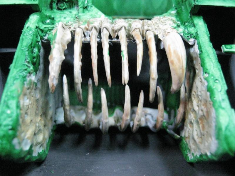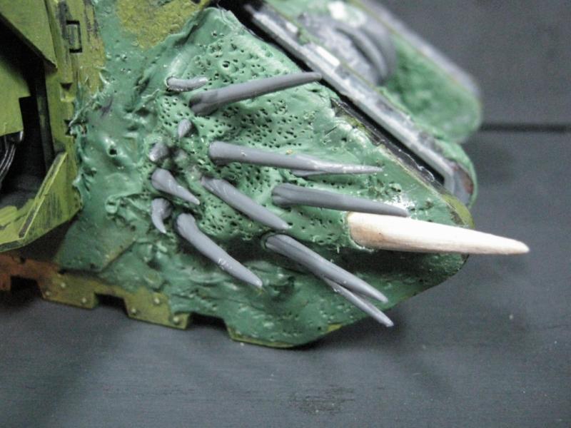 After the Red Gore wash dried I did a light drybrush of white and then Vomit Brown again to take the overall redness out of the "flesh" and pick out the detail better. Also put some touchups on the bone spikes and ulcerated boils in the flesh, also had to touch up the front of the Rhino as bit of the ink came off earlier. Also a bit more work on the trophy rack.