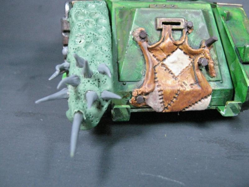After I took the above photos I removed the Rhino ram bar (which was now some weird looking Spiky thing on the back of the Rhino hull) and added a rack of Chaos trophy spikes because there was a gap that needed to be filled on the top and just using plasticard looked weird.
