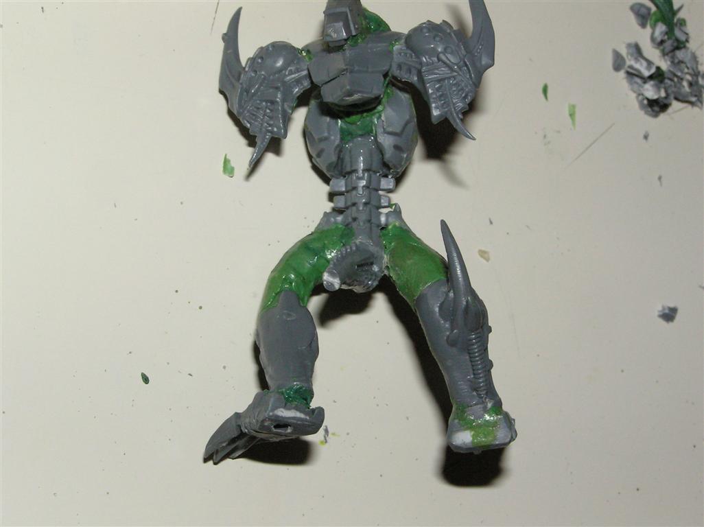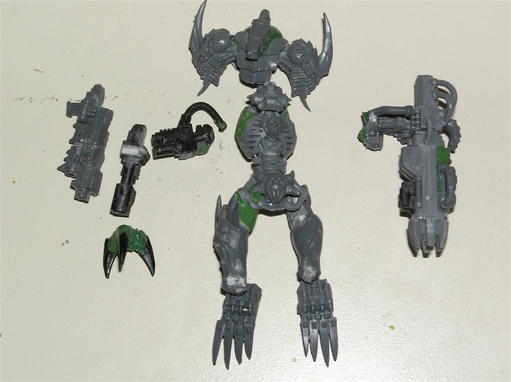For the basic colors I am thinking a grey primer with Boltgun metal washed in Badab black for the armor, and Reaper Olive Green building to Rotting Flesh with a 1:1 wash of Devlan Brown/Thraka Green for the organic areas. Work in some Hazard stripes in random places....keep the shoulderpads matte black.
