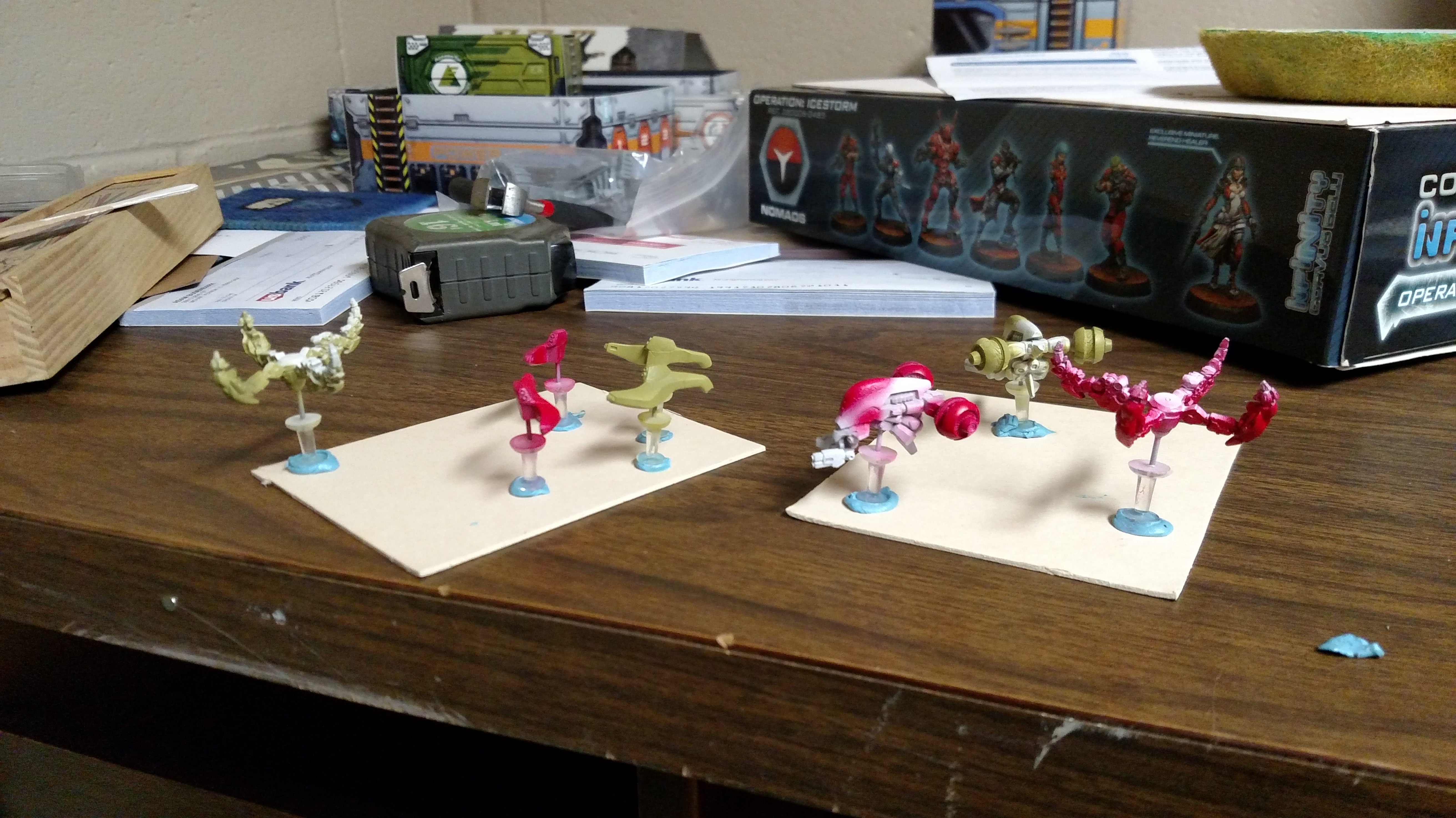 That is probably my favorite new green: Minitaire Pestilence Flesh. It looks good on the Shasvastii, it looks good on the remote. Also note that it's Pestilence flesh + tudor stain. Darkens it up a little. New photos of existing minis:  Whole crew to date. I've got a handful more Bakunin and now a bunch of Corregidor to do as well.  Think this is one of the better/more flattering shots of my Moderators. Bunny needs to get her weapon checked out though..  The Observance side of things, Moira doesn't blend as well as the others but they still play nice.  And everything else, including Spooky, the Powerpuffs, the Moran, and several Koalas. Probably start work on the Corregidor Breach Team soon. And some Deadzone zombies. And some kind of terrain for them.
