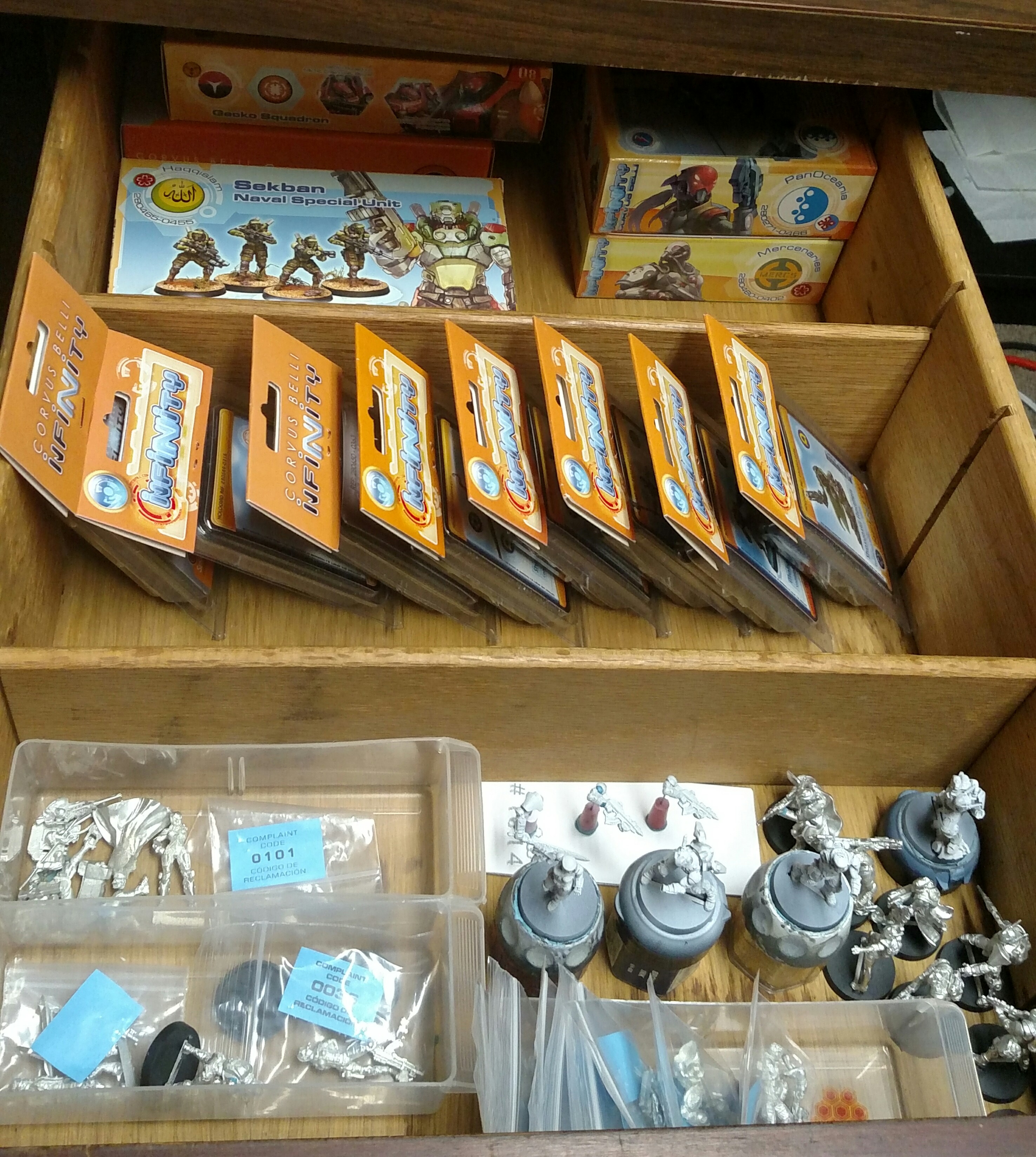 I never said i had a pile of infinity shame. I said that about space marine stuff. I showed it off. Actually... I think I had that pretty organized too. Whoops. I just hate broken bits! I just made the drawer, I'm sure it'll get messier in time... though I do hope to clear it out pretty steadily moving forward. I don't care as much if I get my 365/year done but I'd like to make some progress on that drawer and get some other misc projects worked out. Remotes are getting done today dad gum it. Pretty close.