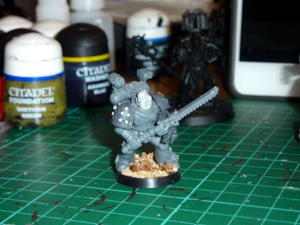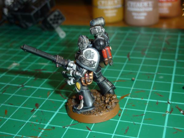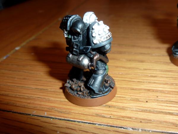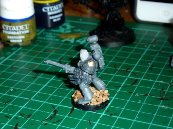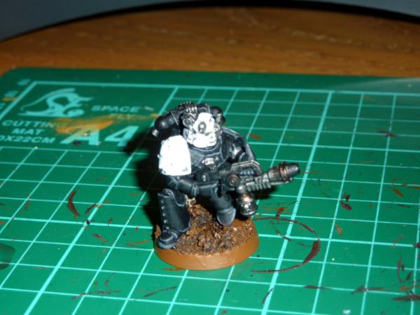 Took a while to do tonight, but i'm pretty pleased. Highlighted the black with adeptus grey, and added company and personal markings. The Green knee pad with the 4 on is to represent that he's from the 4th Grand Company, and its repeated on the back of his powerpack. His left knee pad is his own personal heraldry, I see each marine from that era as a hero in his own right, having fought across the galaxy following the emperor, each one a veteran of countless battles compared to normal men. So each marine will get his own heraldry, though im tempted to have all the members of each squad share a similar colour scheme for them.