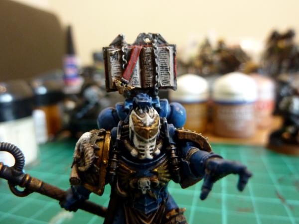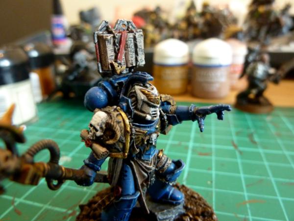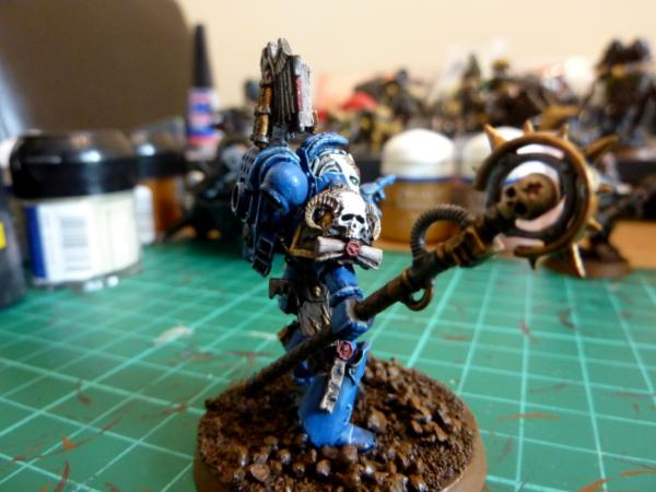 Finally, a close up of my chaplain. He's entirely plastic, made from a marine commander, chaos warrior helmet, chaos marine backpack and random skulls.