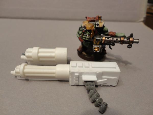 Super Mega shoota (got to call it something ) v2 is still to big. I have some scale shots comparing v1 and v2 for your viewing pleasure but I am going to try again. Got some ideas on how to add some interest to the erm body? of the gun, make it less of a box. I did take some photos to do a mini tut as I went, will see if I can put them together. Here's a scale shoot of the shootas
