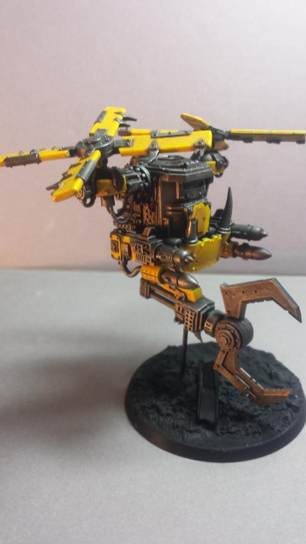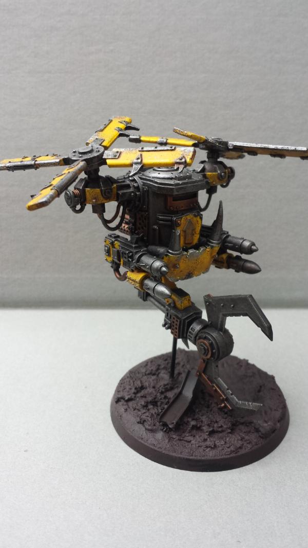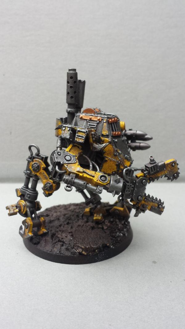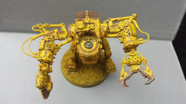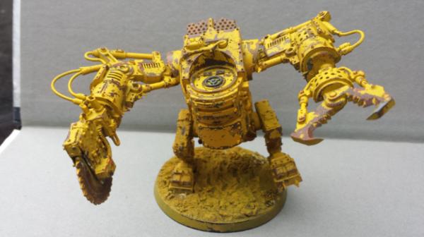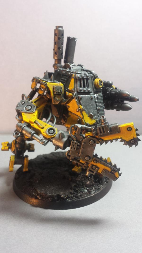 And my Deff Dread, This is my first go at using the hair spray technique. Overall I like the technique, its fairly quick and looks good, definitely something I'm going to be using on my vehicles in the future. I scratched a bit deep in some places, more layers of varnish before using the hairspray should help with that. The yellows very bright when compared to the rest of the army but after finishing the details I plan on using weathering powders to bring it down a bit.