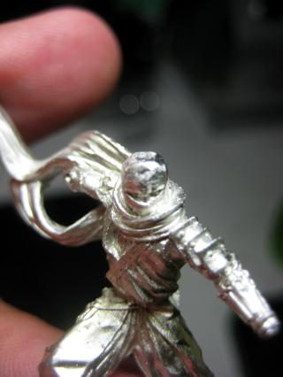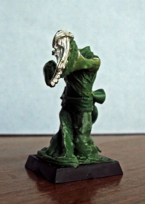 Wizard Front - You're going to have to forgive me for this model- he was constructed when my grasp of GS and single model preparation was rudimentary at best. He's got mould lines, flash... this was before I figured cleaning, brushing, soap & watering, and properly GSing a model BEFORE priming. I anticipate a pretty good paint job on him, as he's being worked on at the standard of my current guy- scheme will be green and gold-trim jacket, cream pants, brownish-chocolate leather, and purple for the fireball in his hand- he had a larger one(check the original), but I'm not OSLing his whole frontside- screw that, charlie..