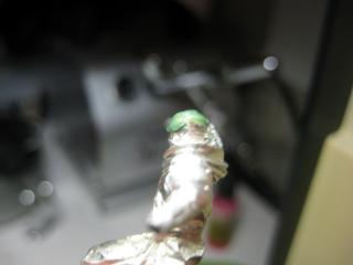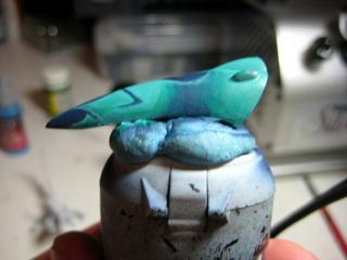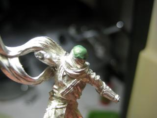 3- GS'd a funky Green Goblin hood on him and chopped the barrel of the specter cannon- it's cut, pinned and GS'd again to reposition the three flanges at the top to make room for the scythe. Now the prongs are set in a way that the scythe is in-line with the rest of the weapon instead of sticking out at an odd angle. Will GS some small spiritstones onto the scythe and clean the blade as well.