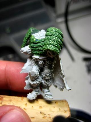 Anyways, onto the meat of this update! I did a bit of work and had several moments of note. First off, let me present my minor pathfinder conversion. I put the guy on a chopped barrel to give him a bit of height, but the contours were all off. So, I took the time to GS extensions to his cloak and foot to make it look more natural.