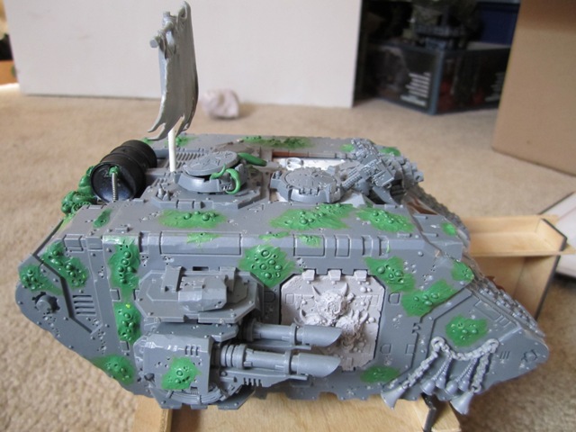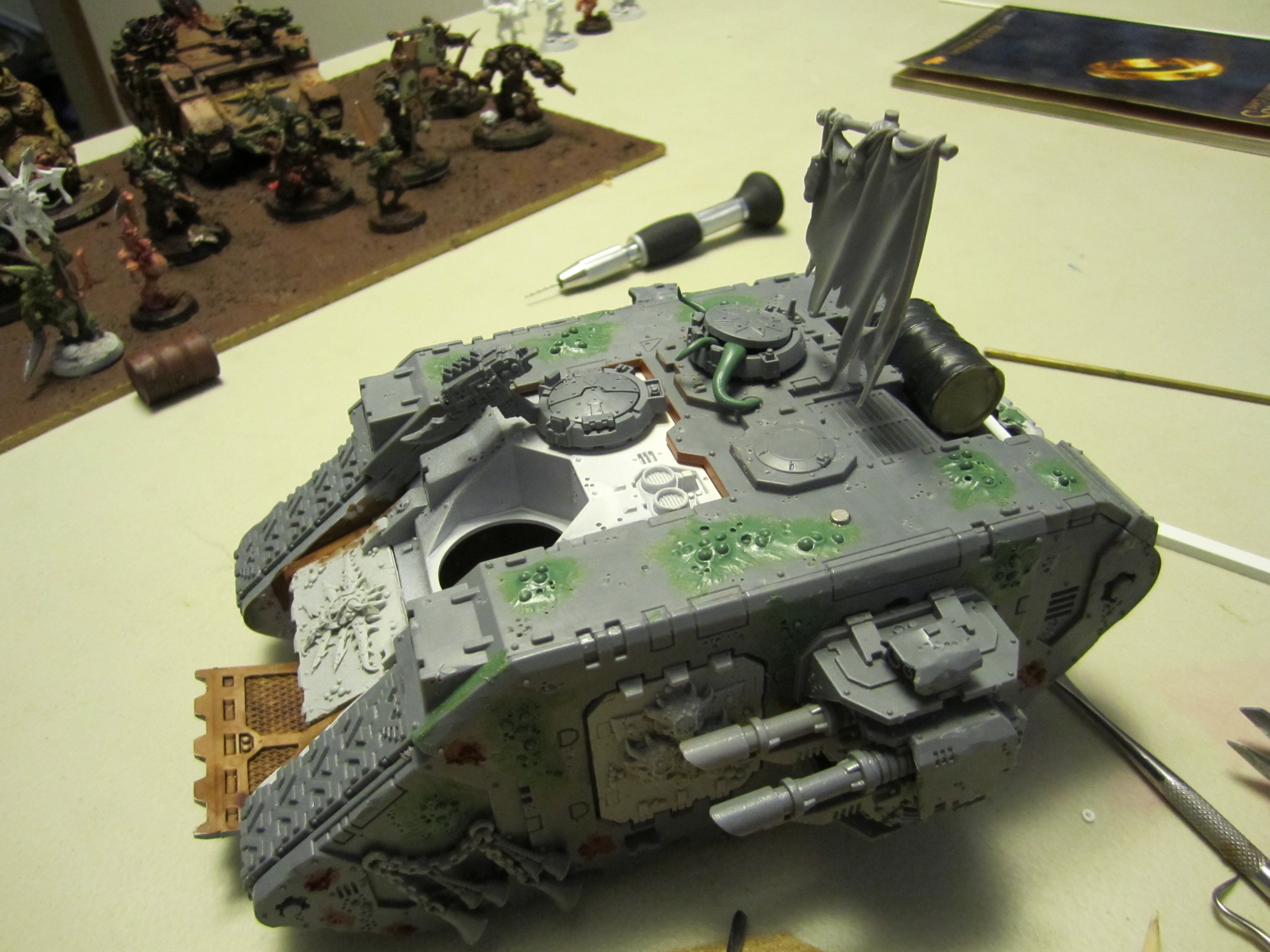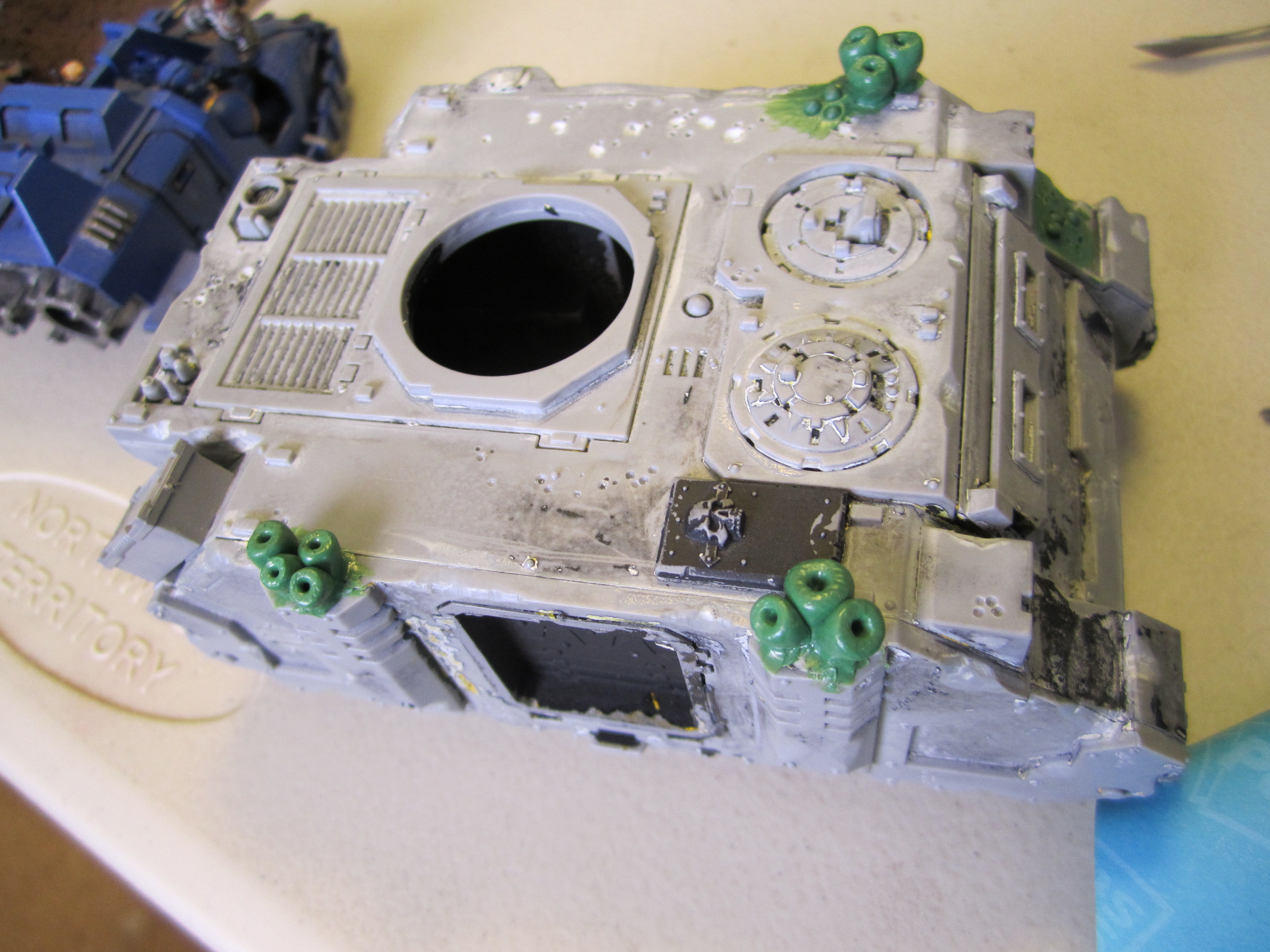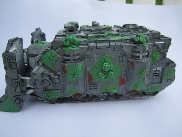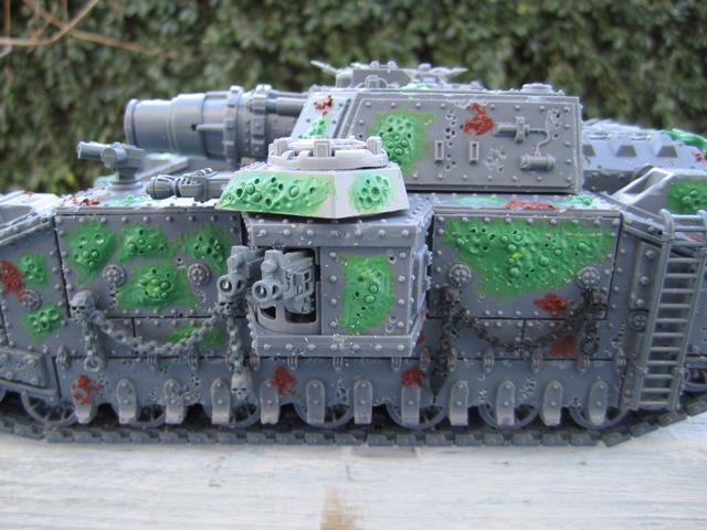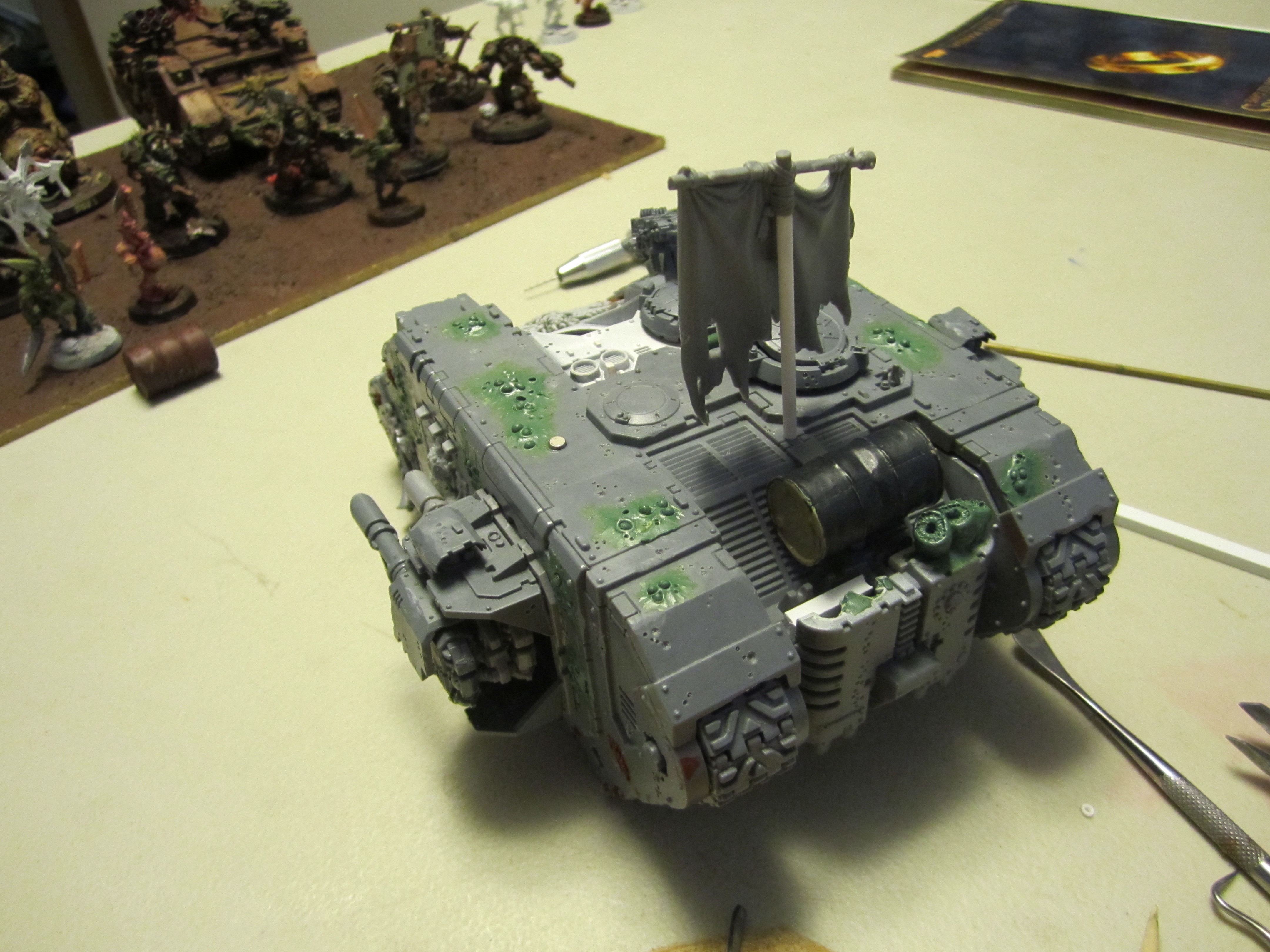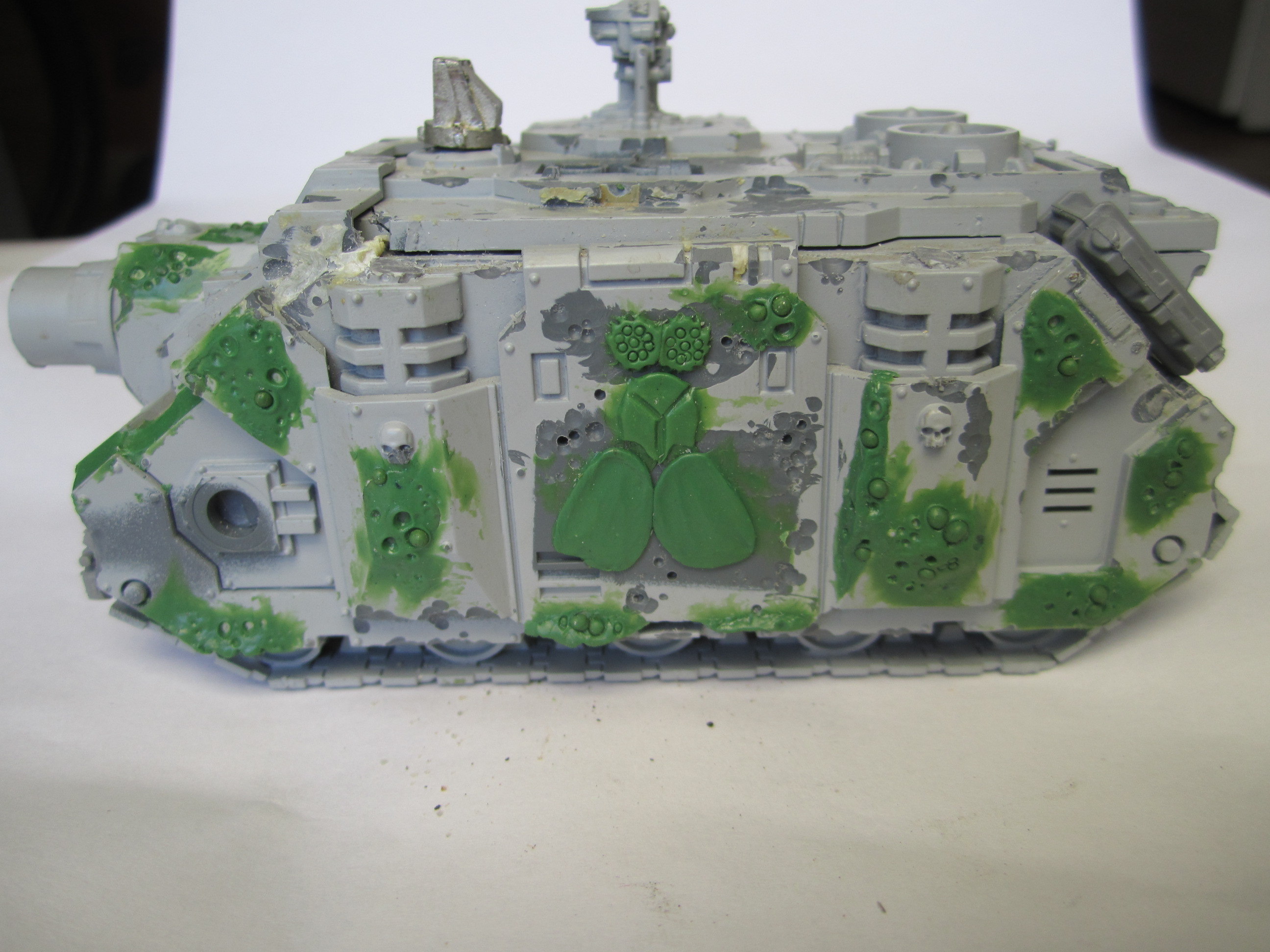 SO its been a little while but as with all projects that i start they move in fits and bursts of energy. My land raider and my terminator squads are the first that are feeling the shift in attitude. I spent a couple of hours working on adding the mark of nurlge to the outside pannels of my land raiders. Hundreads of holes drlled with a pin vice drill and lots of scaping on the sides and edges so that there is lots of evidence of corrosion and wear. Yeahhh. done for the most part.