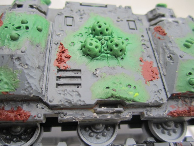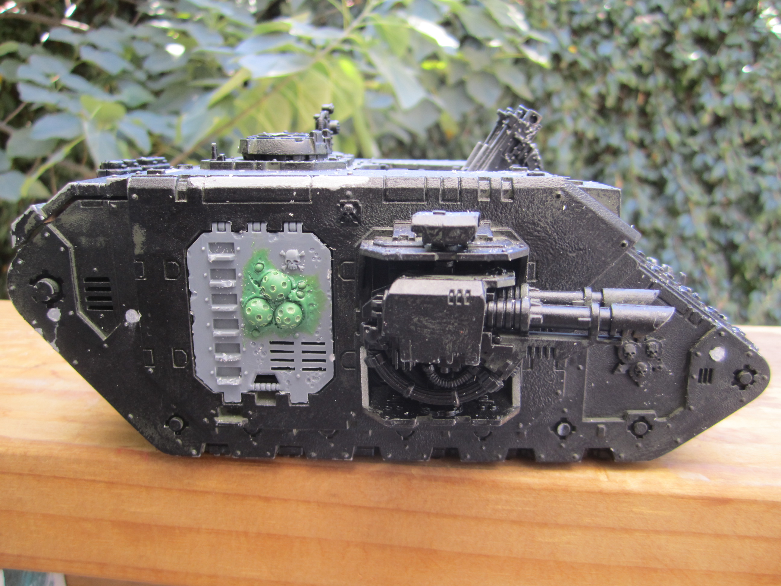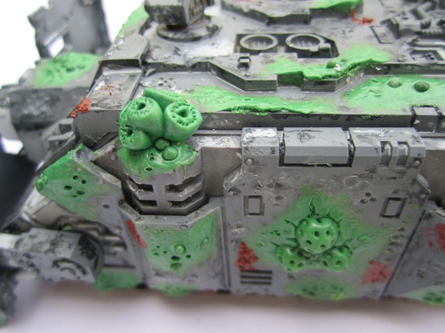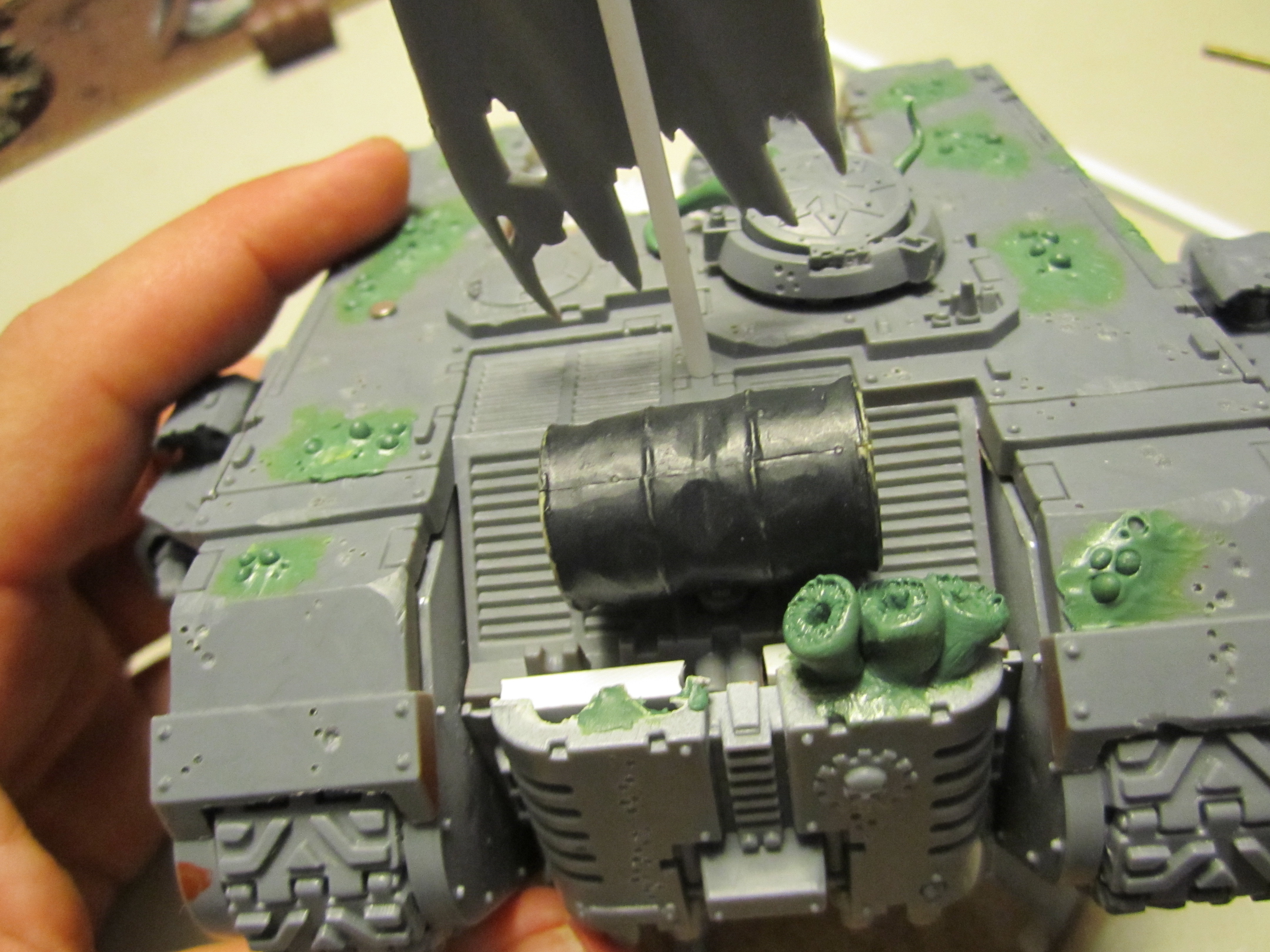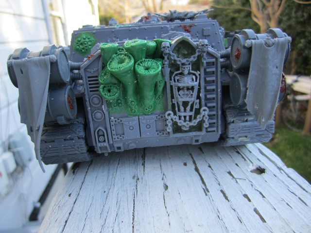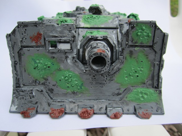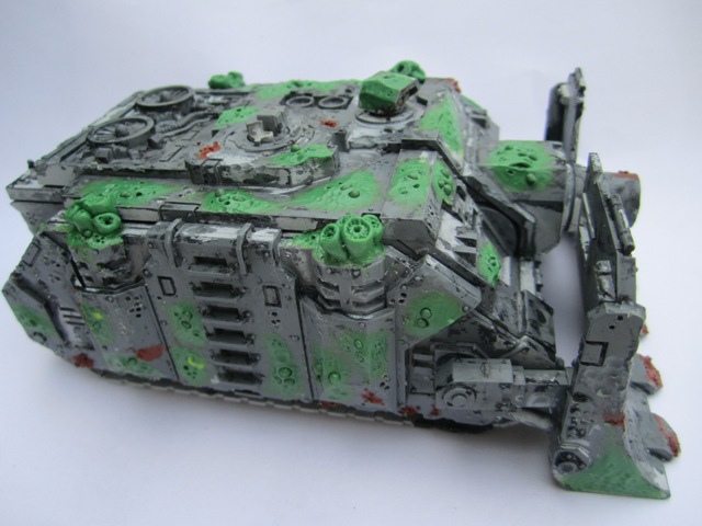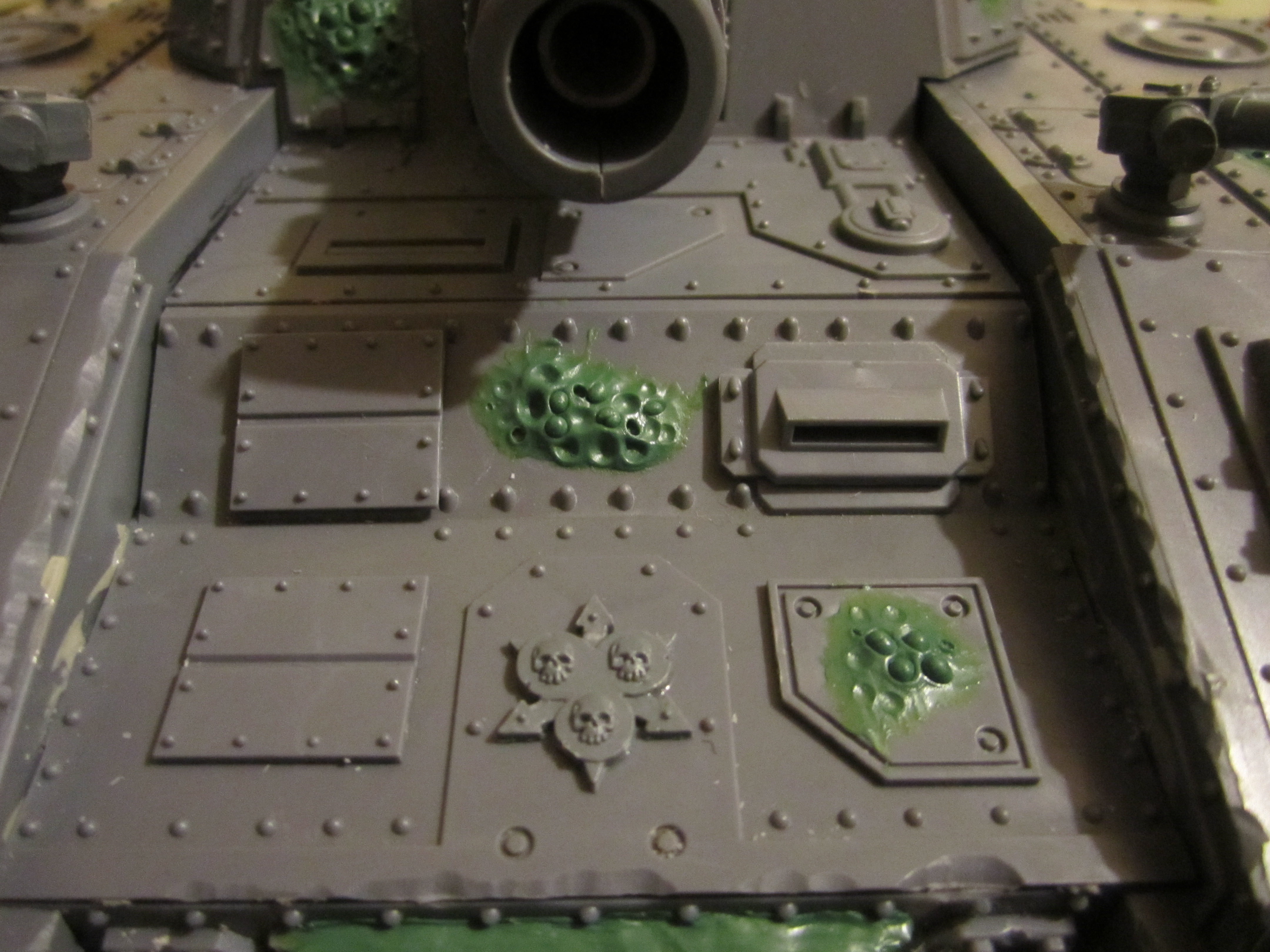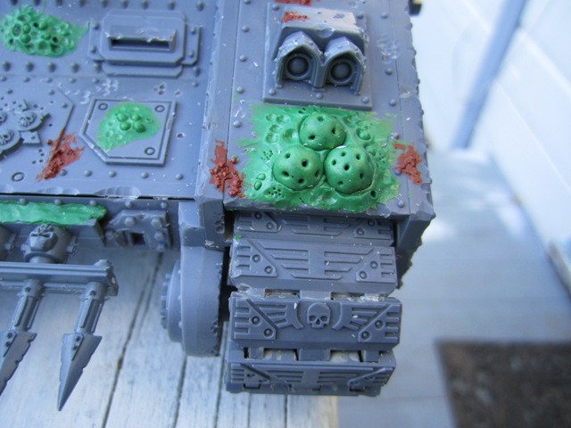 SO its been a little while but as with all projects that i start they move in fits and bursts of energy. My land raider and my terminator squads are the first that are feeling the shift in attitude. I spent a couple of hours working on adding the mark of nurlge to the outside pannels of my land raiders. Hundreads of holes drlled with a pin vice drill and lots of scaping on the sides and edges so that there is lots of evidence of corrosion and wear. Yeahhh. done for the most part.