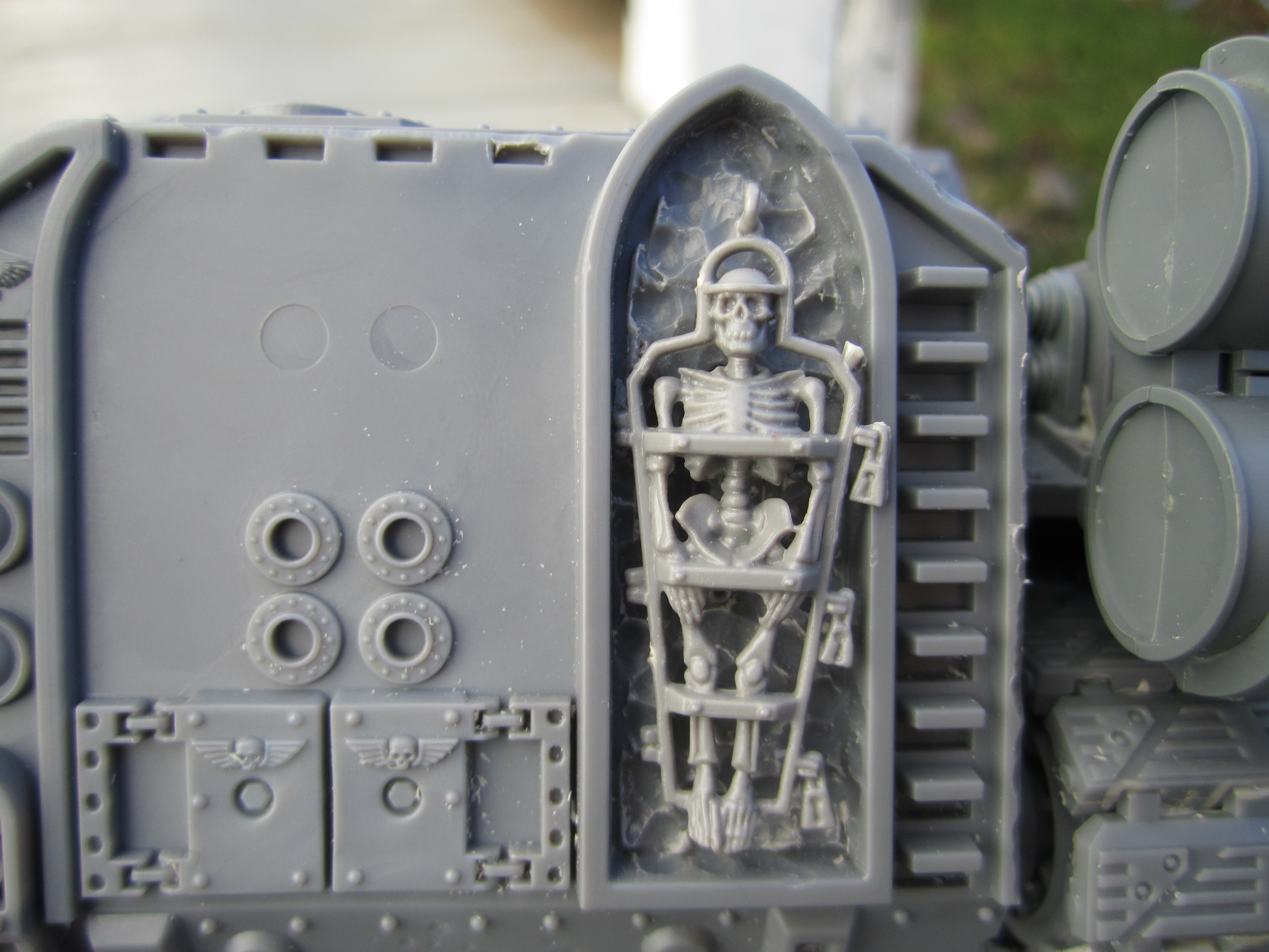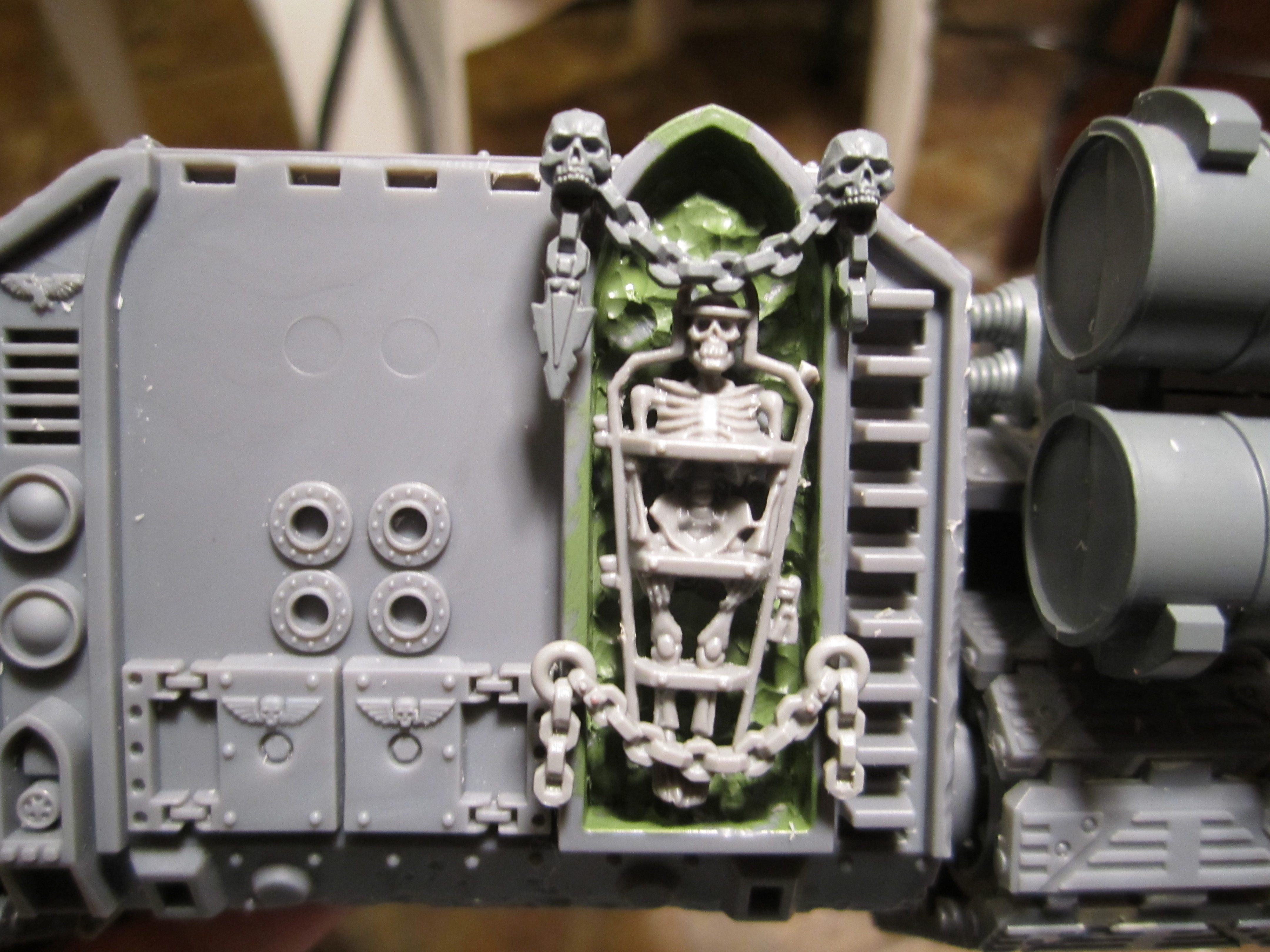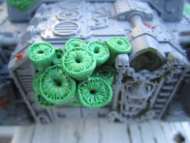 Then the grill. I was/am sculpting the beginnings of a toothy grin onto the front assault doors of the Raider. I am torn on a name for the raider but having been thinking of calling it Nurgles Maw. The bells that are hanging along the front from chains ring with the sceams of the dying and lost. The forgeworld doors, what can be said but thanks FOrgeworld. Your products are awesome. Love em.