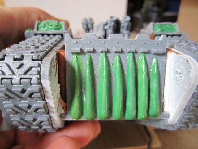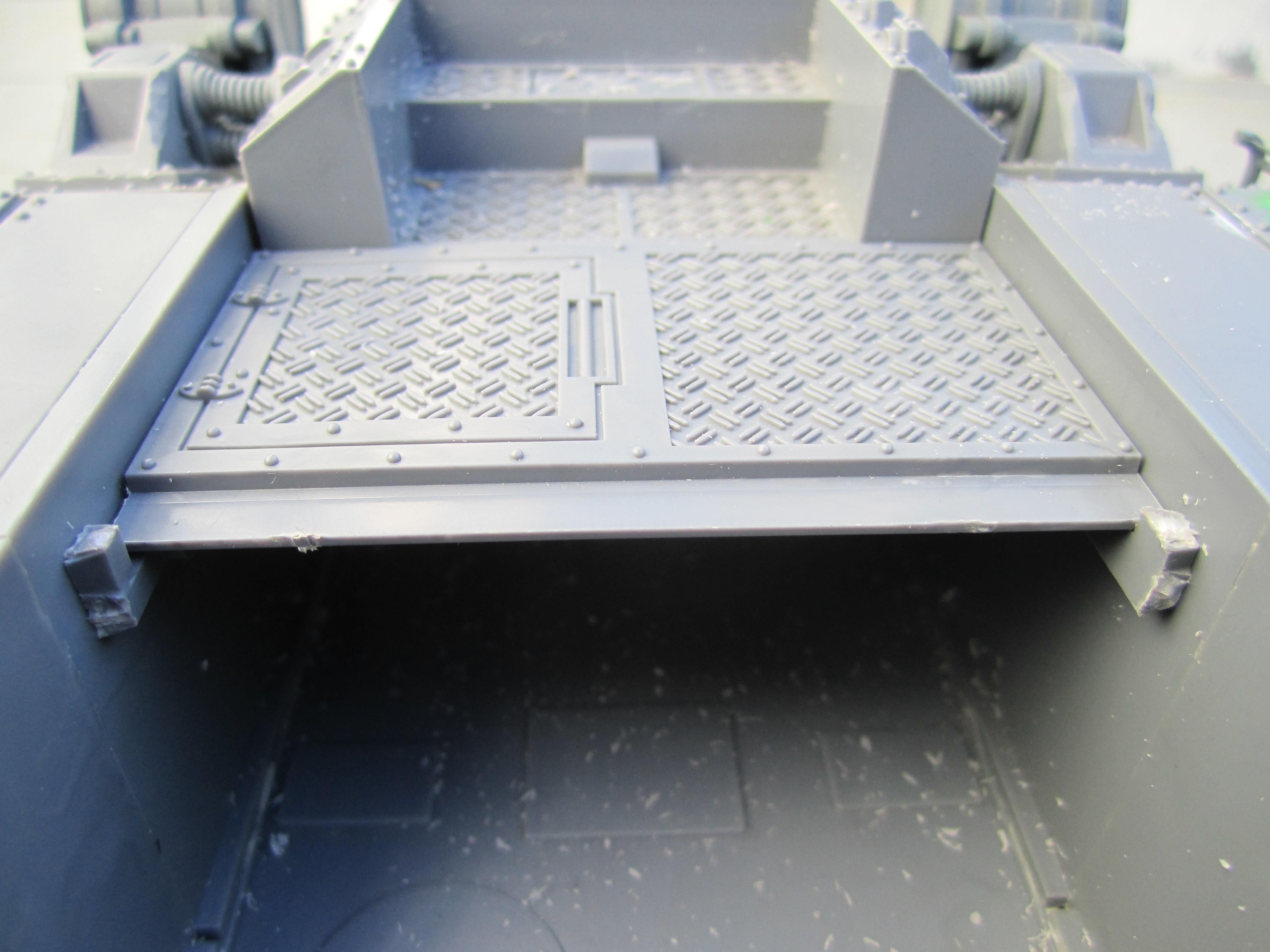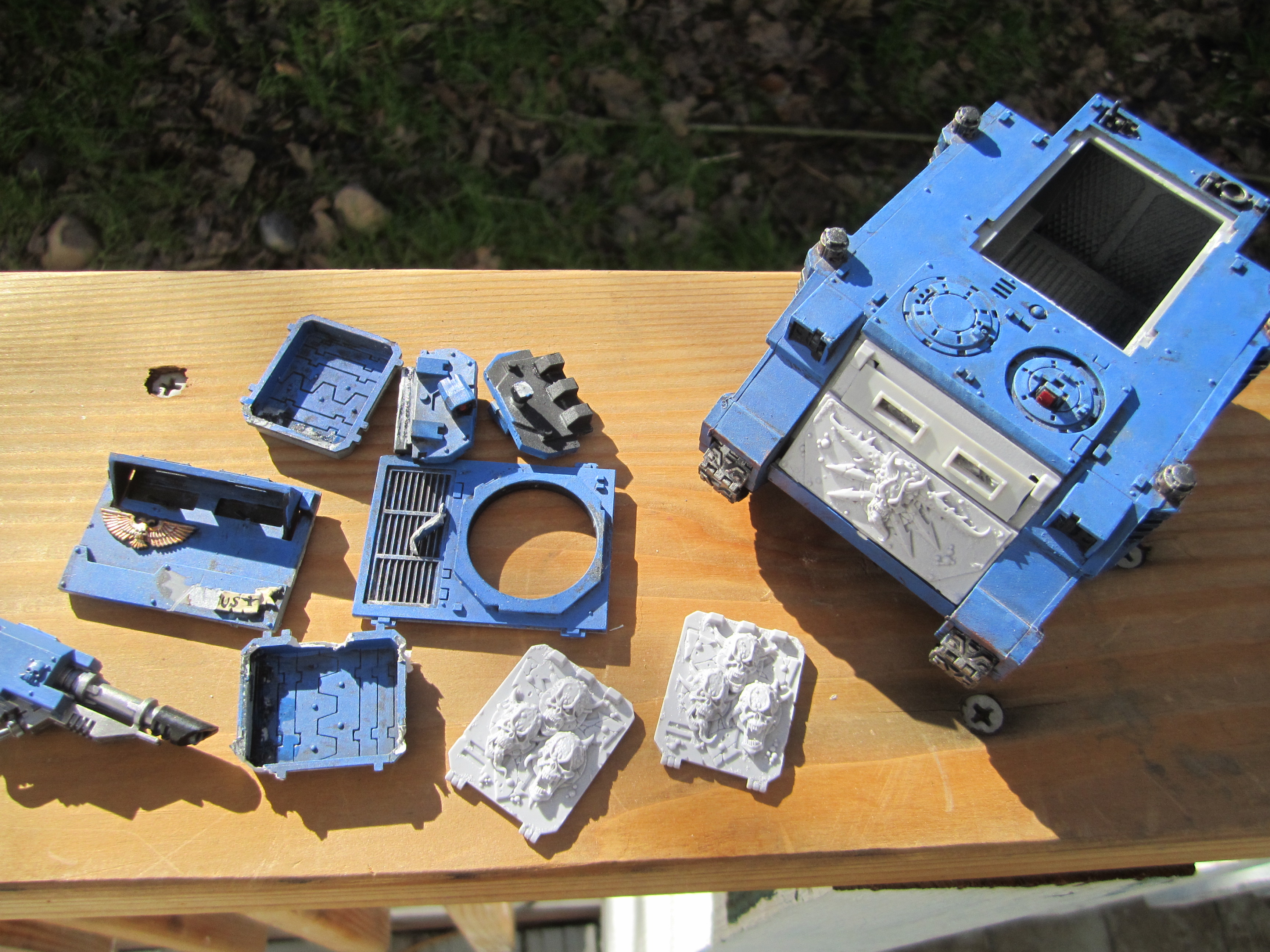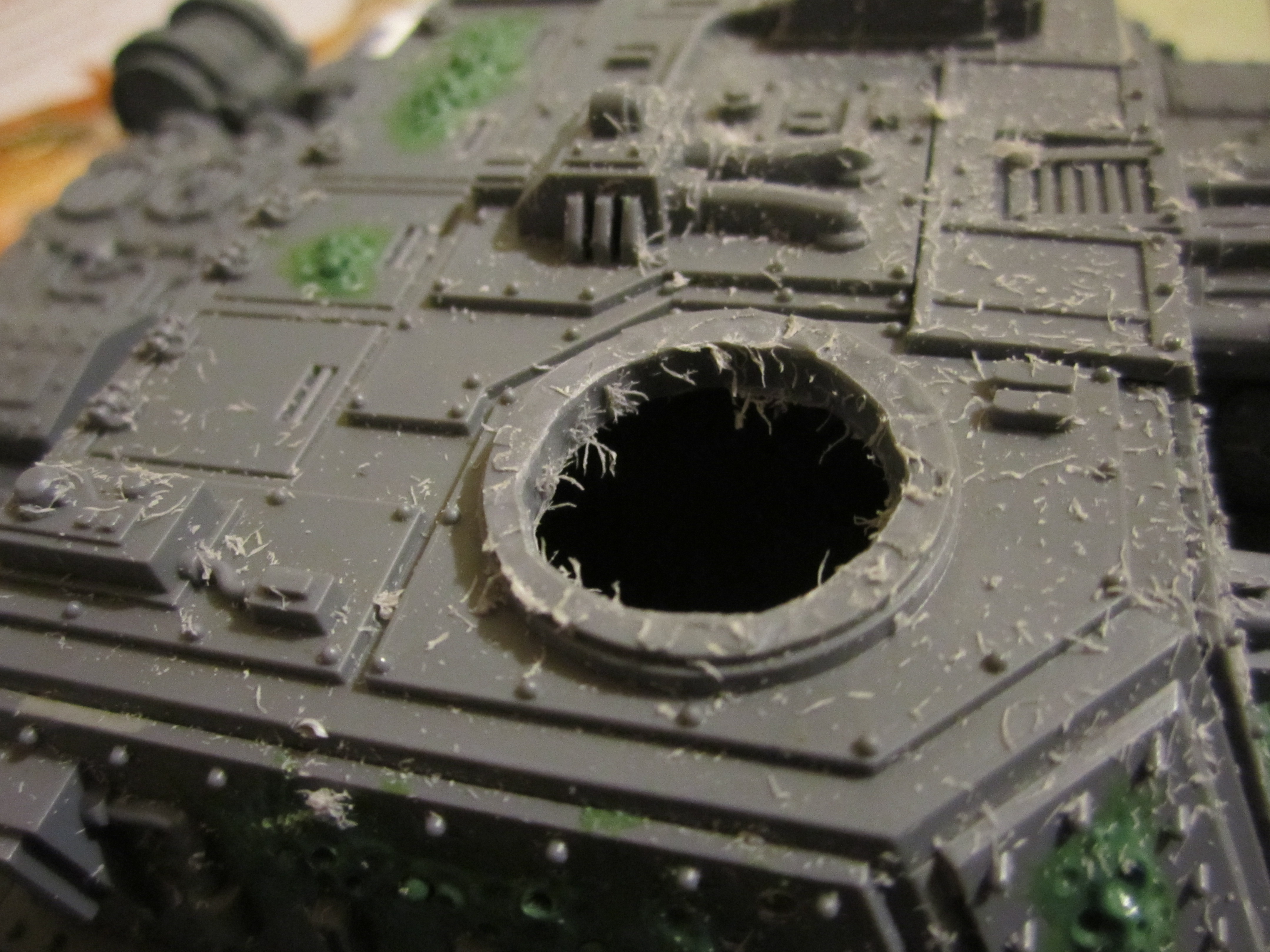 also after much debate mentally i began greenstuffing the interior of my land raider. Drilled millions of holes as well to complete the multilayered decay look. No landraider would be complete without a full resculpt of the exhaust stacks at the back of the vehicle so i cut those off with a hot knife and then scraped off much of the grill on the assault ramp, prior to Greenstuffing a set of huge teeth on the front. Thats gonna help set the whole model apart from the rest. I am also going to string some cables down from the engin and have them hanging around on the inside of the hull. I thought about GS. spikes coming up through the floor but ... what a pain in the butt GS the texture of the floor into peeling back plating would be so i figured i already have enough on my plate for now.
