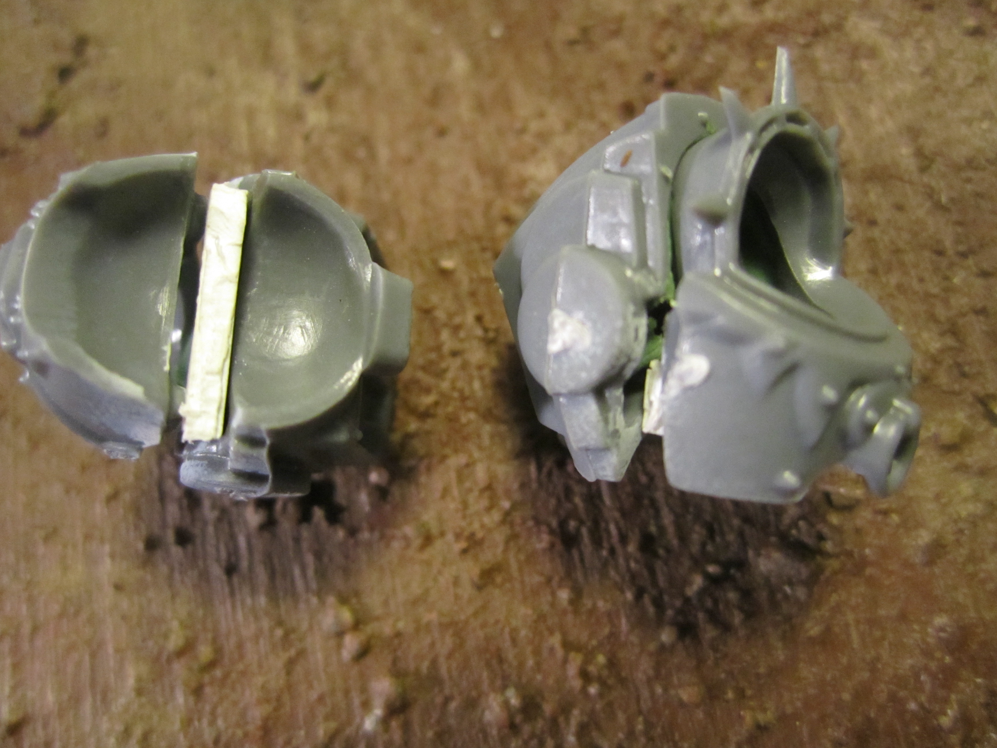 The torso are widened front to back by inserting a plasticard slip between the front and the back peice of the torso. This slip i glue in place to hold the two torso halves about 2mm farther apart. GS fills the crack that was formed in this process. This is partially visable in some of my pics on the preceeding page.