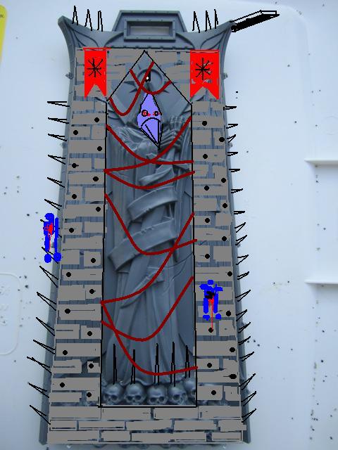 I am then going to have ample chains dangling and chaos icons here and there along with banners of corruption to suitably chaosify the remains. In the pic below, the black spots are spikes faceing the viewer, the red scurving lines are chains, and the plank stickin off the top is to send loyalists to their doom from.