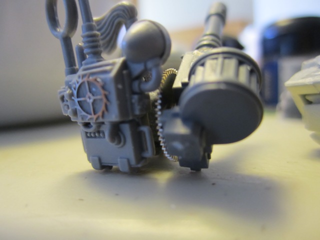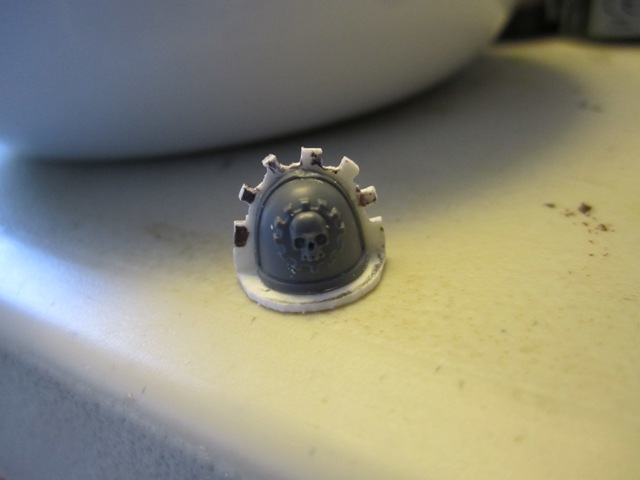 The plasticard I used here is the thickest I have really used. Probably 2mm. This builds up the shoulder pads considerably. Then under the shoulder pads i glue regulare space marine pauldrons. These I glue so that the bottom of the pauldron, which the marine arm would be protruding from normally, is glued to the cresent on the side of the terminator torso which the arm ordinarily attaches too. This creates an even broader shoulderspan for the oblit.