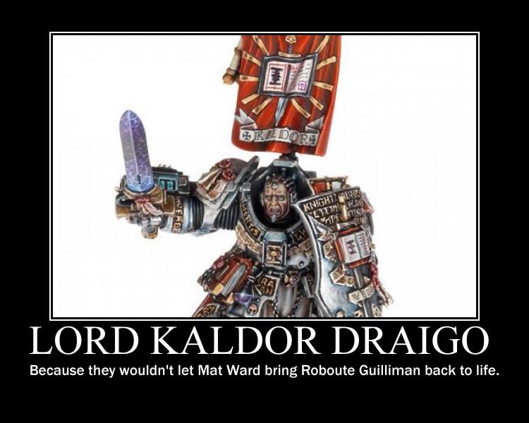 Basically Im curious as to whats going on at GW hq as this seems to be such a radical departure from everything theyve done so far, to summarize some of the leaked fluff Lord Kaldor Draigo is famous for killing a daemon prince in his first combat action, banishing daemon primarch Mortarion back to the warp, somehow carving the name of the previous supreme grand master Janus into the heart of said daemon primarch, single handedly holding off a daemon horde for two days in real space, killing a daemon prince with a broken sword, Killing one of Khorne's strongest bloodthirsters with little to no weaponry, taking said bloodthirsters axe and reforging it into a sword for his own personal use USING HIS MIND, slaying 6 of Slaanesh's chosen daemonettes, setting fire to Nurgle's garden and slaying countless daemons whilst being trapped in warpspace.