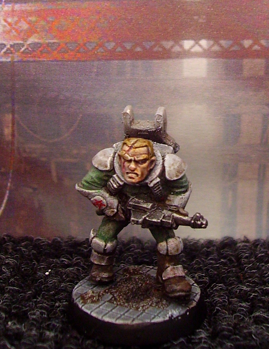 Dolf "maximum" Maxamillian. Dolf likes to have the maximum rate of fire, hence his nickname. His other hobbies include grunting enigmatically, giving people the 1000 yard stare and scowling. While the other mercenaries believe Dolf to be nothing but a mindless combat animal he in fact has hidden depths. He is wracked with complex emotions over his dead PDF comrades and family. His planet was wiped out by the Imperium after they were deemed to have been corrupted by zenos. Dolf now has a grudge against the universe and hopes to loose himself in heavy gunfire and bloodshed.