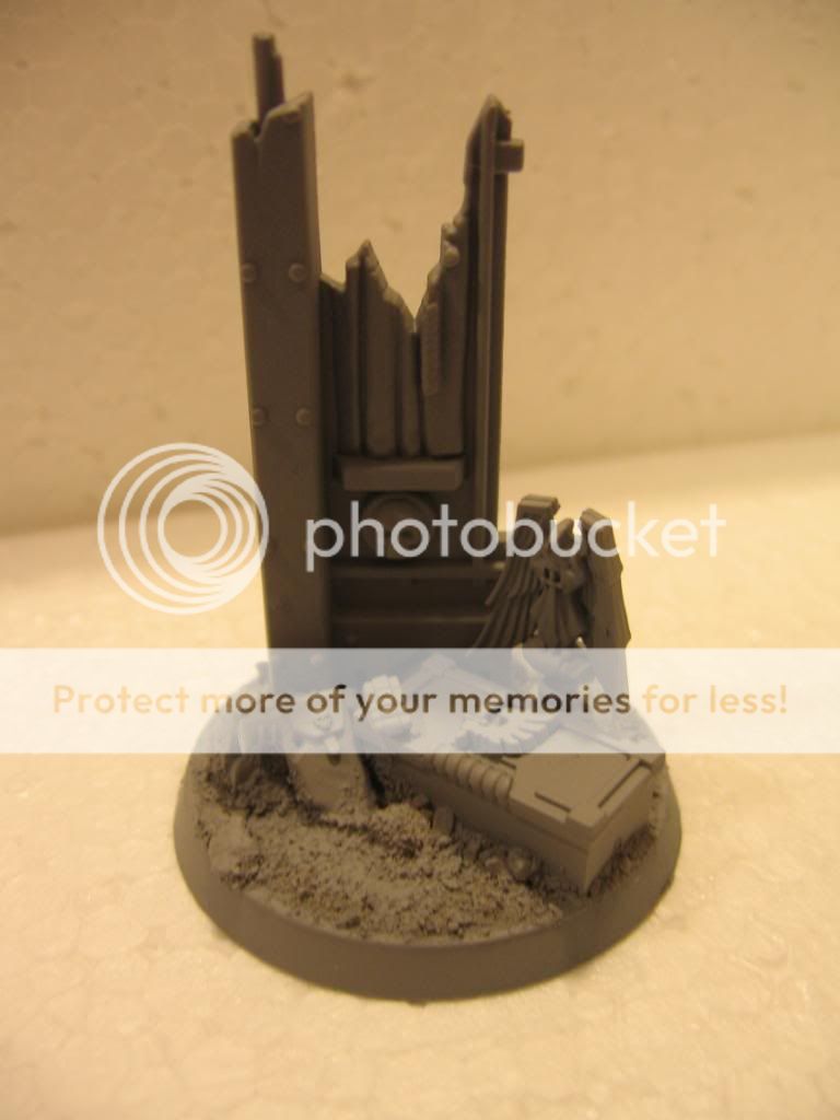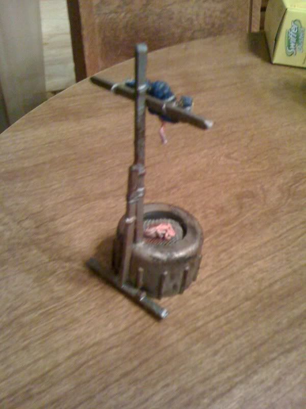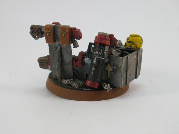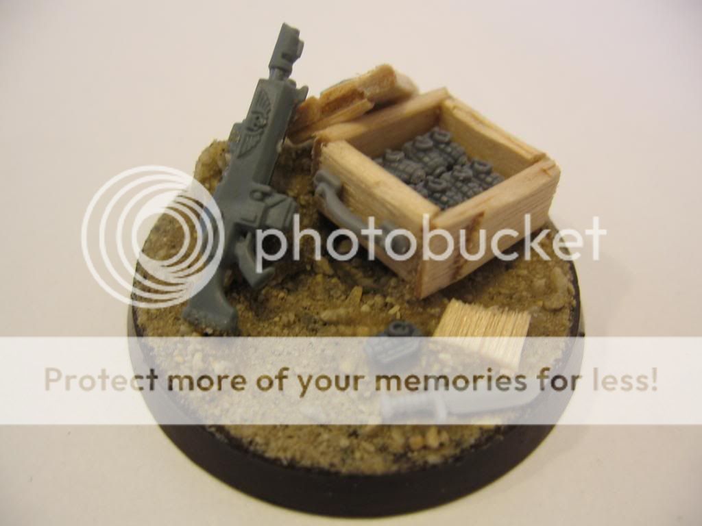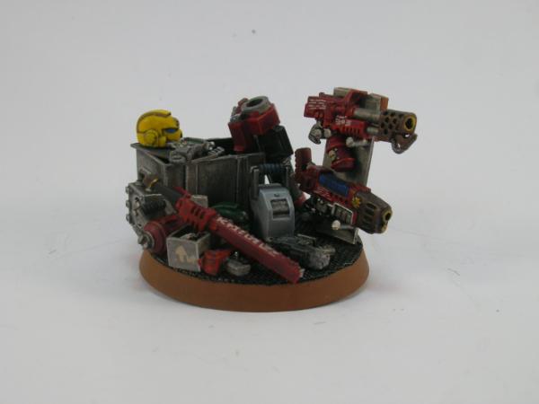 As it says on the can! Also, if you can, tell us what it is and what you used to make it. I'll start it off. A shrine commemorating a fallen Dreadnaught. Made with a Space Marine biker banner pole, a Dreadnaught sarcophagus, purity seals, Space Marine head, a Bolter and some stones. An Imperial Guardsmen memorial. Made with a lasgun, Space Marine combat knife, and IG helmet, a purity seal and some stones. An Abandoned sniper's post. Made with a SM scouts sniper rifle with its stand, ane SM scout binocular, a satalite dish from the Sm vehicle frame, a purity seal, a skull from AOBR frame and some stones.