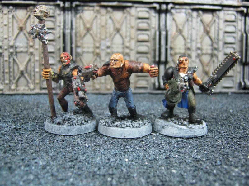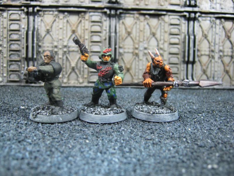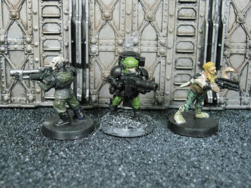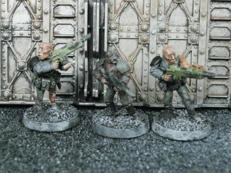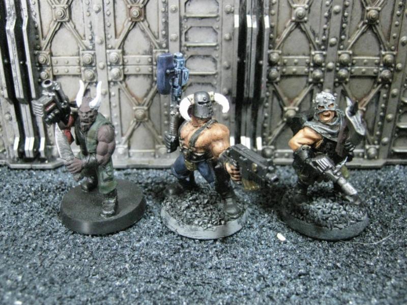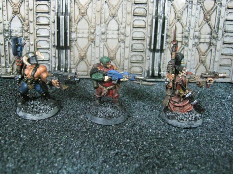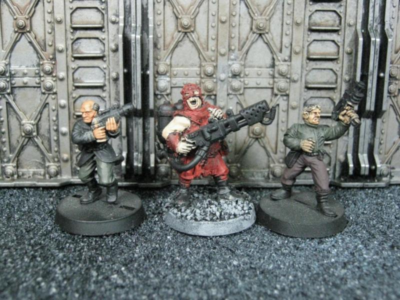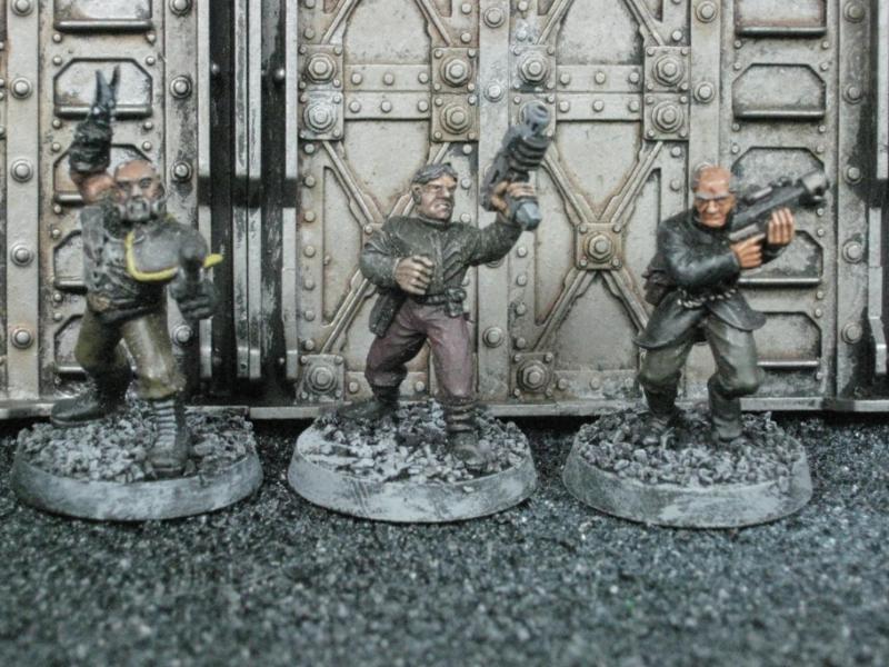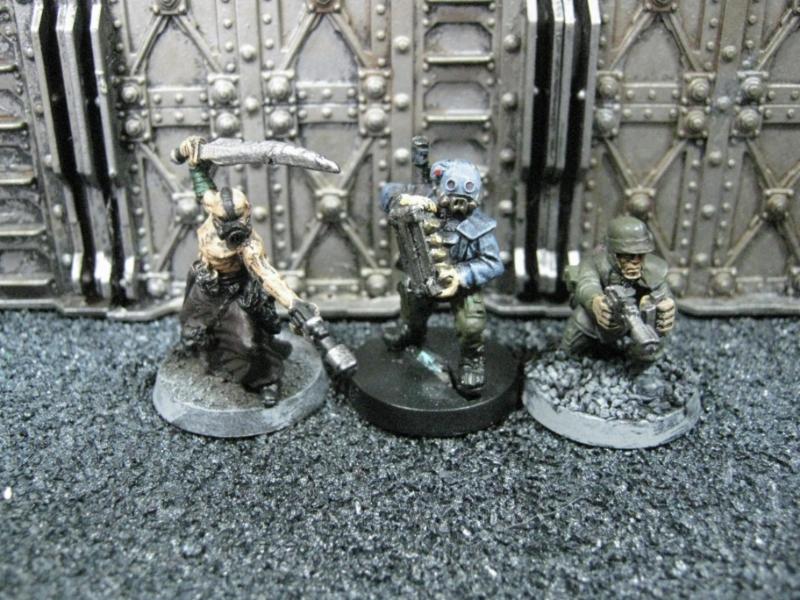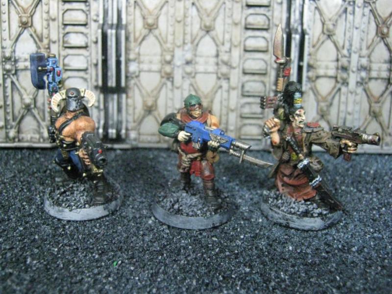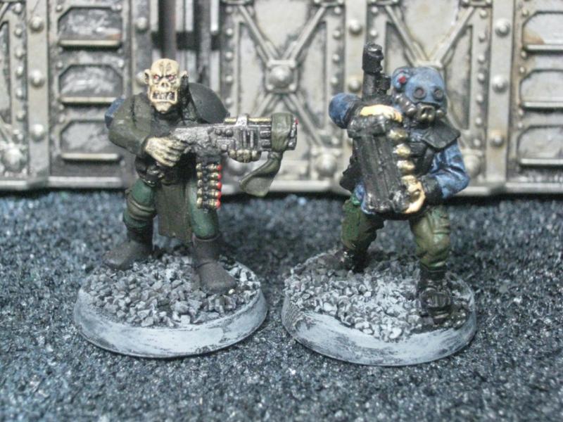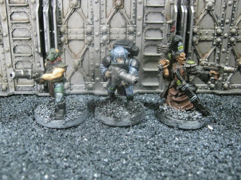 The next group consists of two old Necromunda Orlock plastics (left and middle) and the Cadian Autocannon assistant gunner model from the old metal range. They are all sporting PIP heads.