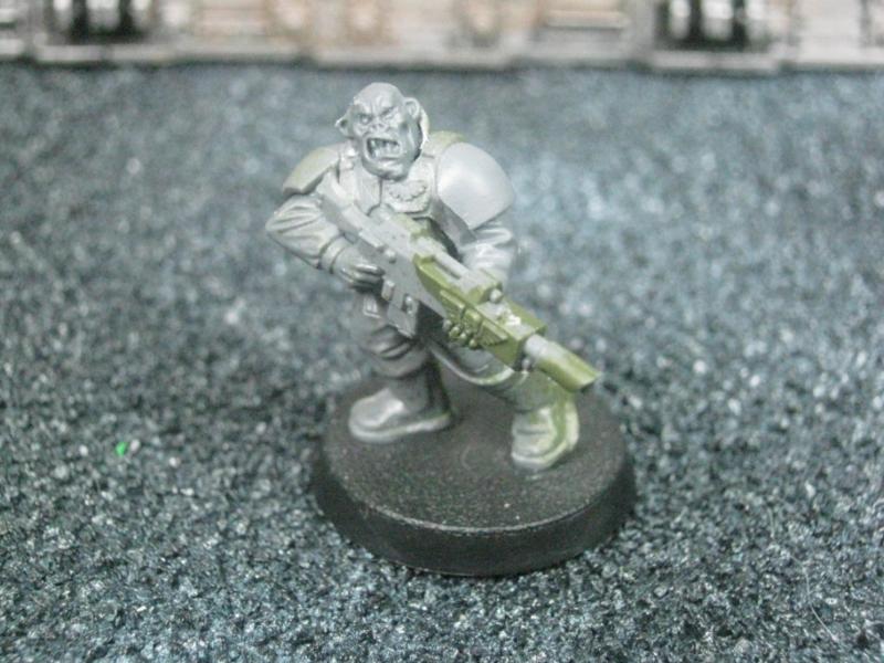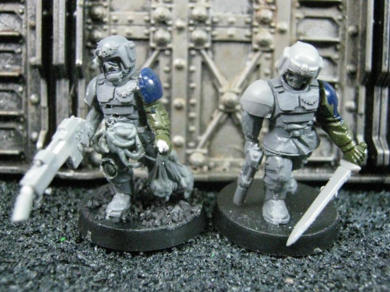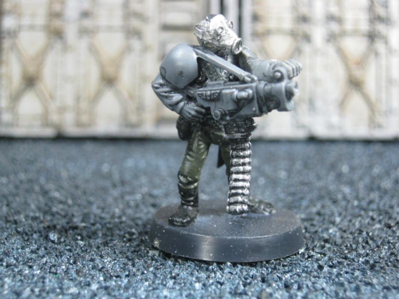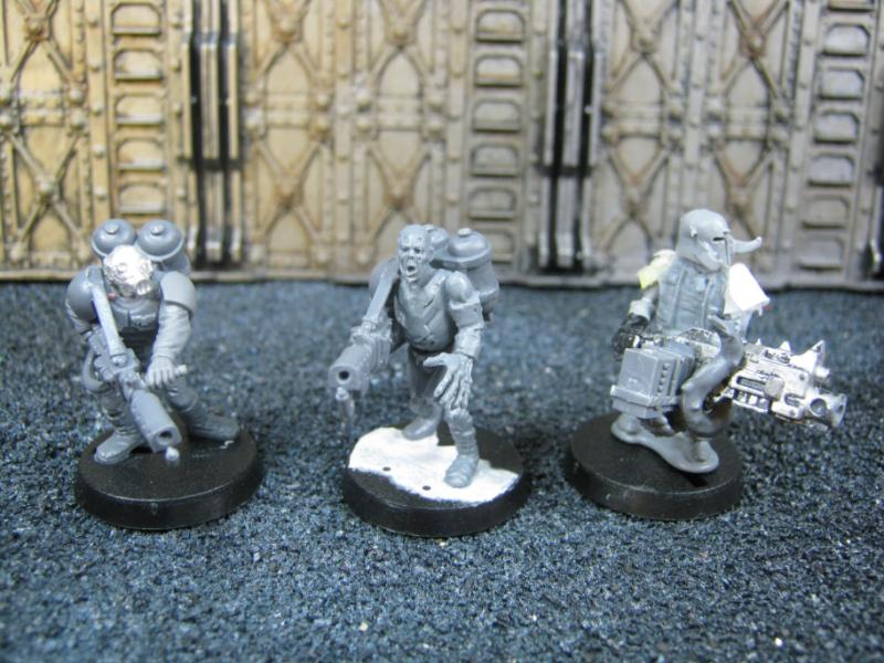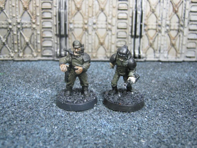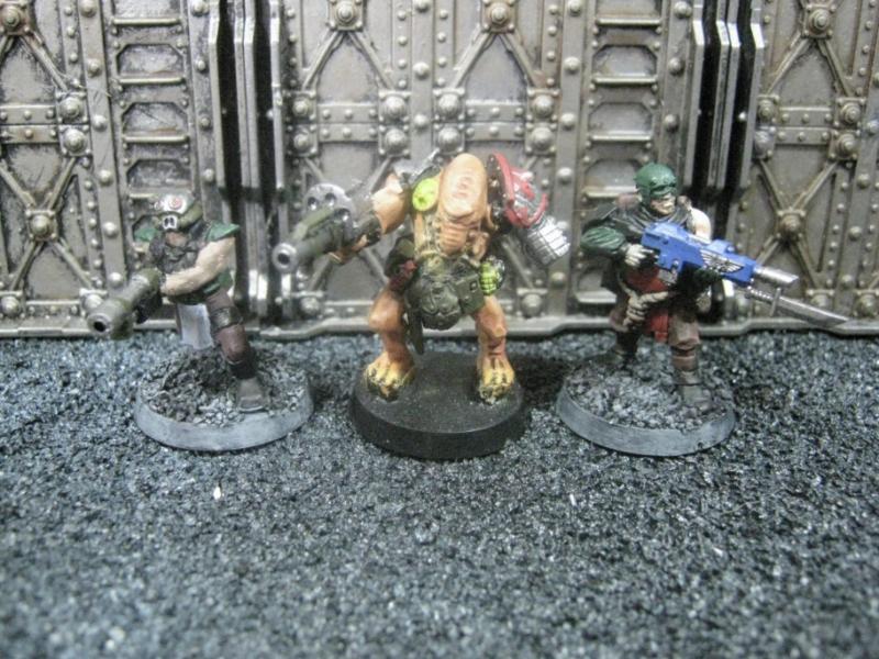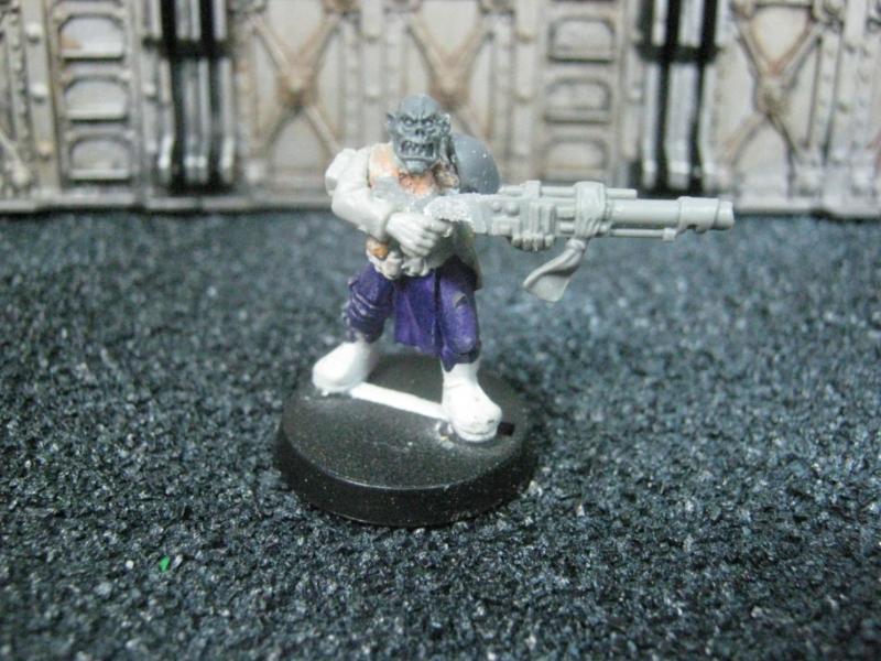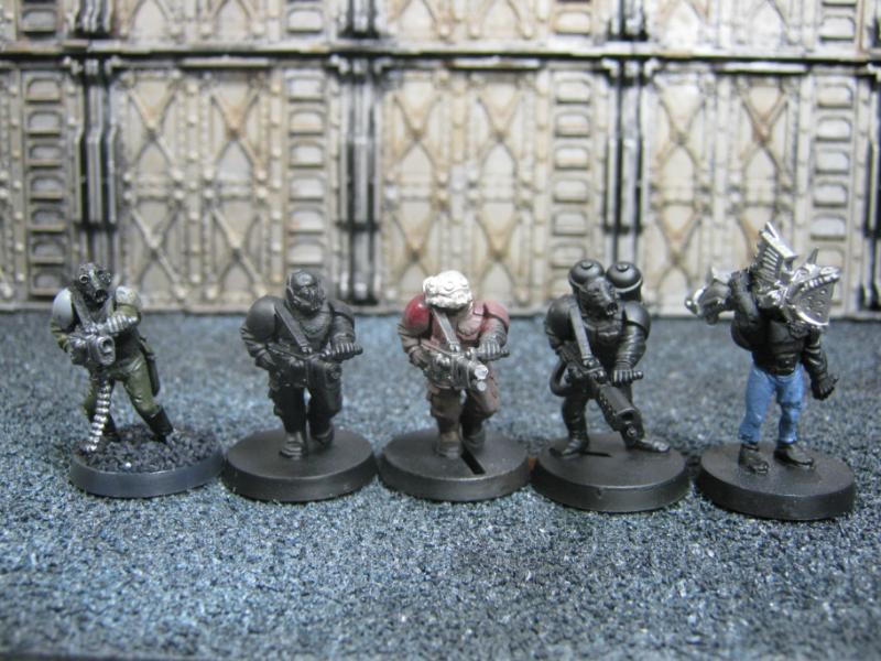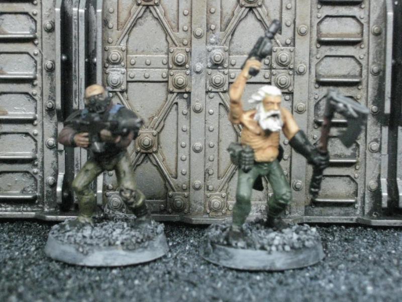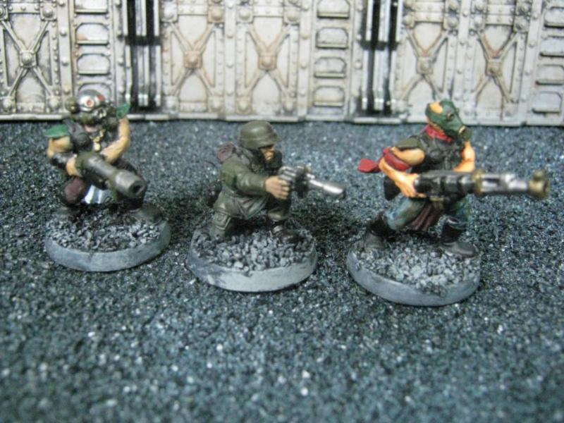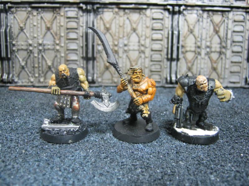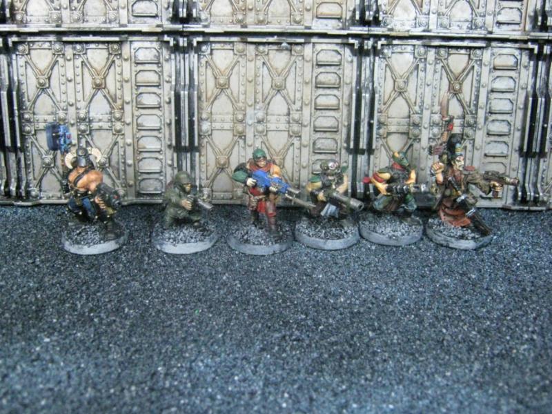 The next group consists of two old Necromunda Orlock plastics (left and middle) and the Cadian Autocannon assistant gunner model from the old metal range. They are all sporting PIP heads.