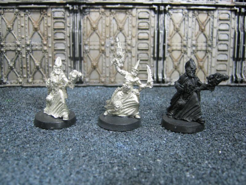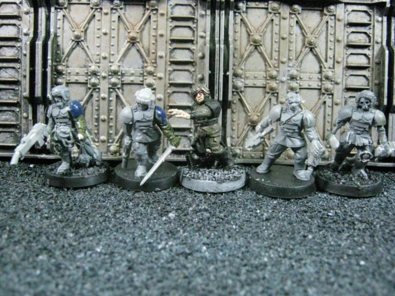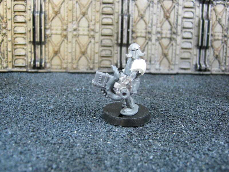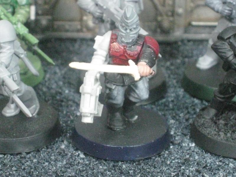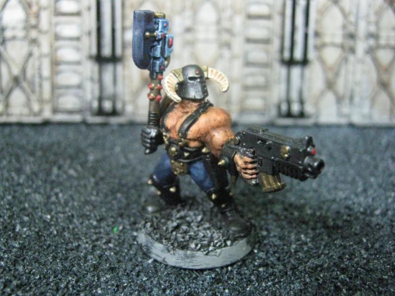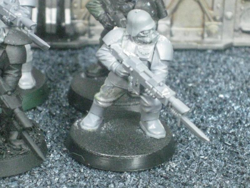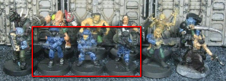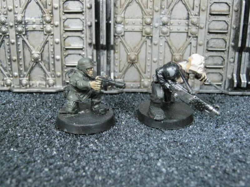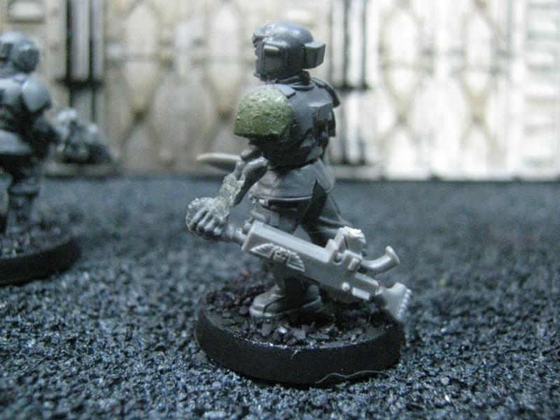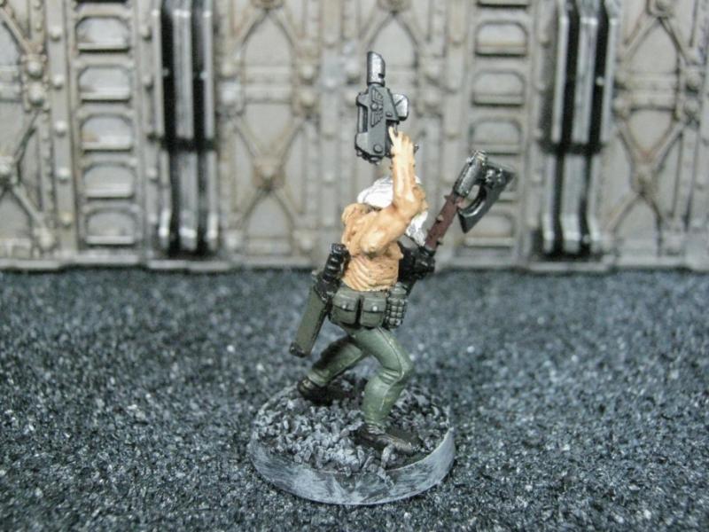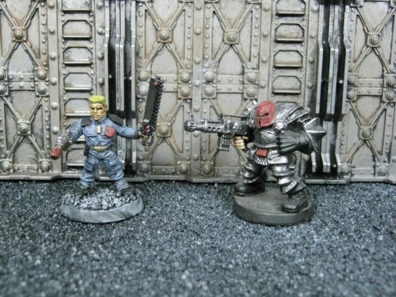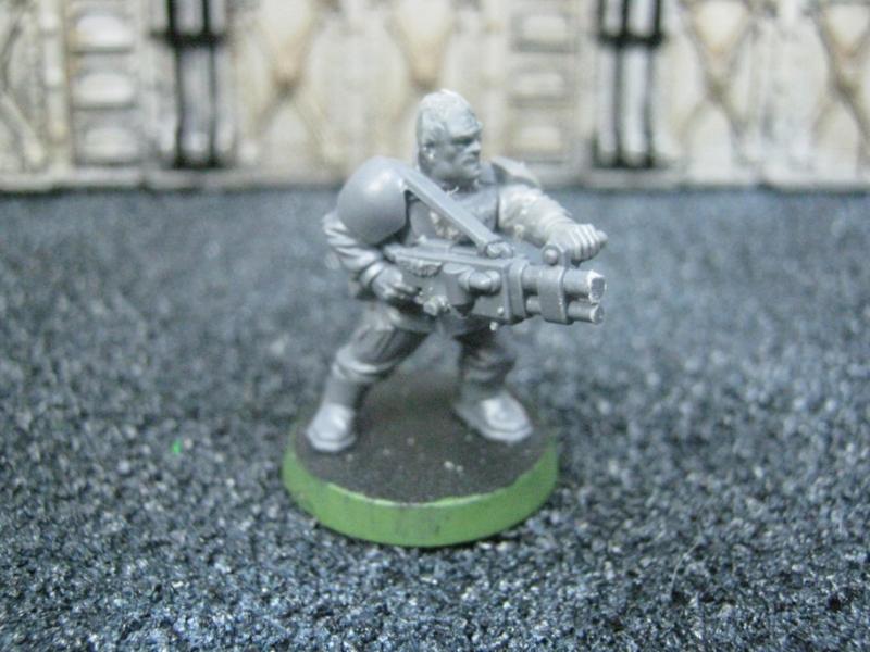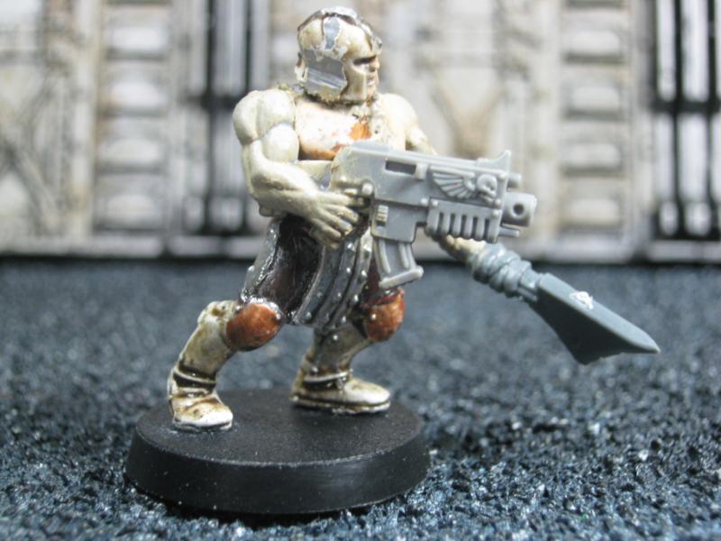 The next group consists of two old Necromunda Orlock plastics (left and middle) and the Cadian Autocannon assistant gunner model from the old metal range. They are all sporting PIP heads.