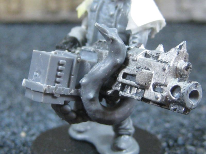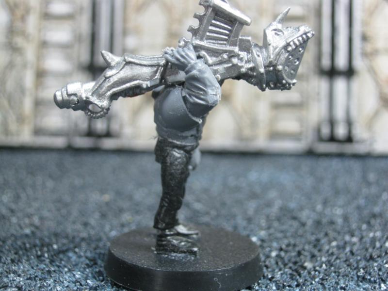 My first genuine Chaos influence in the Cult so far. The Beastmen heads were from leftovers I had from a bitz auction on eBay. The WFB Zombie bodies (left and right) were donated by a friend of mine. They are pretty stock except an old Bolt Pistol (left, counts as Autopistol as far as I am concerned) and the new laspistol / chain sword from the current IG plastics. The Beastman in the middle is on a Catachan torso / legs. He has an Orlock Bolt Pistol and his left arm is from the WFB Chaos Marauders set. The knife is an old Space Marine accessory.