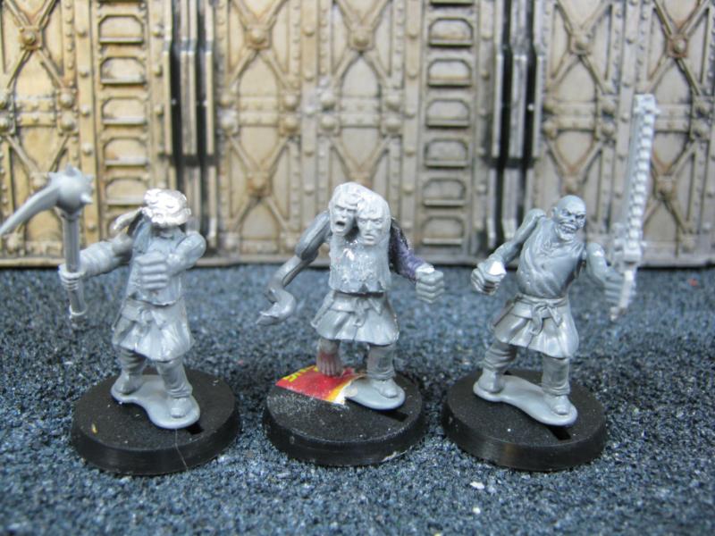 More WFB Zombie bodies donated to the cause, plus another old Chaos Cultist. Model in the middle has a tentacle arm, another indication that there might be more to this uprising than originally thought. The heads are (L to R) from an old set of models based on the movie Lawnmower Man, WFB Empire, and PIP. Weapons are Necromunda, except right which is from a Chaos Cultist I converted into something else.