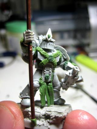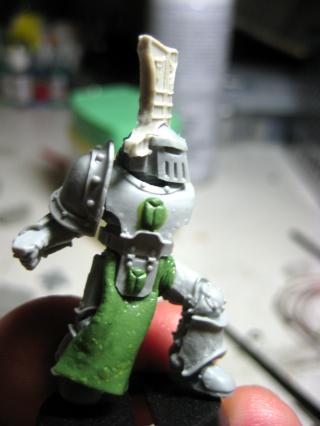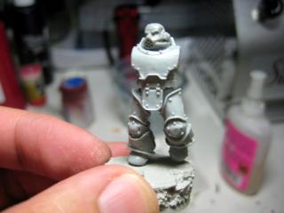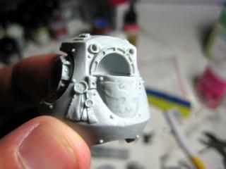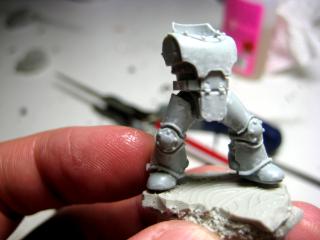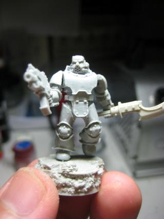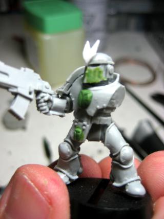 Here you can see the bolter a bit clearer- as well as the GS all over his face. I’d like to make a few smooth-helmeted guys, so that’s a test. I’ve sanded it past this pic, but didn’t add it to this post. Also, he has a variation of Quickman’s head thing, which I’ll probably supplement with extra greenstuff, as the thickness of it is actually intentional, not a lazy attempt to copy the previous helm ornament.