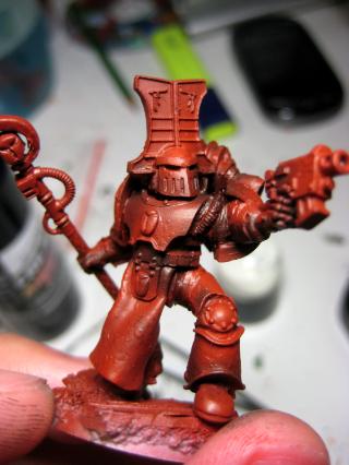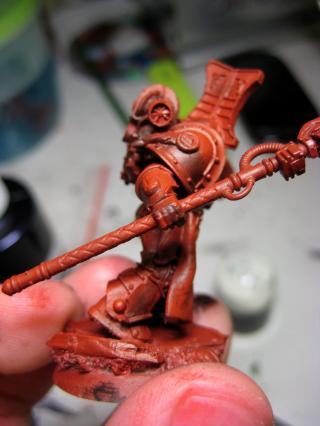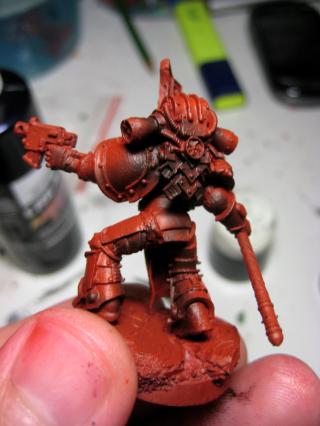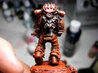 And finally, starting up the metal. Coat of Boltgun metal before slathering on the Badab Black wash. I'll be adding a bit of tinge with watered down Gryphonne Sepia for my next session.