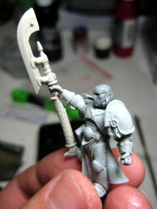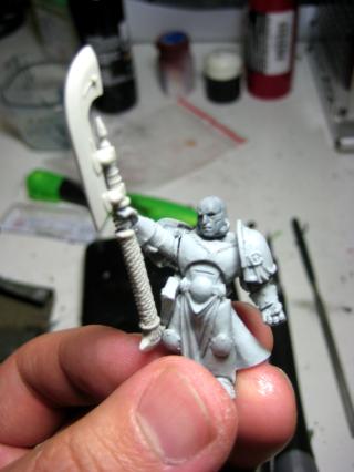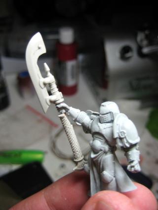 I decided to also chop the arm and re-pin it away from the body. I’ve got two plans for this guy: If I can work the GK glaive/staff onto his left arm, I can make him pointing, like a leader. If not, I’ll give him a bolter in that bent back right arm and go crazy on the model’s “true” left bolter-arm to make him firing off a fireball or something.