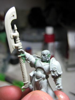 Right now I’ve got 3 (?) more guys awaiting (re)assembly and new headpieces after their bath. I’m also changing the banner bearer so he’ll be a bit lighter without the cross-banner. And then there’s the Emperor’s champion- haven’t decided yet what to give him, although I’m slowly moving away from the idea of a pony-tail. I might just go psychic hood, styled after those white ancient Egyptian headdresses.