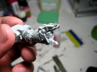 As you can see, I’ll be needing those GK glaives/Khopesh arms for this brother and the following. I’ve made it so that both hands are independent of one another, instead of the firm, two-handed grip on the bolter. This also represents the first glued Phobos-pattern bolter… and this brother’s lack of firing discipline, as he’s swinging it around like some kinda gangsta.