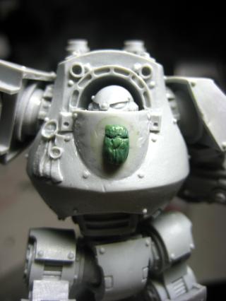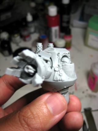 I decided to give him the beetle-tines... as the dread would NOT be very Thousand Son-like without them... As it was a bit larger, I felt like doing a bit of detailing on his ornament- that's the start of it.