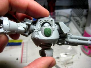 Right now, I feel there's a bit too much metal on him. I'll be doing his hip and knee gears, elbow/knee pads, and the skulls on his knuckles in gold (or alternate scheme gold fist with white skulls on it...) in addition to the standard gold accessories. The lascannons will probably be black for the detailing, and I might even try OSL on the power-coil areas towards the base of the barrels.