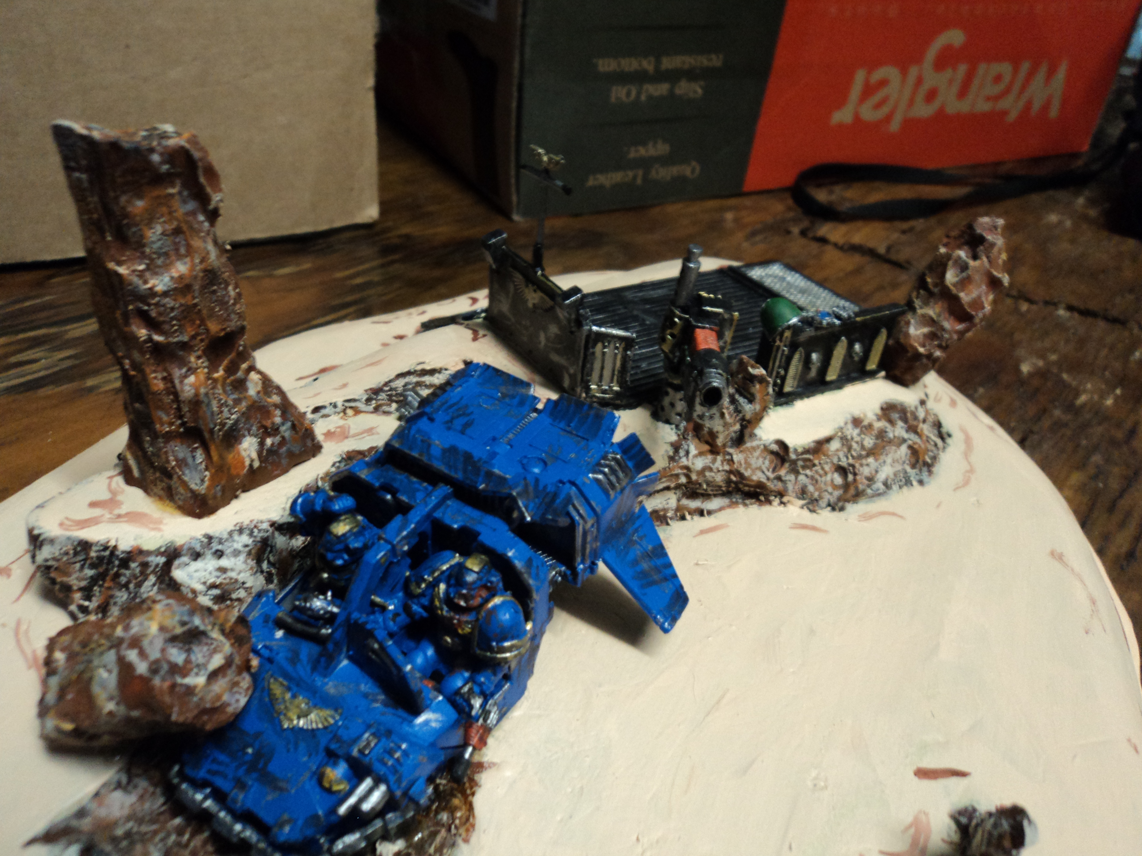 Contested Crossroads: A large area piece, only the middle or road portion of the terrain presents an open LOS down the table. Astartes gear litters the scene. Note the downed Landspeeder that had an unfortunate run in with a rock pillar and the turret-mounted Plasma Cannon against the makeshift bunker.