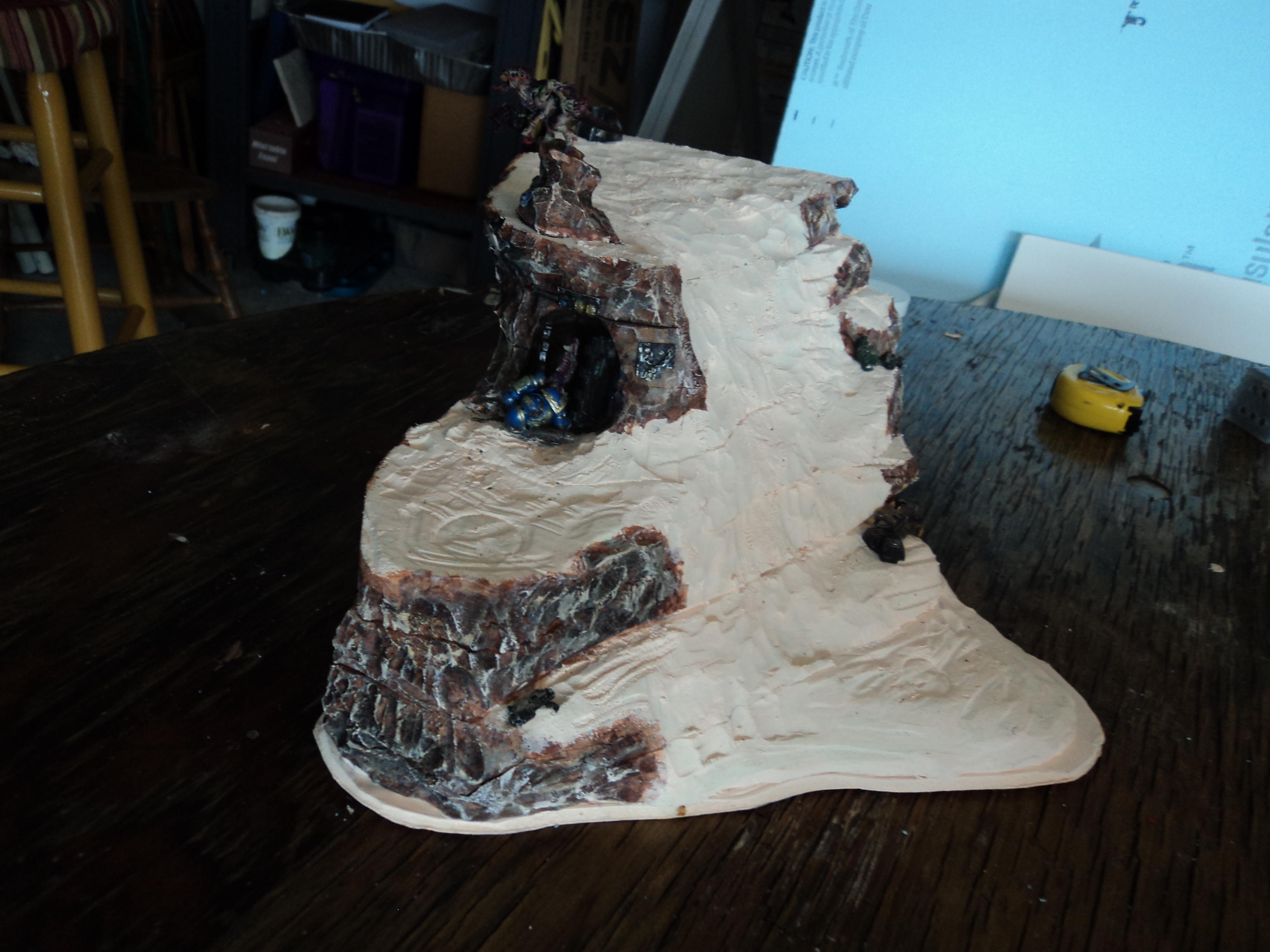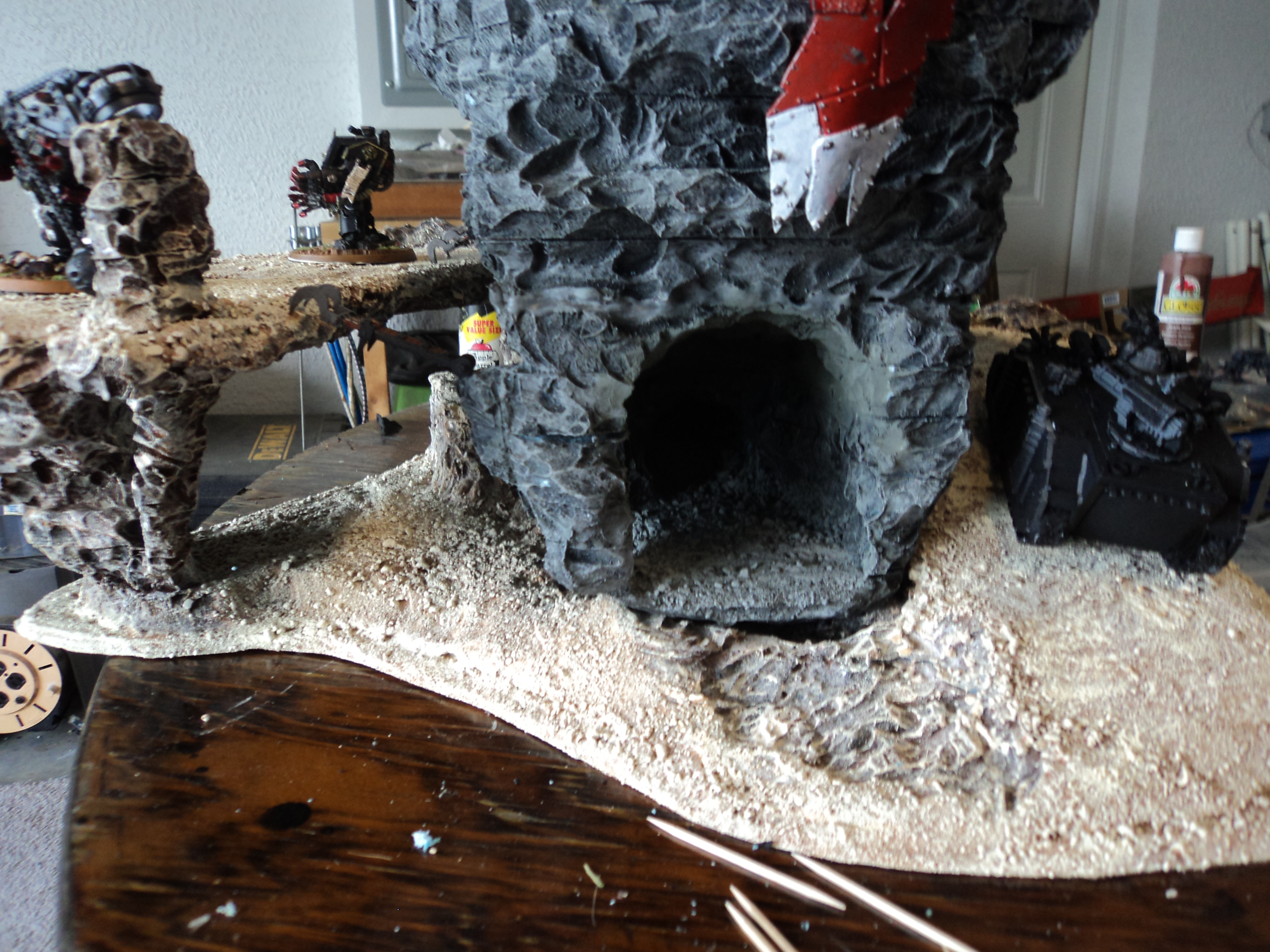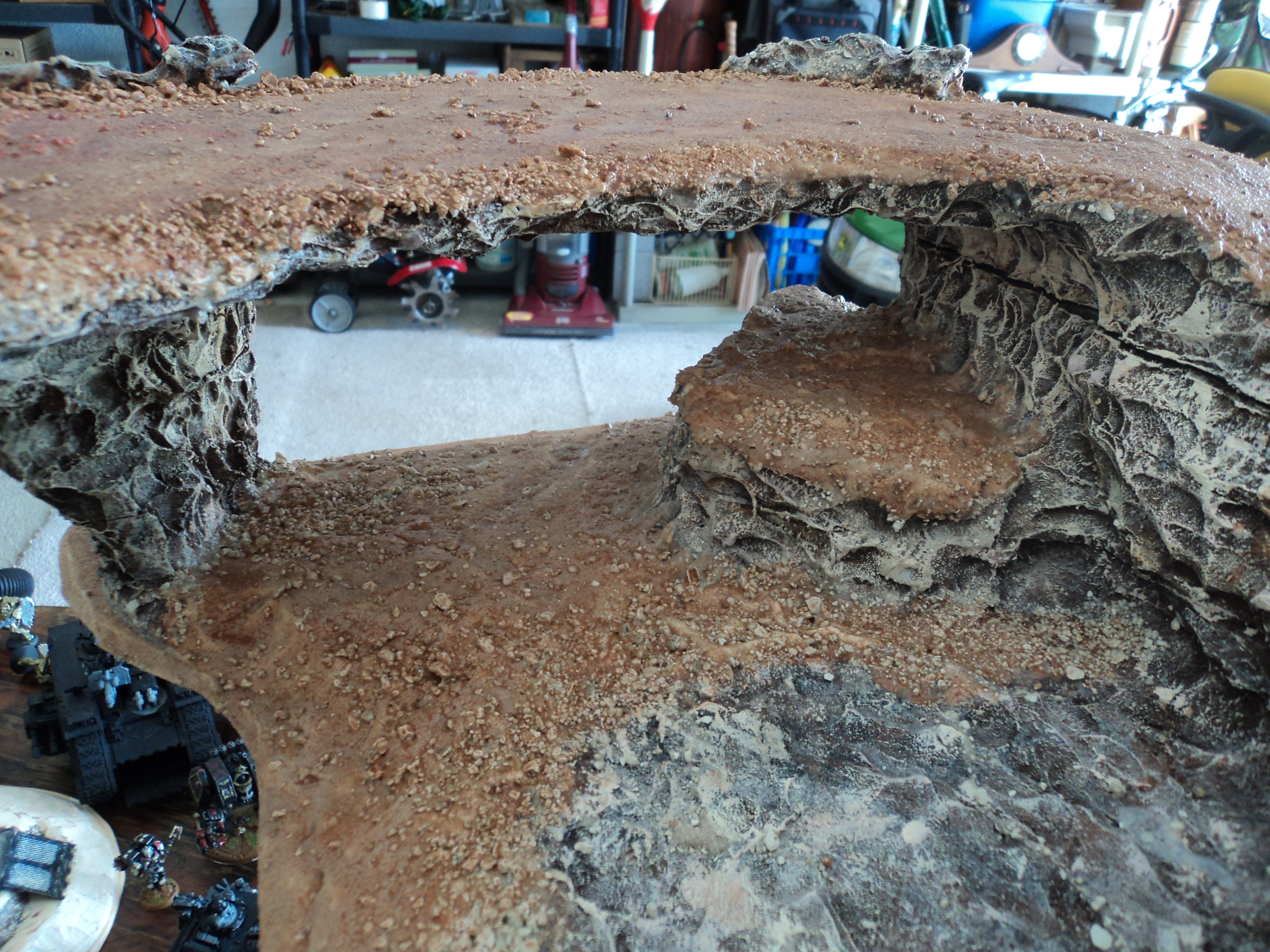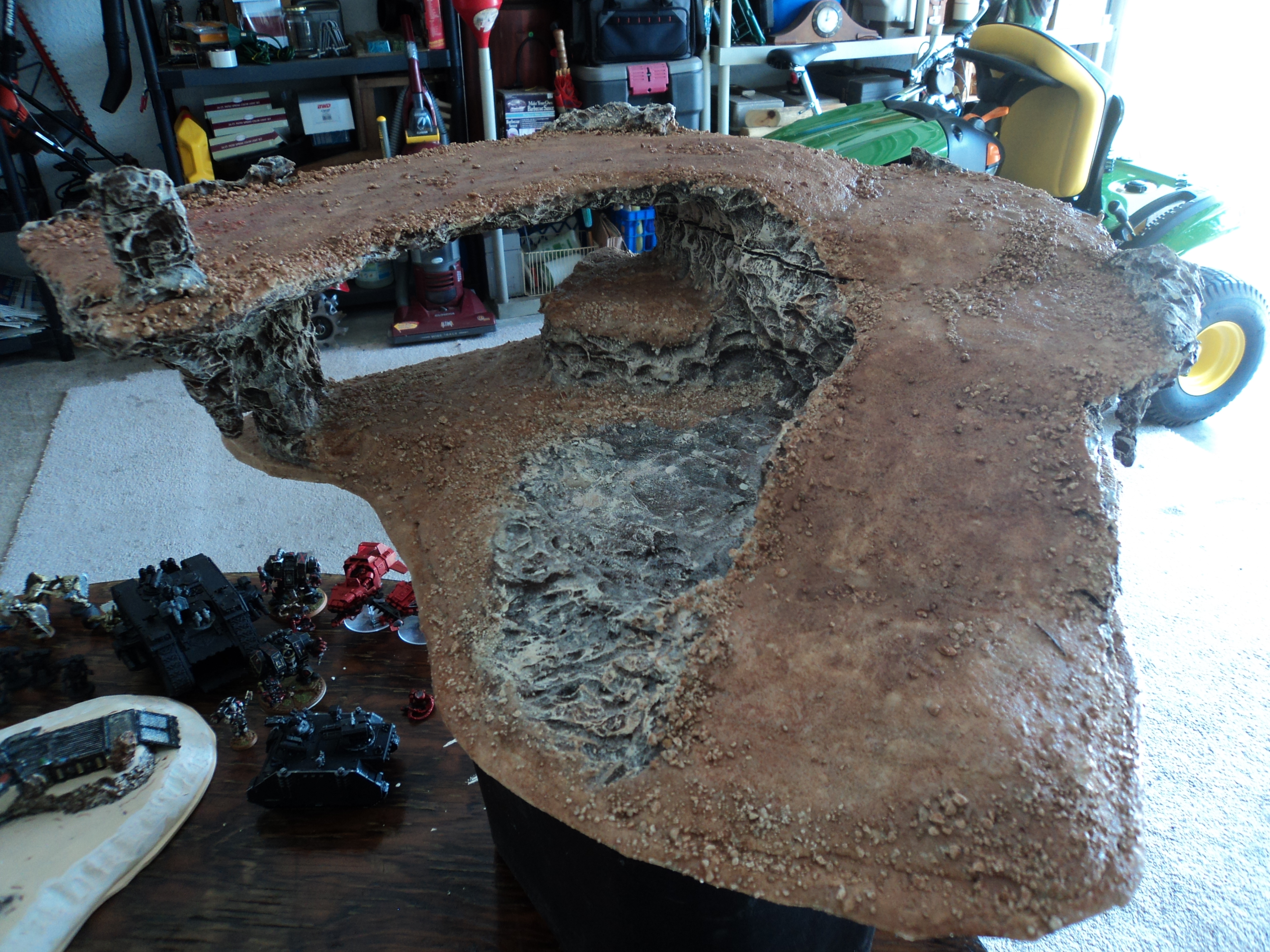 This piece is a sweeping rock formatiom that rises 3 levels. The interesting thing about it is unlike most multi-level terrain, a vehicle (albeit after a difficult terrain test) can ascend to the third level. I'm working on an optional bridge system between this and a few other pieces. The underside of the rock formation is bursting with burrowing nid monstrosities, and a Factory World looking tunnel entrance seems to have been the untimrly doorway to a Smurfs doom! A WIP, I look to touch up the detailed items, flock, and maybe smooth the hill a lil!