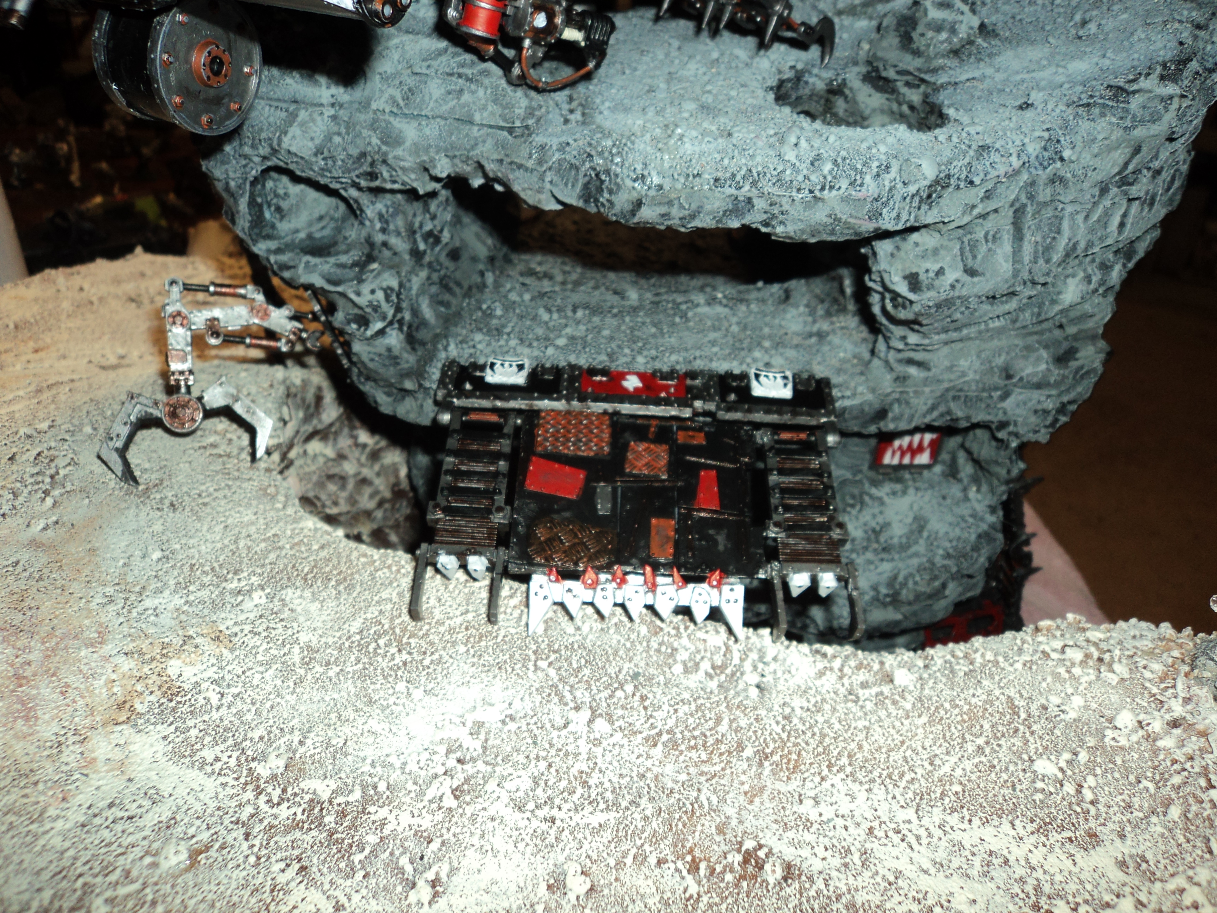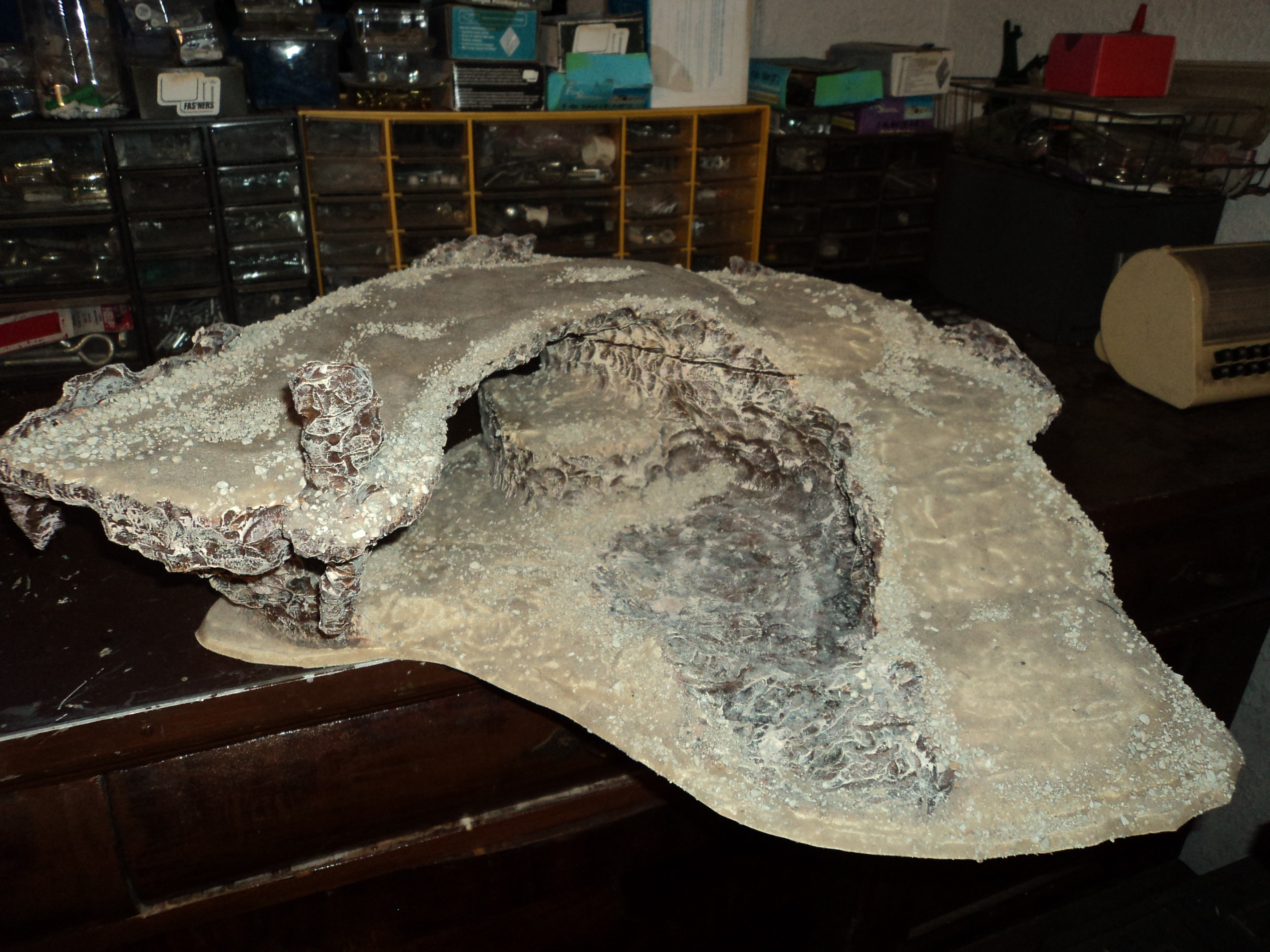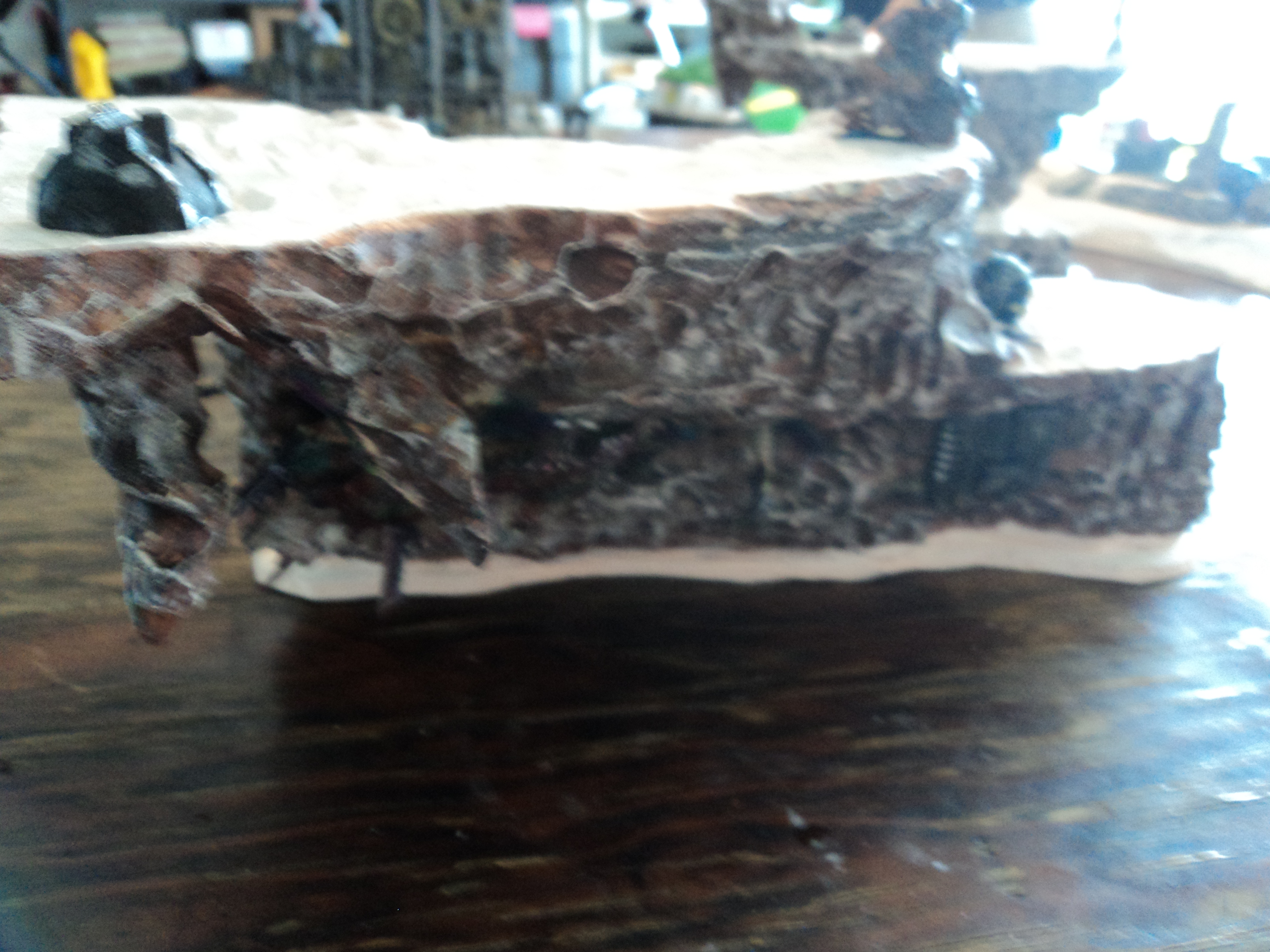 This piece is a sweeping rock formatiom that rises 3 levels. The interesting thing about it is unlike most multi-level terrain, a vehicle (albeit after a difficult terrain test) can ascend to the third level. I'm working on an optional bridge system between this and a few other pieces. The underside of the rock formation is bursting with burrowing nid monstrosities, and a Factory World looking tunnel entrance seems to have been the untimrly doorway to a Smurfs doom! A WIP, I look to touch up the detailed items, flock, and maybe smooth the hill a lil!