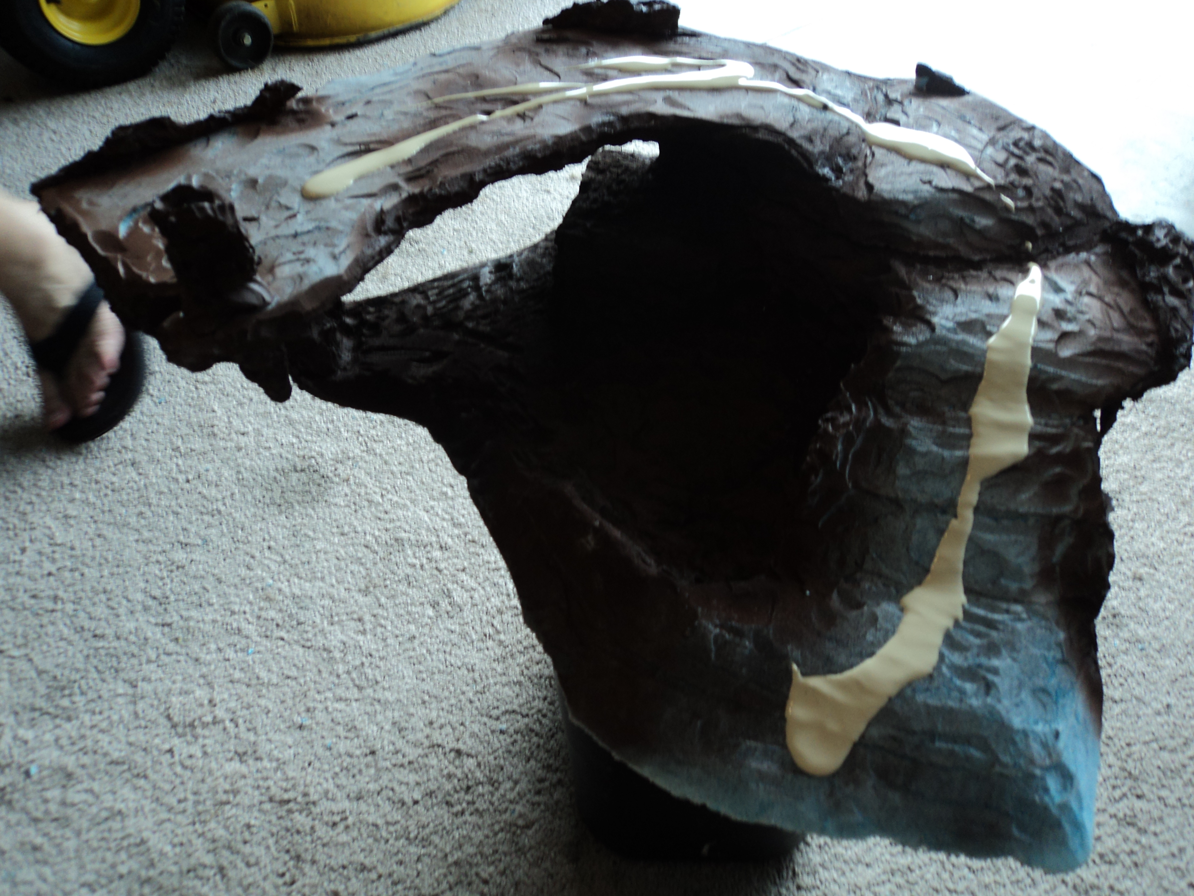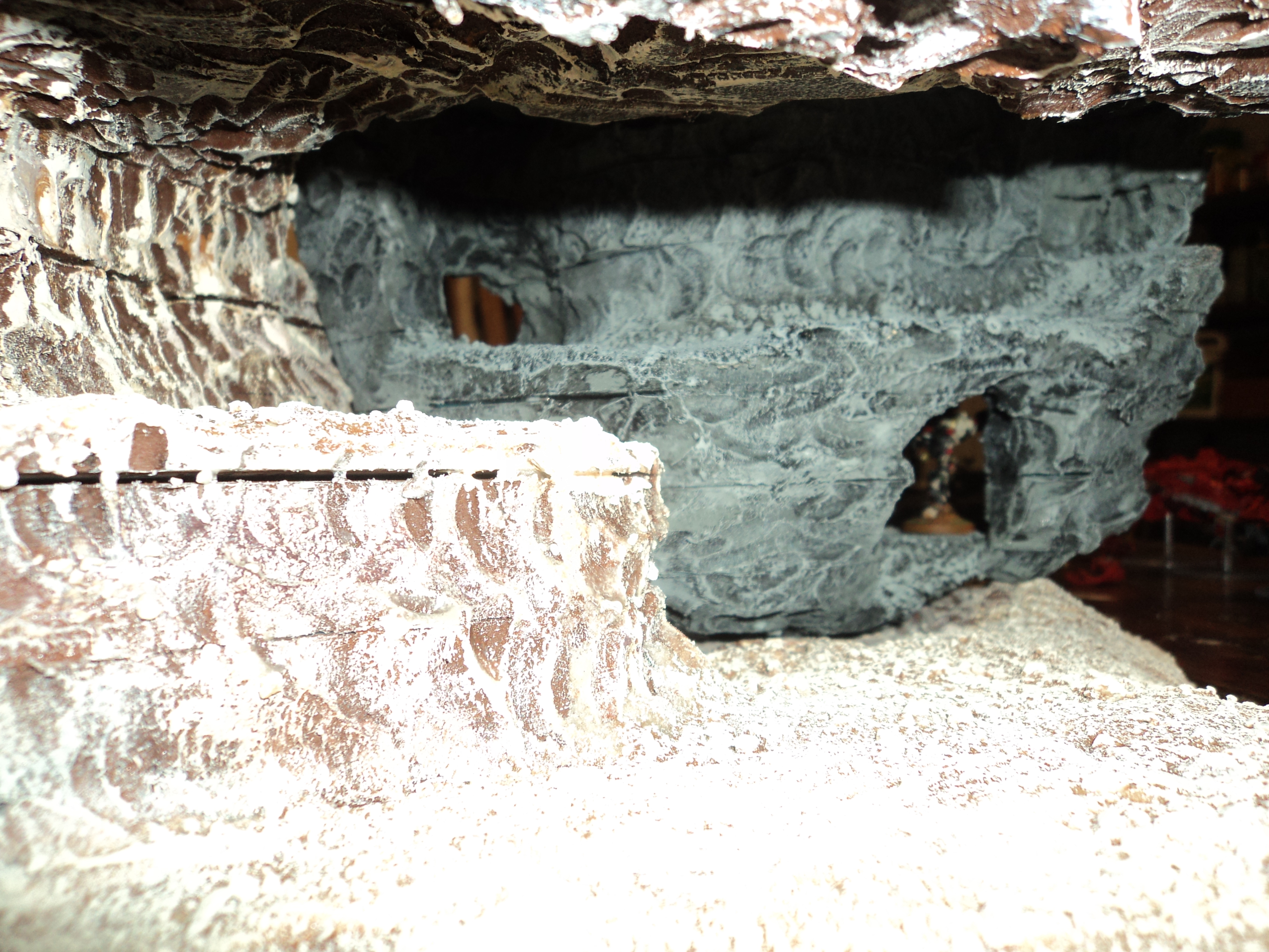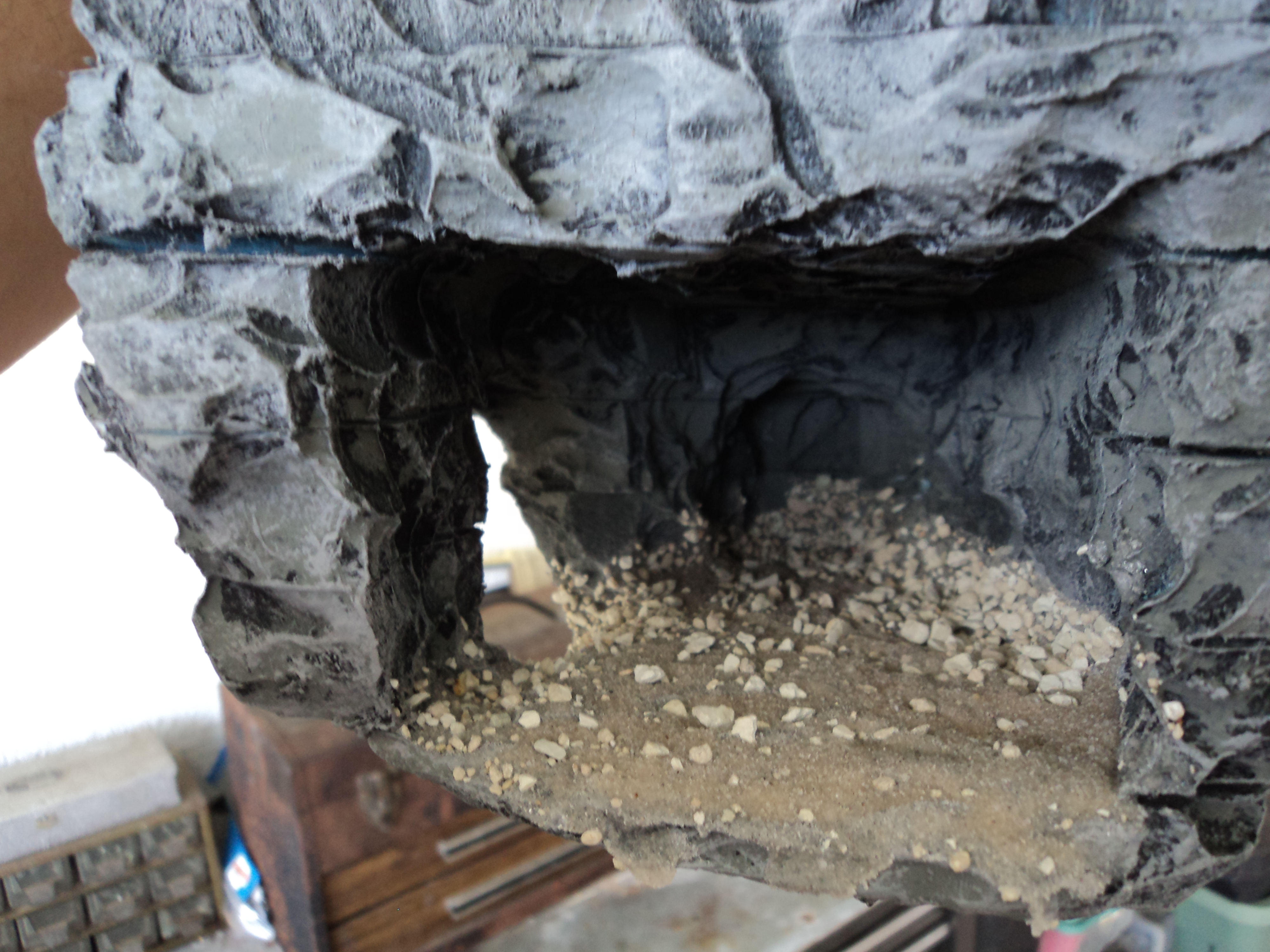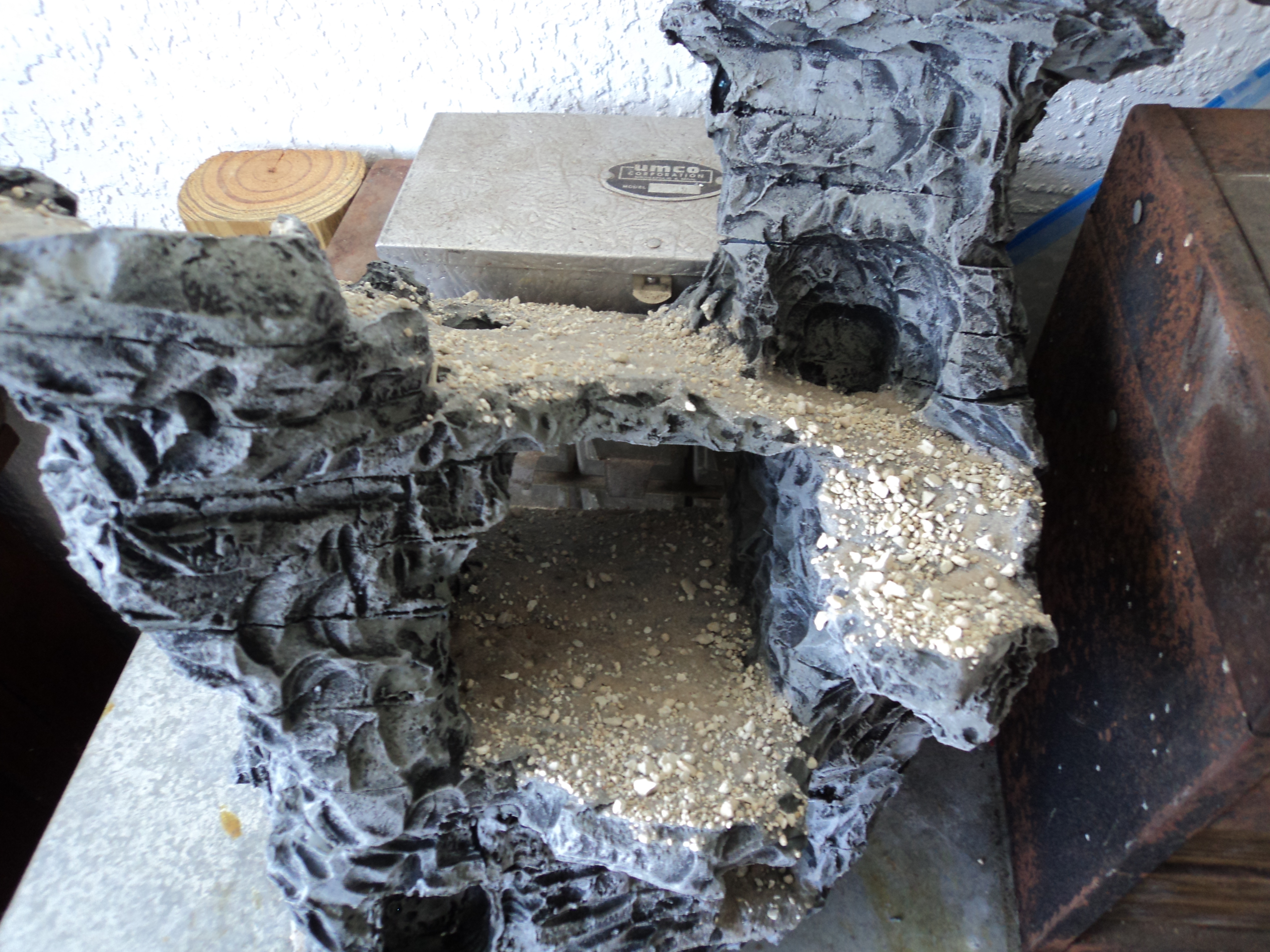 This piece is a sweeping rock formatiom that rises 3 levels. The interesting thing about it is unlike most multi-level terrain, a vehicle (albeit after a difficult terrain test) can ascend to the third level. I'm working on an optional bridge system between this and a few other pieces. The underside of the rock formation is bursting with burrowing nid monstrosities, and a Factory World looking tunnel entrance seems to have been the untimrly doorway to a Smurfs doom! A WIP, I look to touch up the detailed items, flock, and maybe smooth the hill a lil!