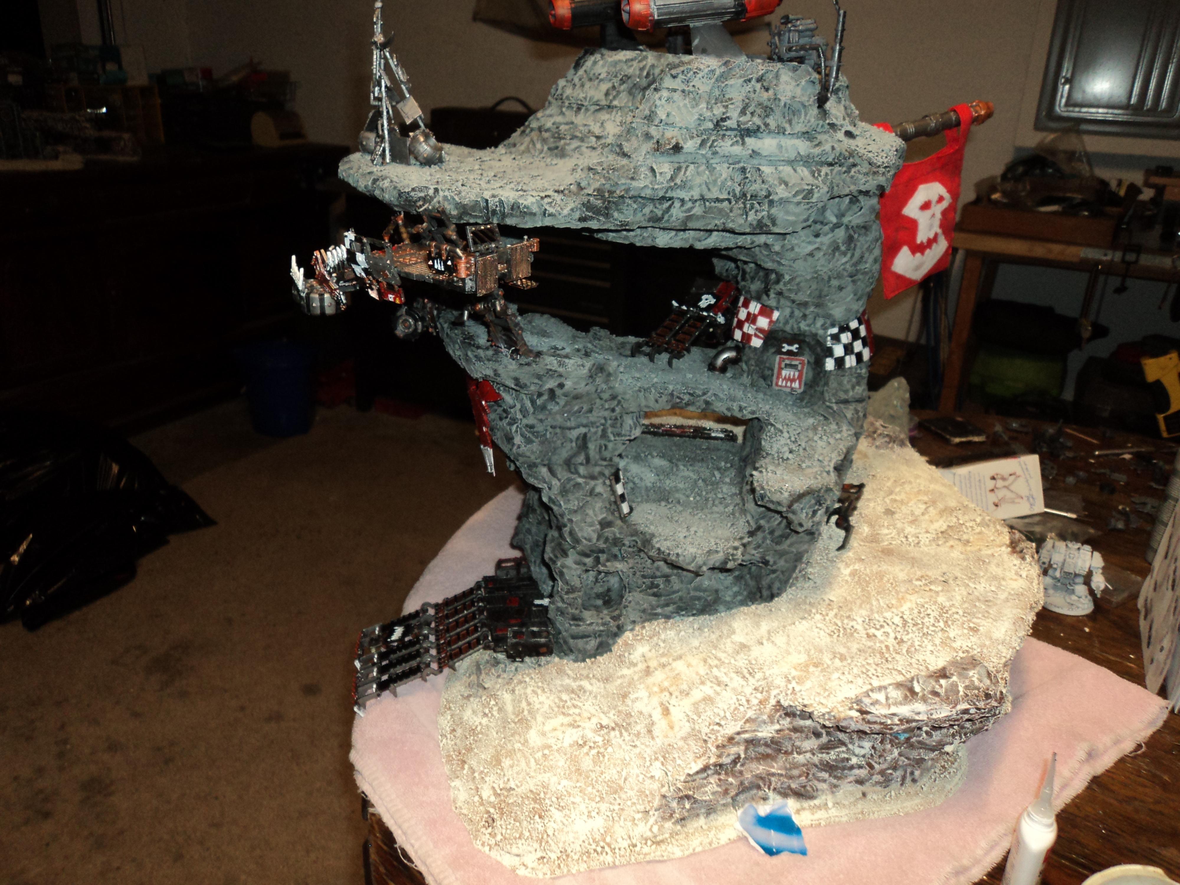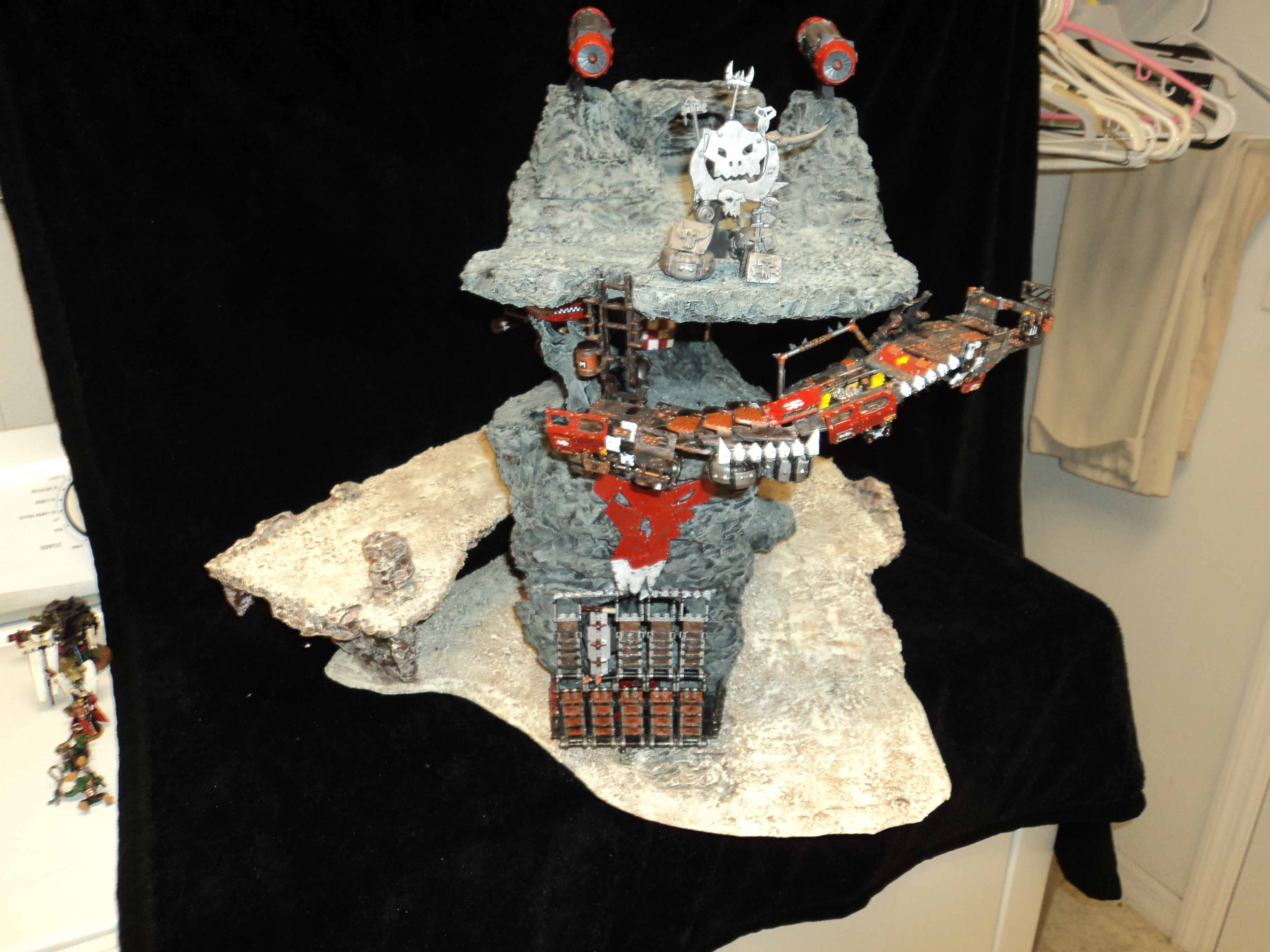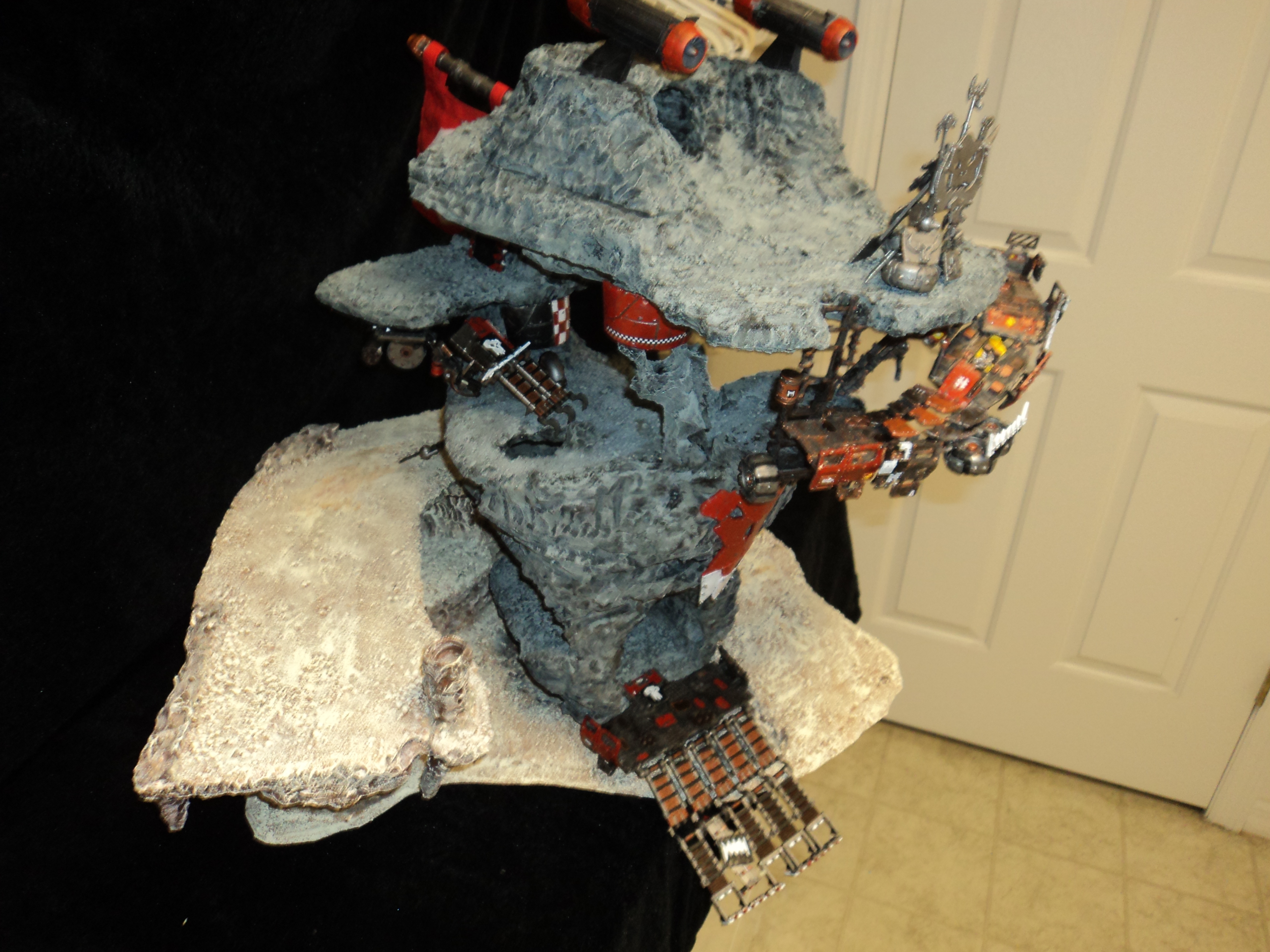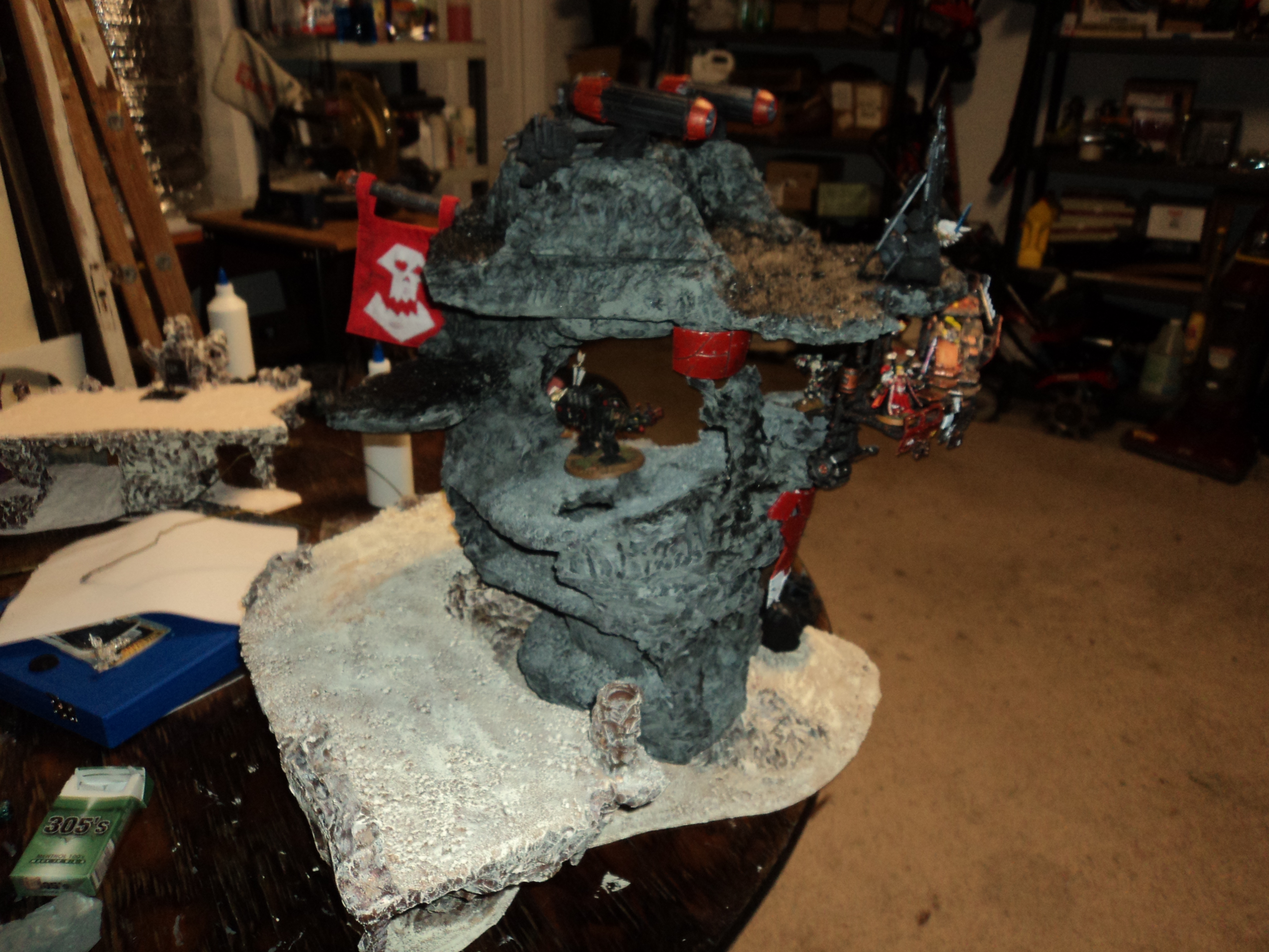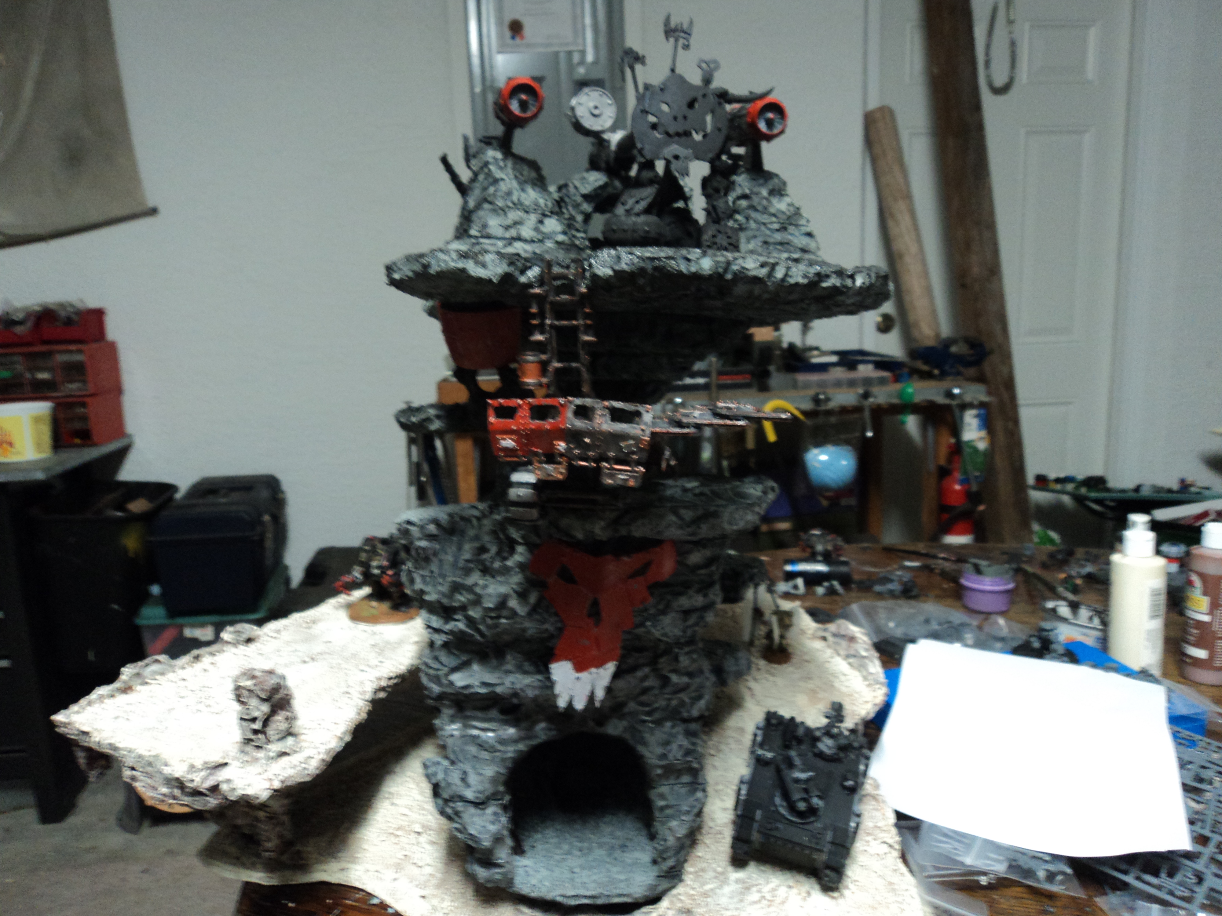 Ork Rok: The Rok is over 19in tall. It features 4 separate levels (as far as CoD would classify), and each level has multiple access points connecting to the base of the terrain. Bits will soon be covering this in the next 72 hours. Like the terrain, it is constructed out of blue foam merging with a dremmel, as well as numerous coats of paint. Flocking also lies in its future