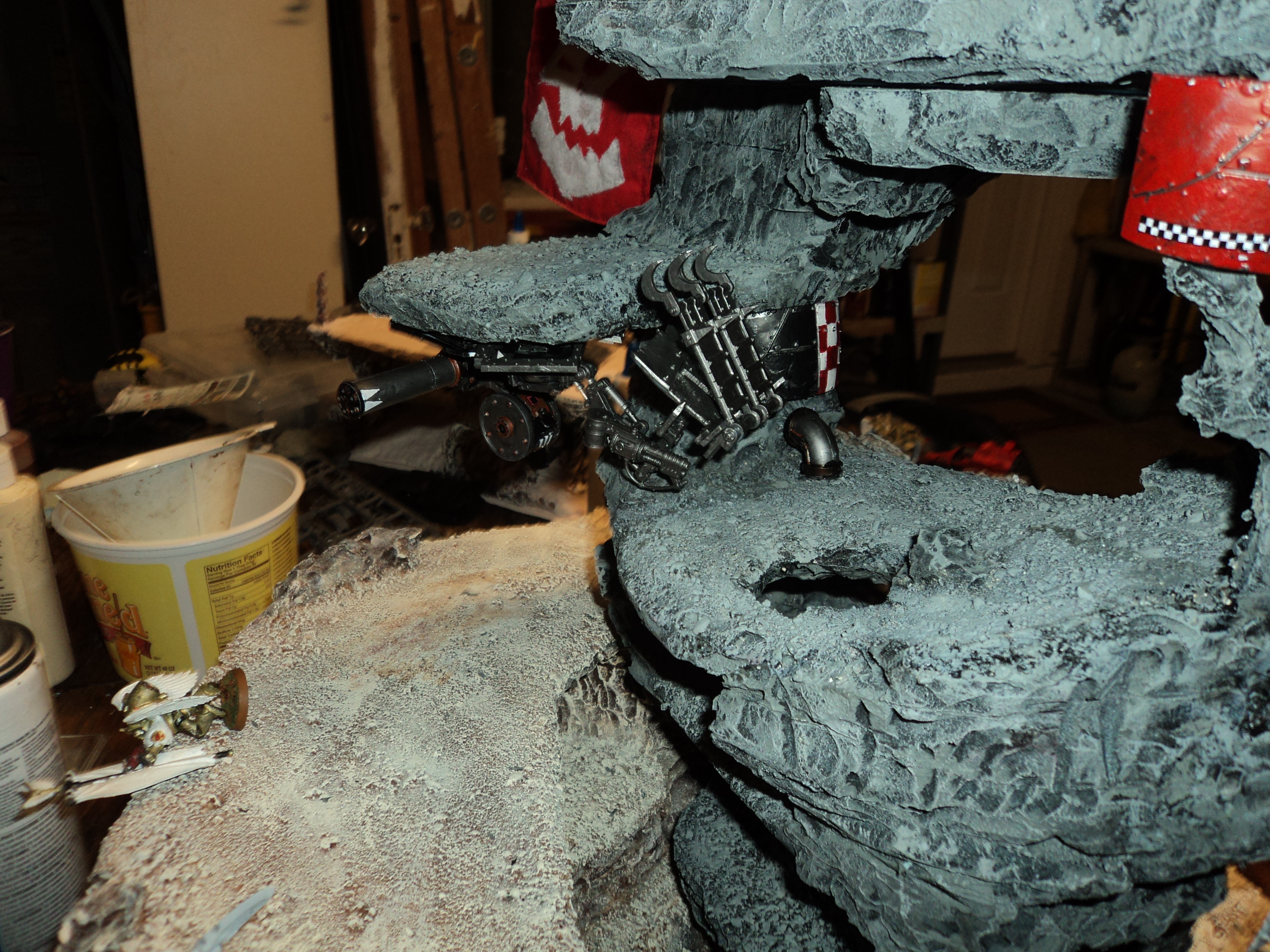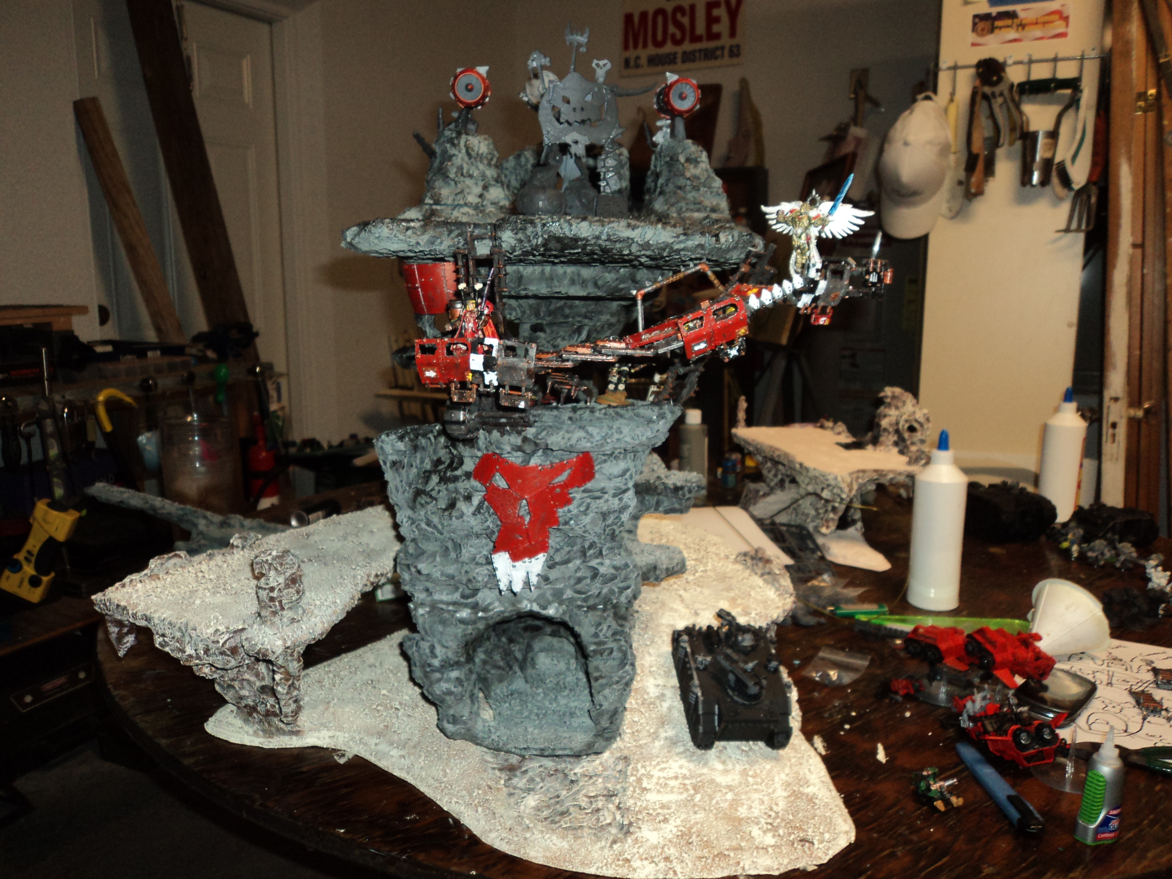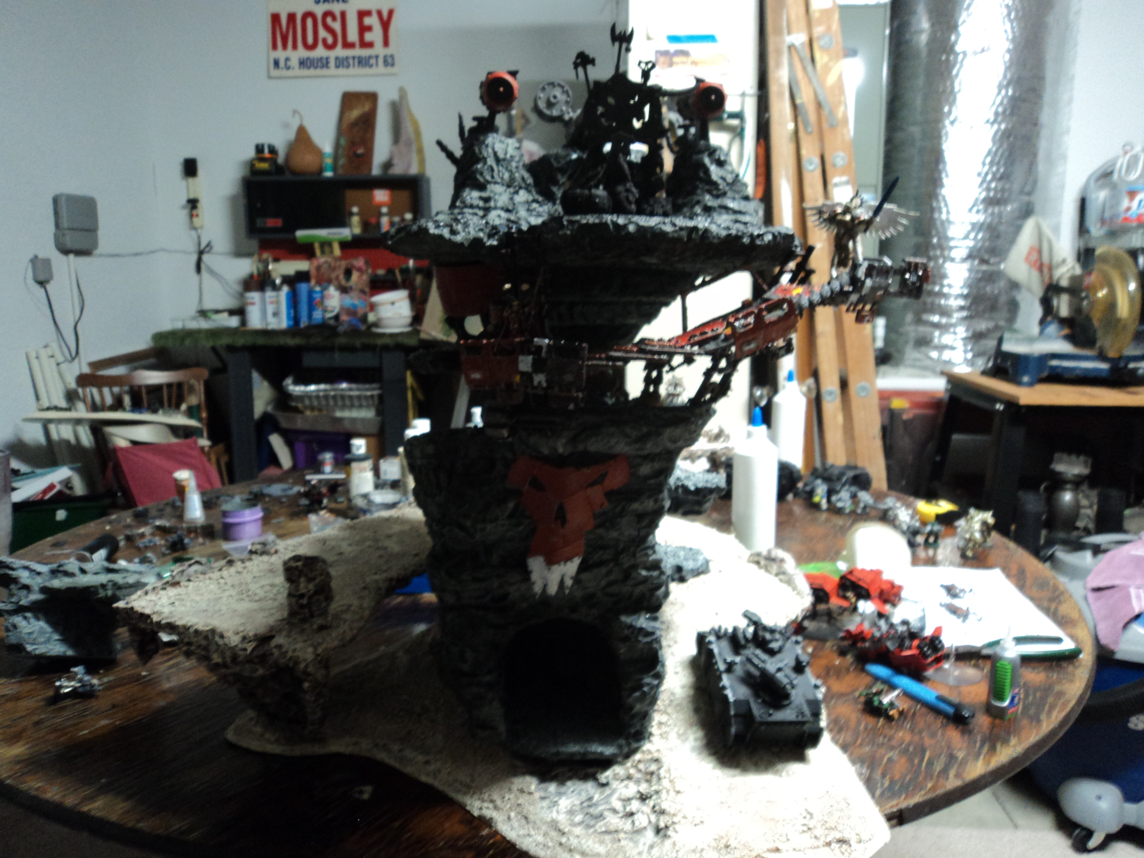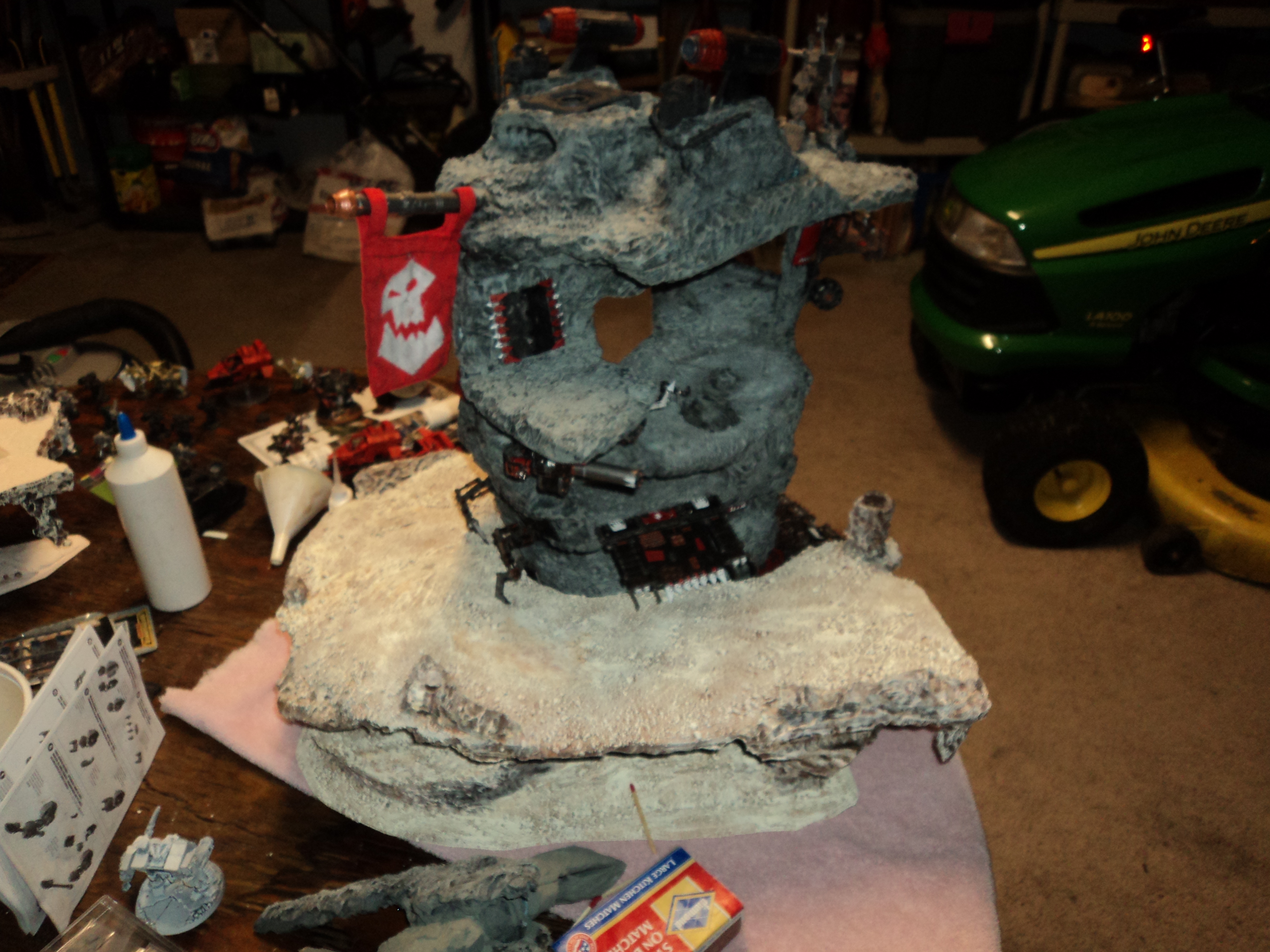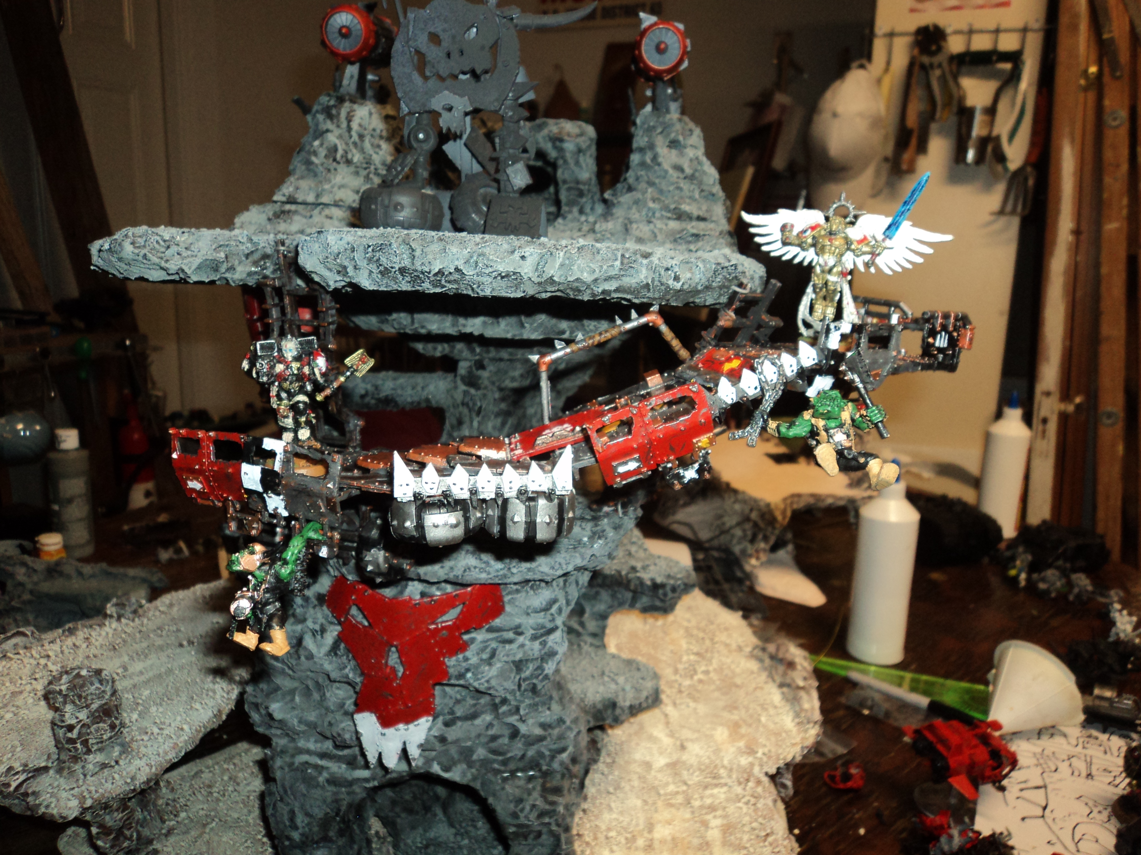 Ork Rok: The Rok is over 19in tall. It features 4 separate levels (as far as CoD would classify), and each level has multiple access points connecting to the base of the terrain. Bits will soon be covering this in the next 72 hours. Like the terrain, it is constructed out of blue foam merging with a dremmel, as well as numerous coats of paint. Flocking also lies in its future