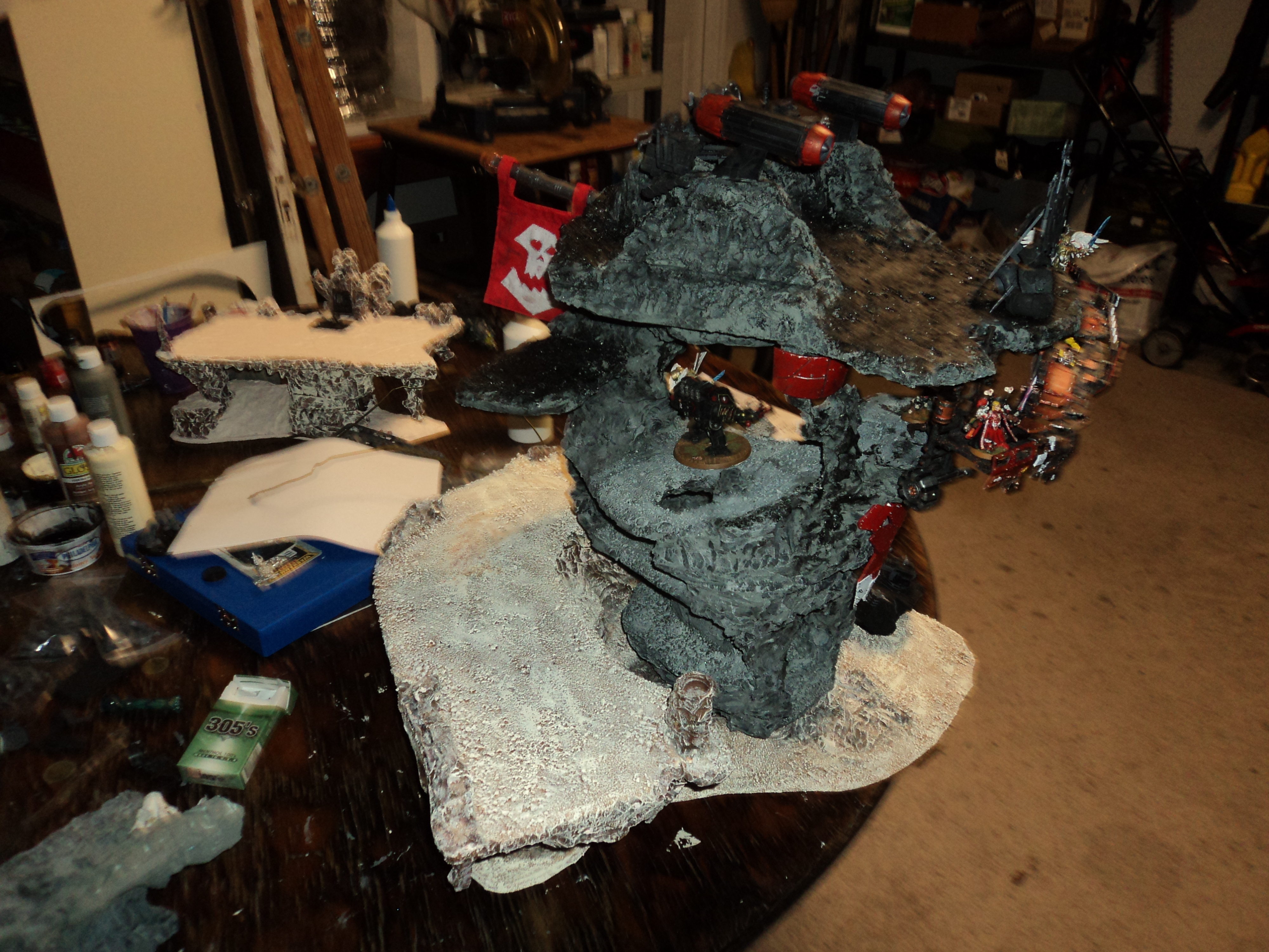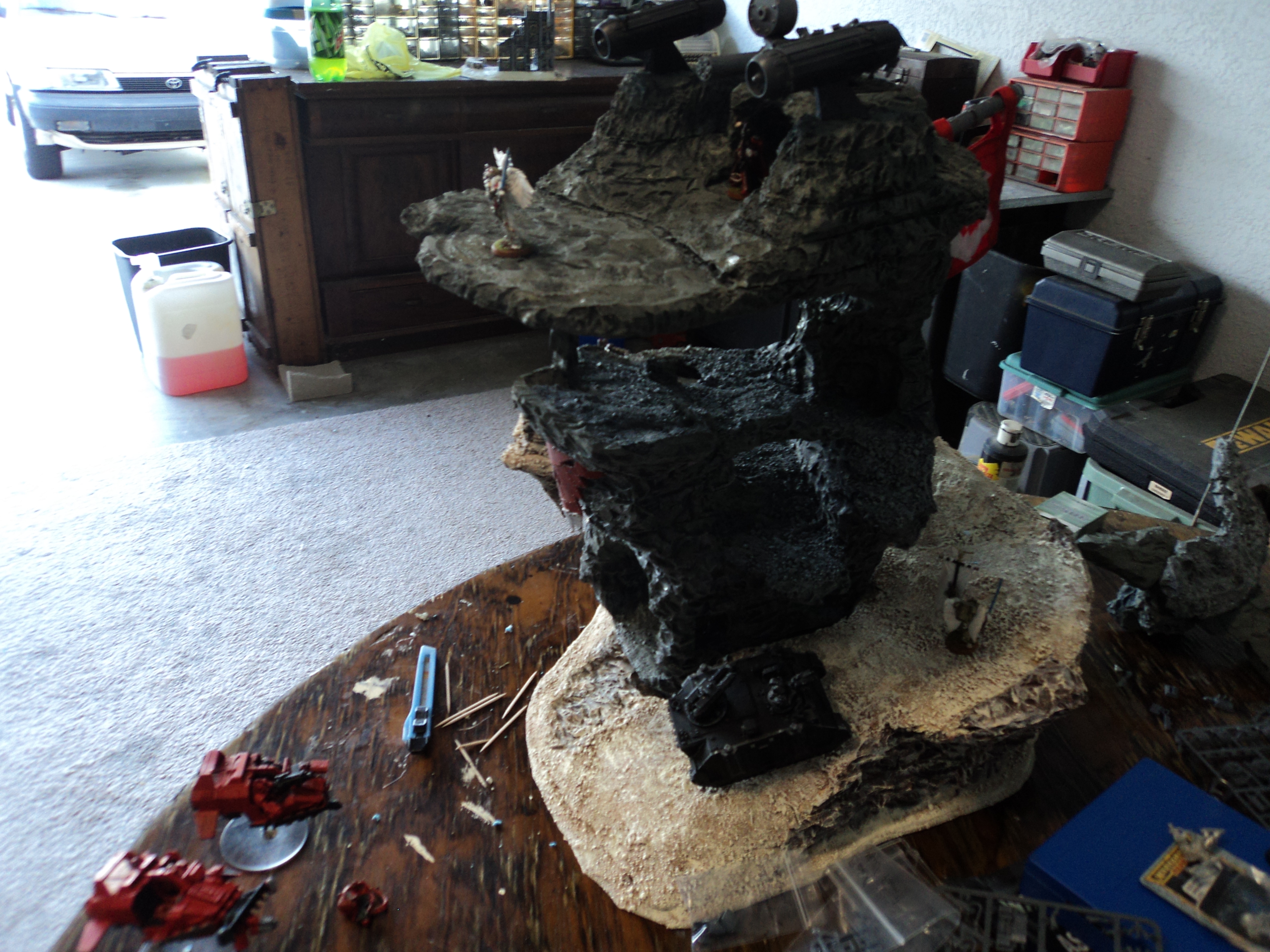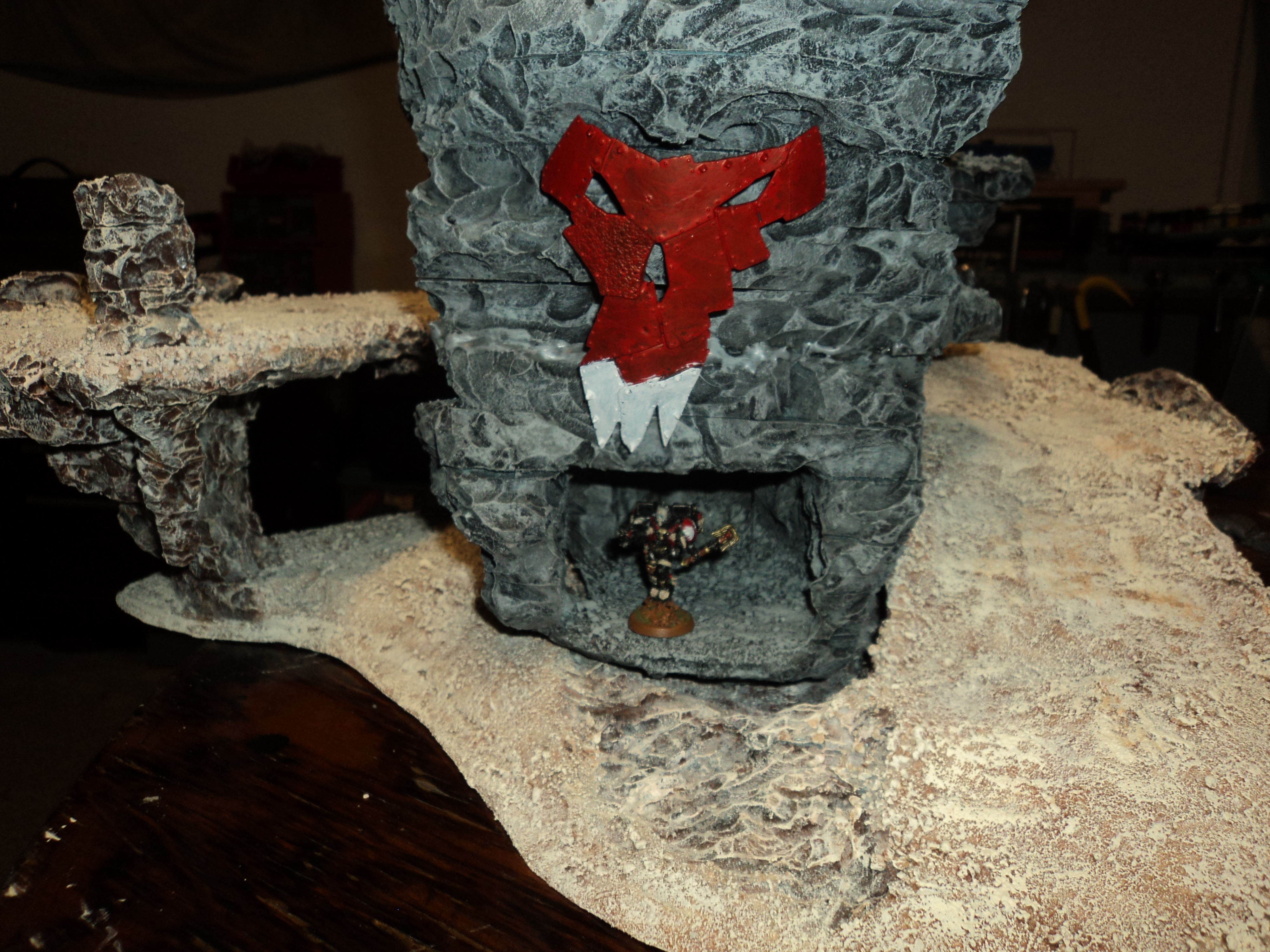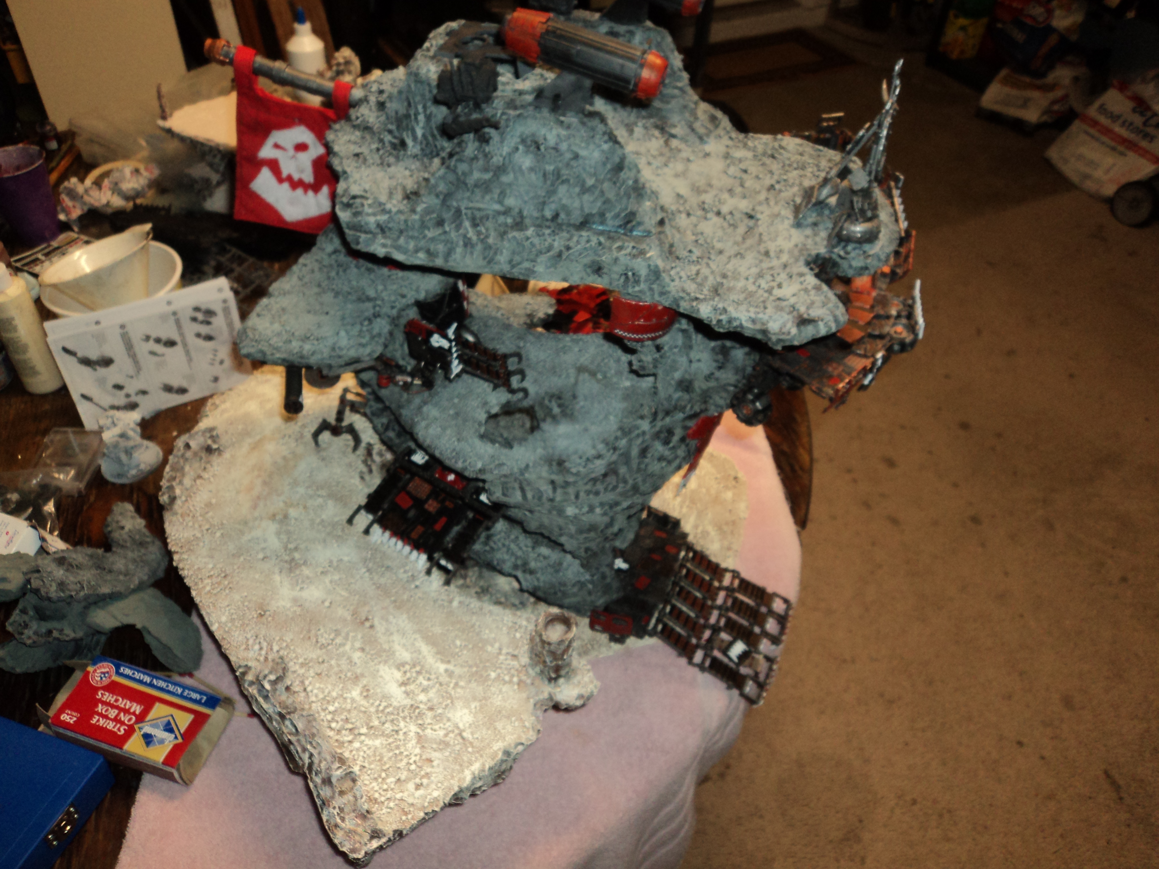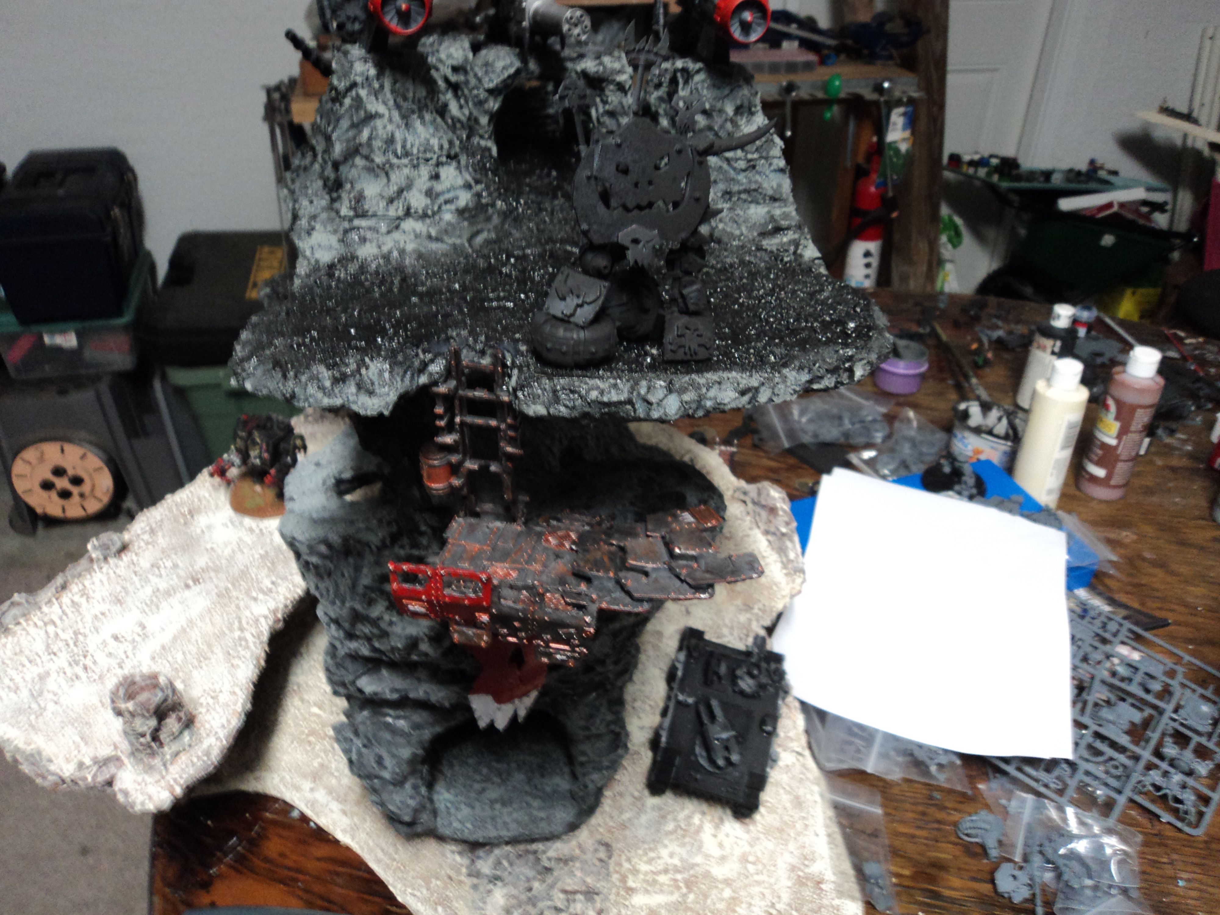 Ork Rok: The Rok is over 19in tall. It features 4 separate levels (as far as CoD would classify), and each level has multiple access points connecting to the base of the terrain. Bits will soon be covering this in the next 72 hours. Like the terrain, it is constructed out of blue foam merging with a dremmel, as well as numerous coats of paint. Flocking also lies in its future