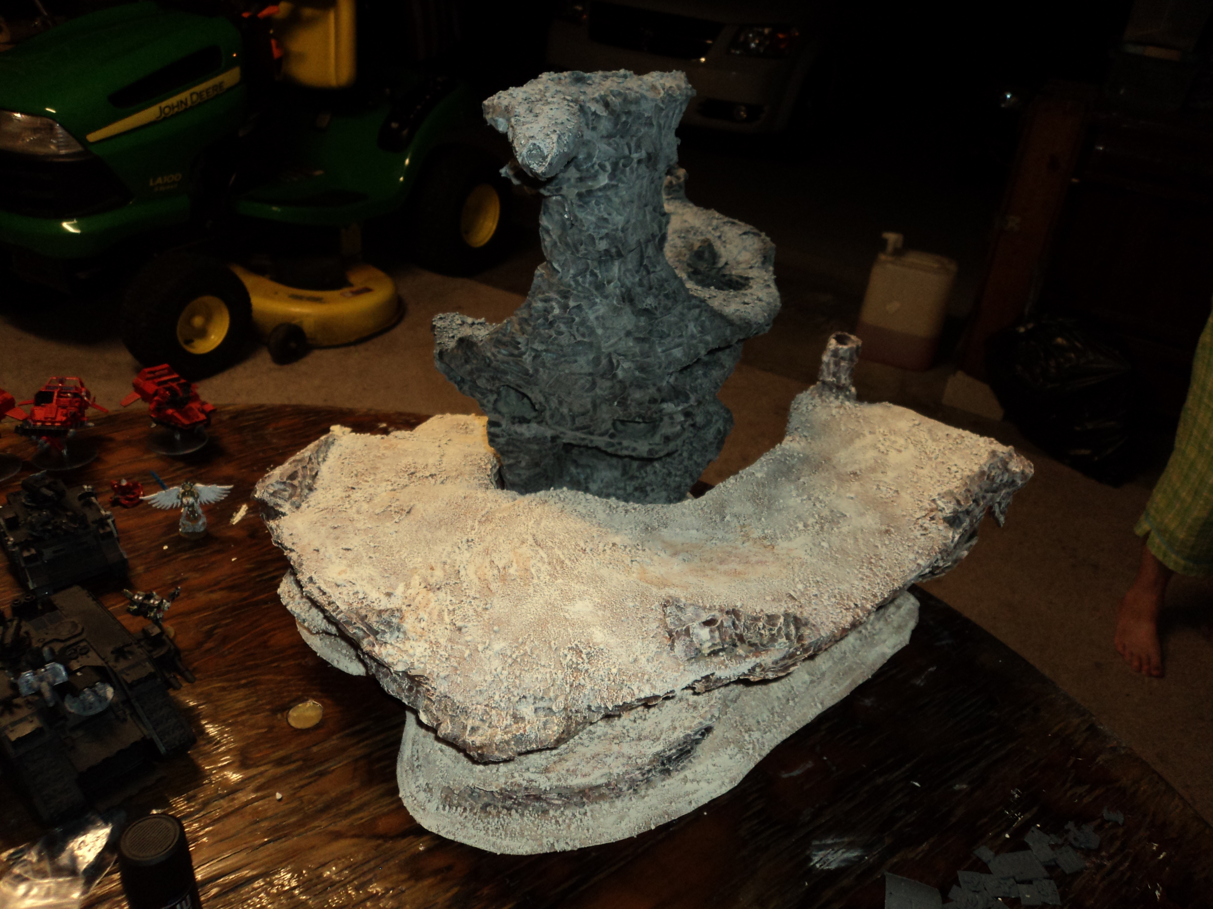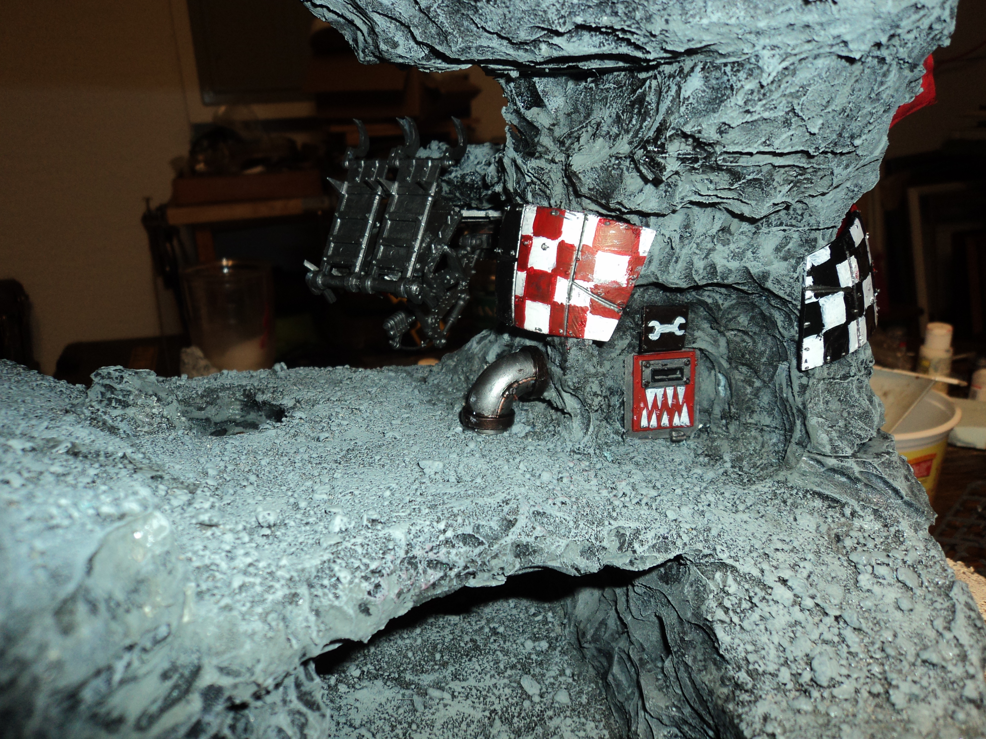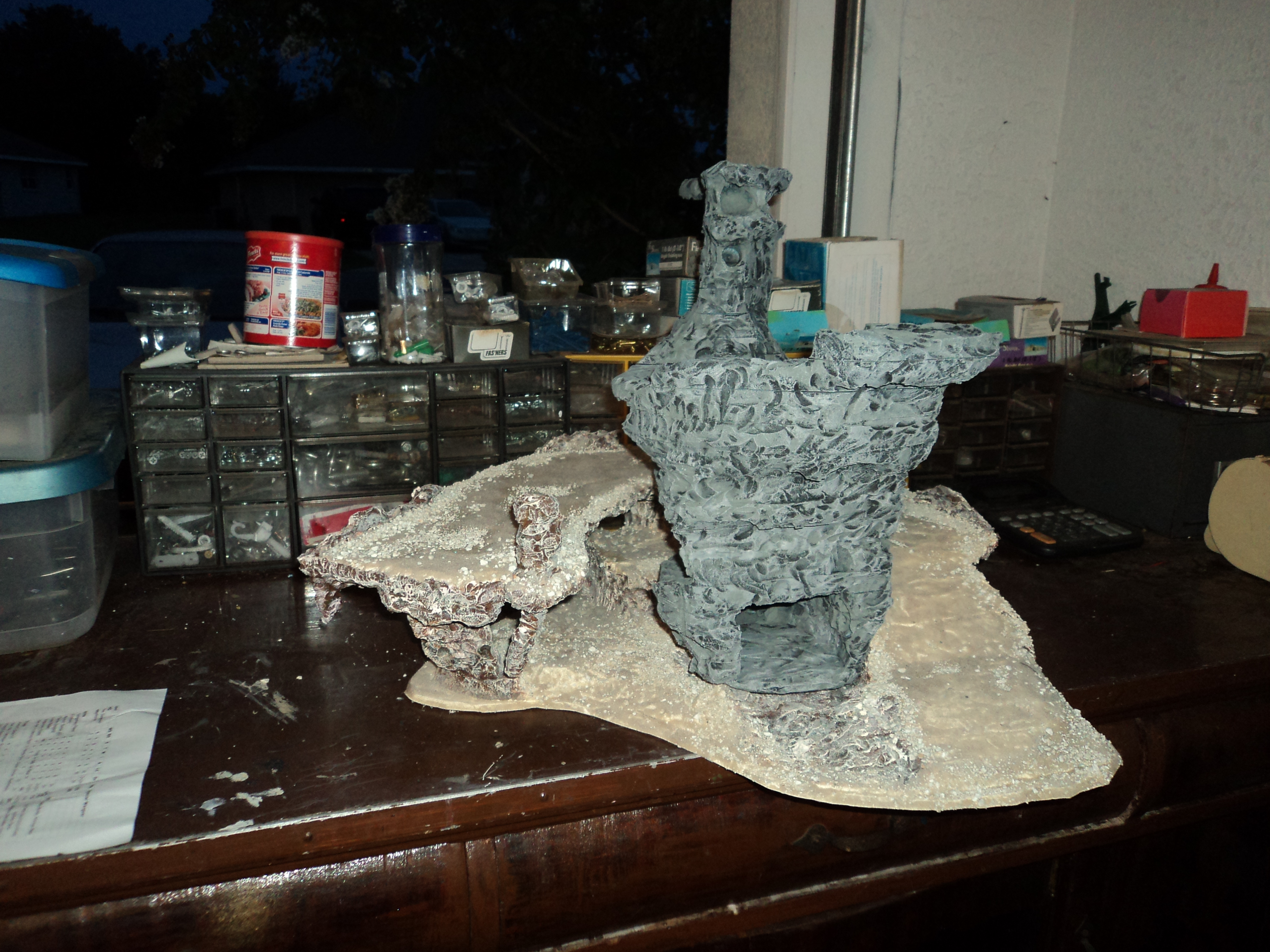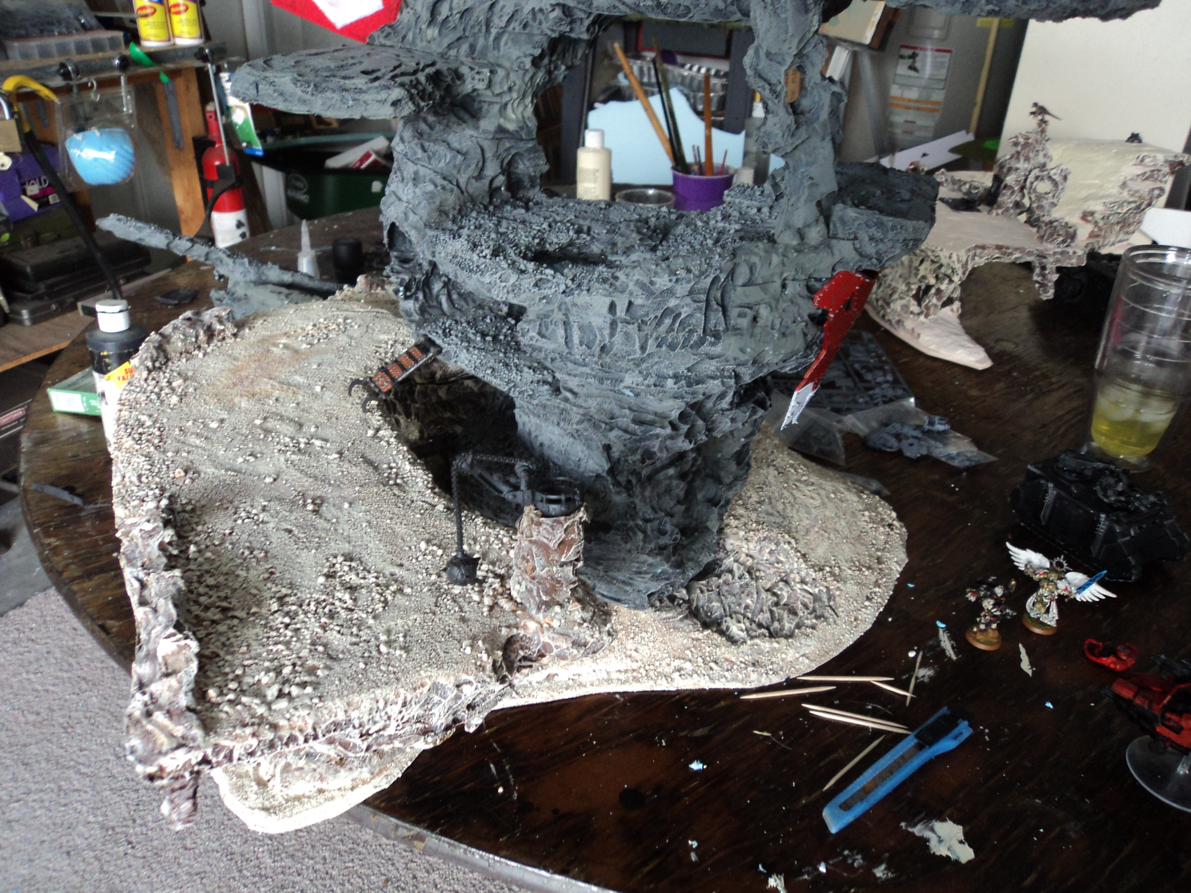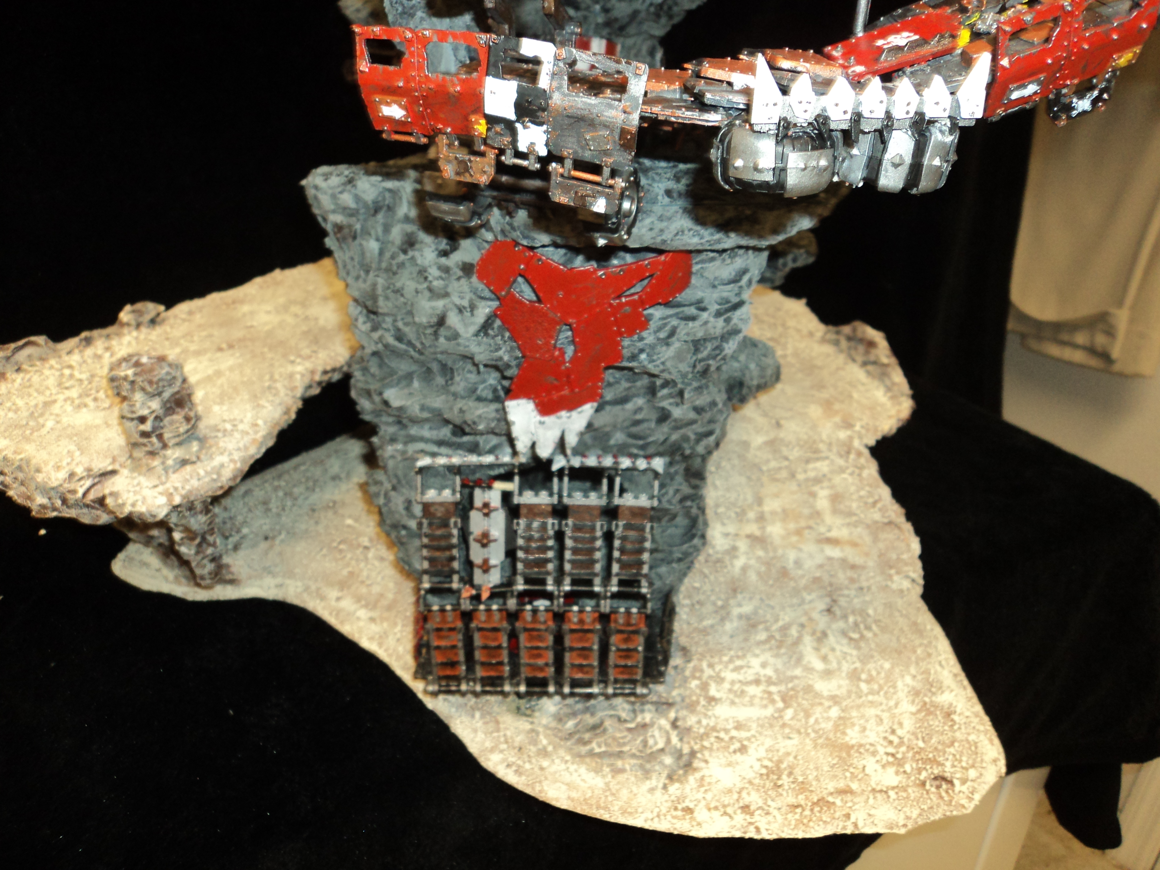 Ork Rok: The Rok is over 19in tall. It features 4 separate levels (as far as CoD would classify), and each level has multiple access points connecting to the base of the terrain. Bits will soon be covering this in the next 72 hours. Like the terrain, it is constructed out of blue foam merging with a dremmel, as well as numerous coats of paint. Flocking also lies in its future
