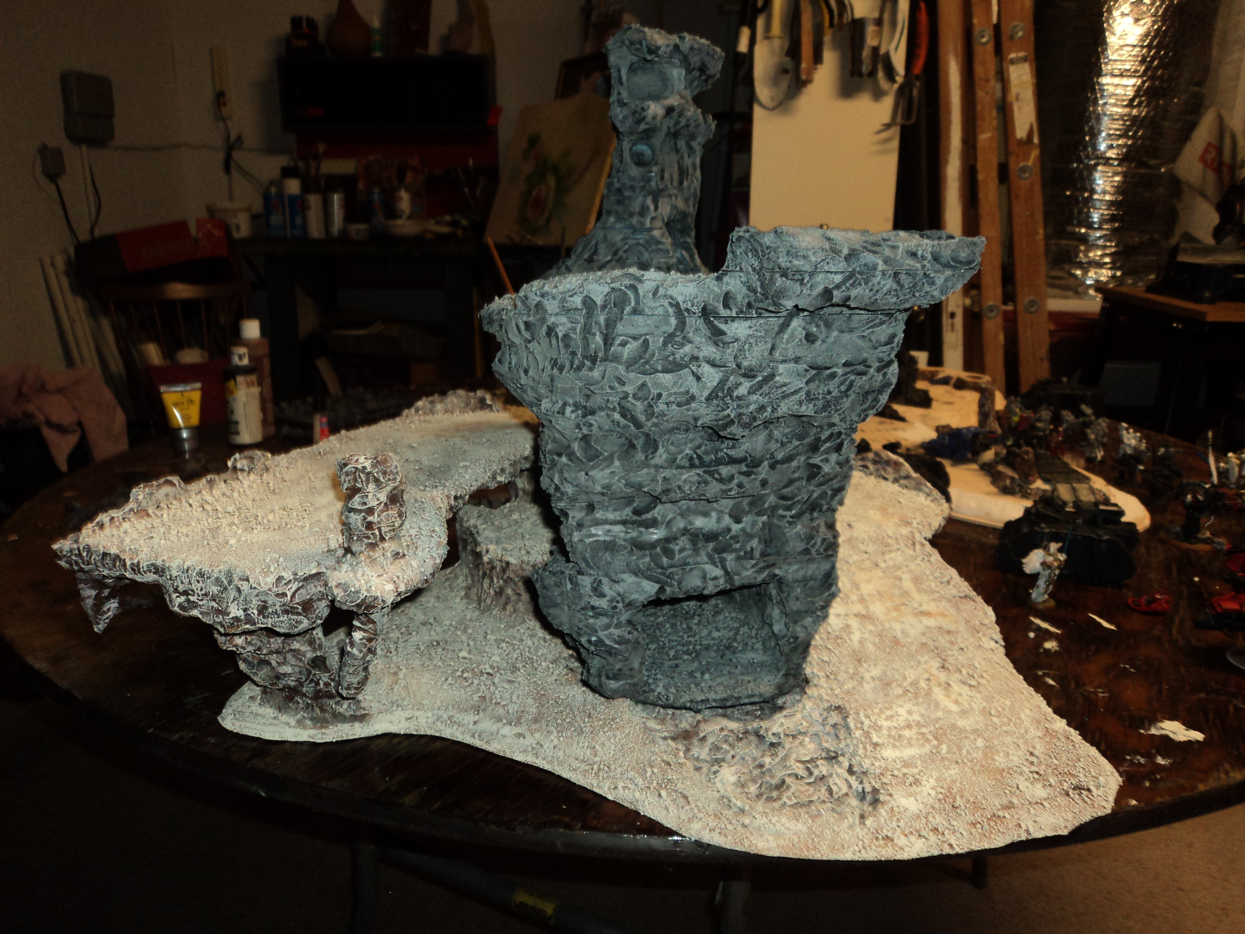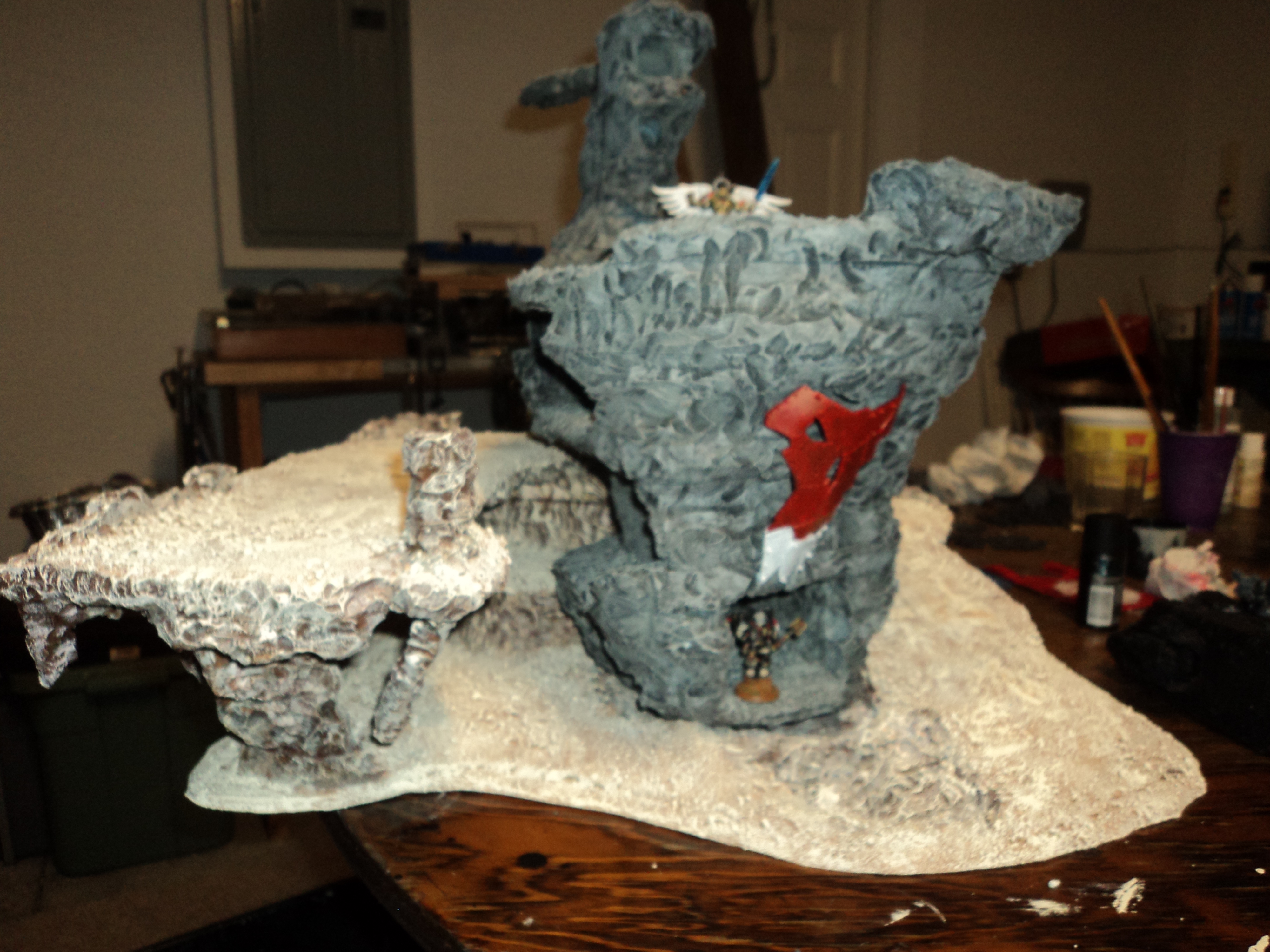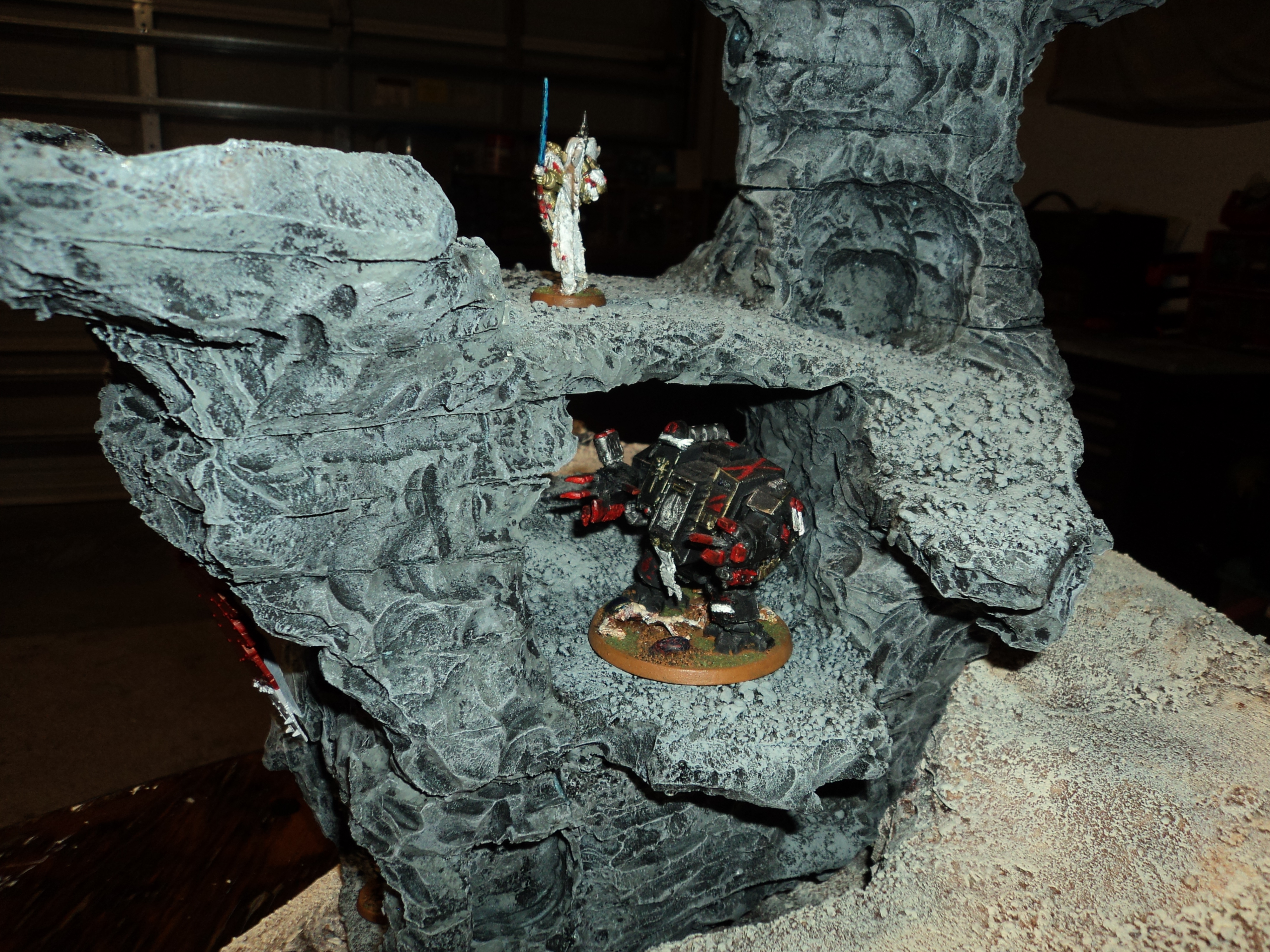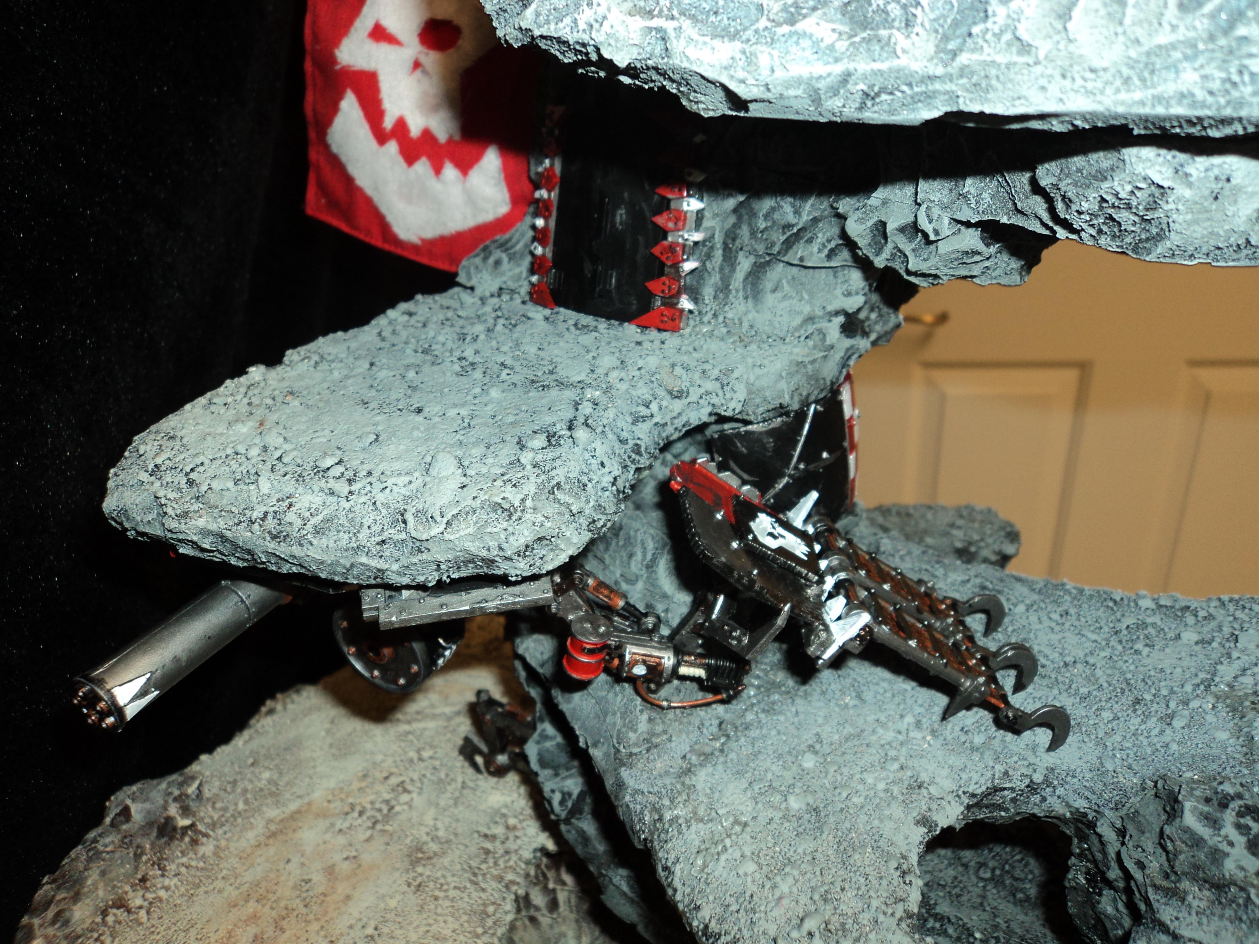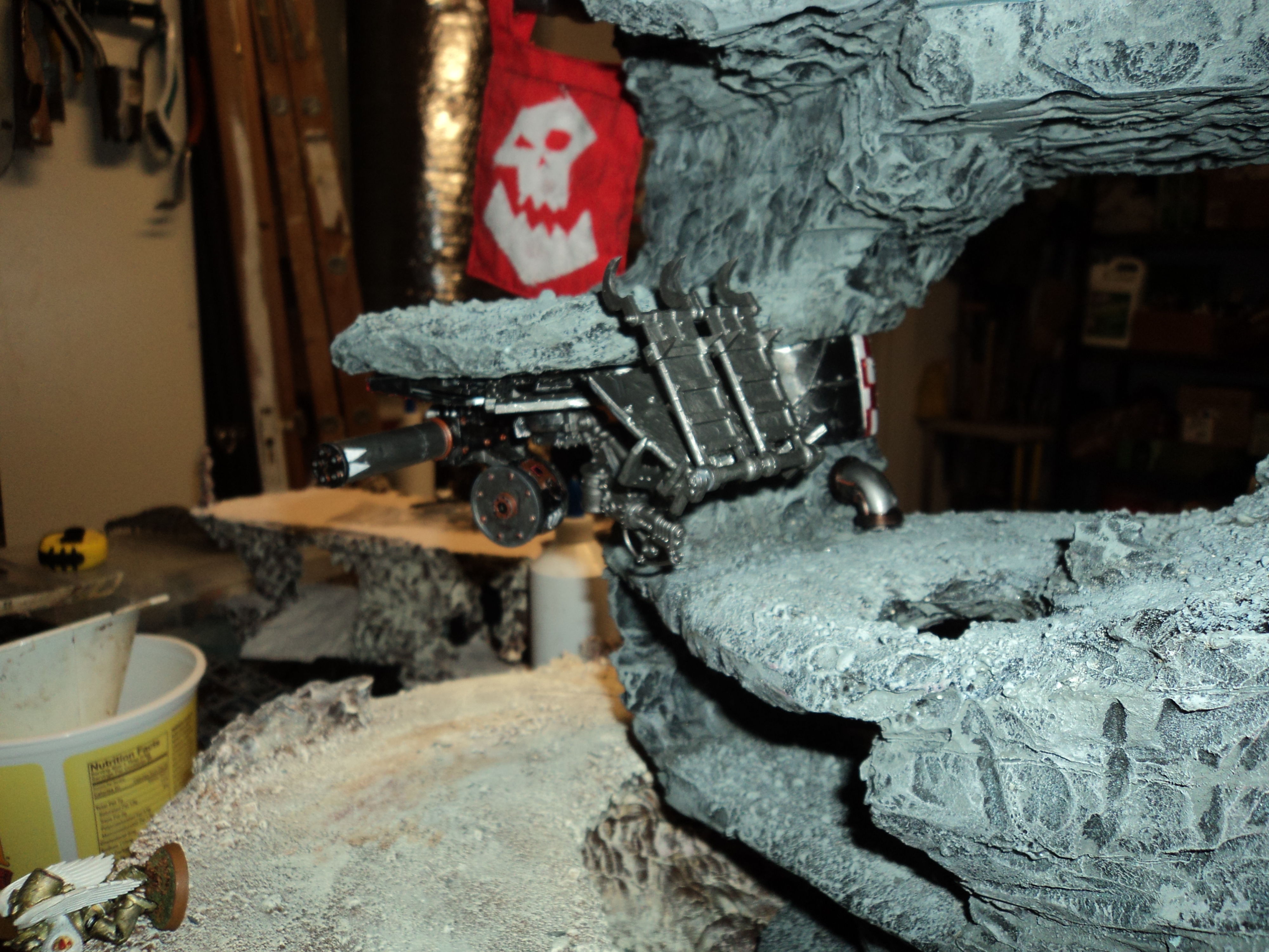 Ork Rok: The Rok is over 19in tall. It features 4 separate levels (as far as CoD would classify), and each level has multiple access points connecting to the base of the terrain. Bits will soon be covering this in the next 72 hours. Like the terrain, it is constructed out of blue foam merging with a dremmel, as well as numerous coats of paint. Flocking also lies in its future