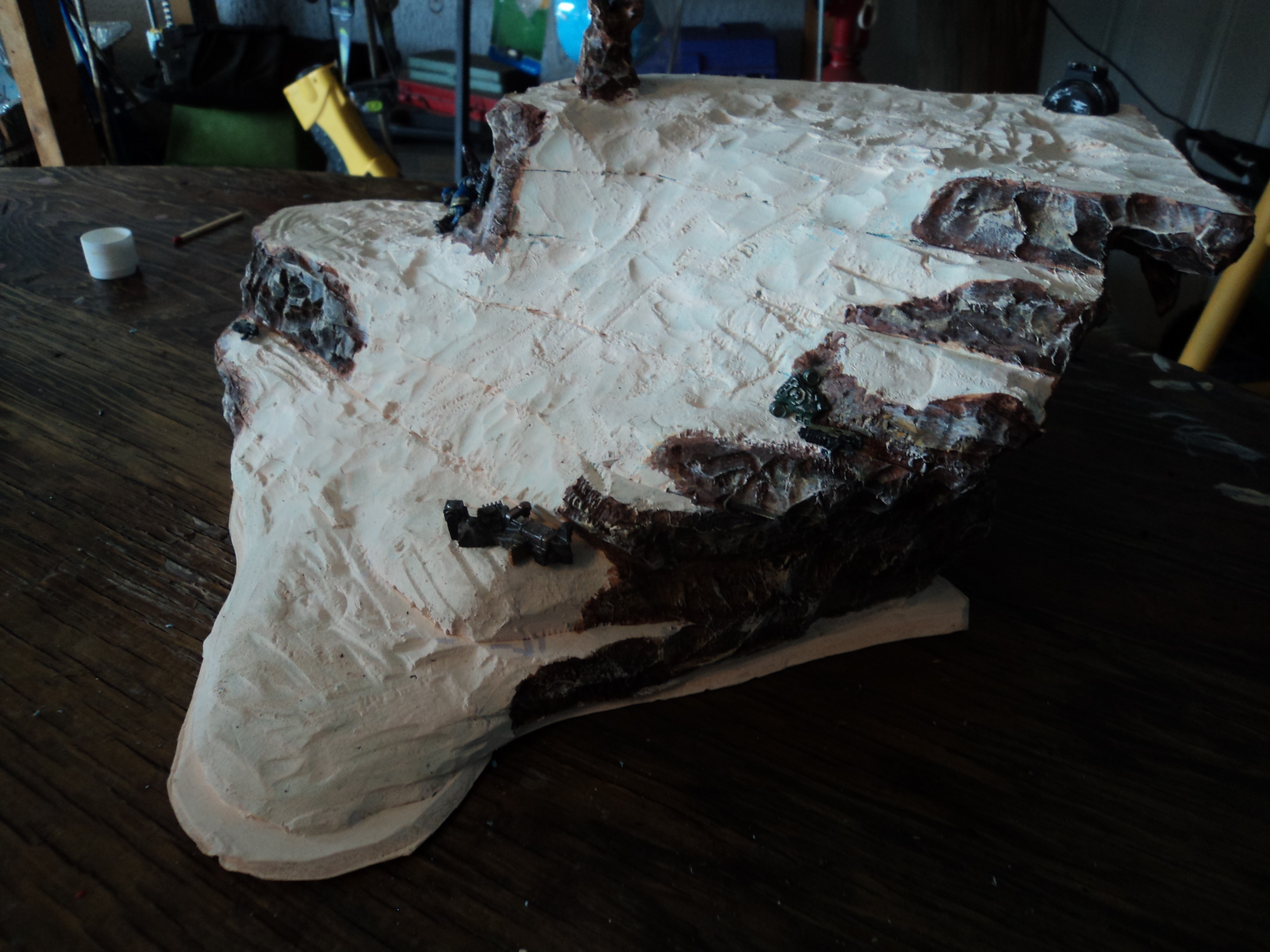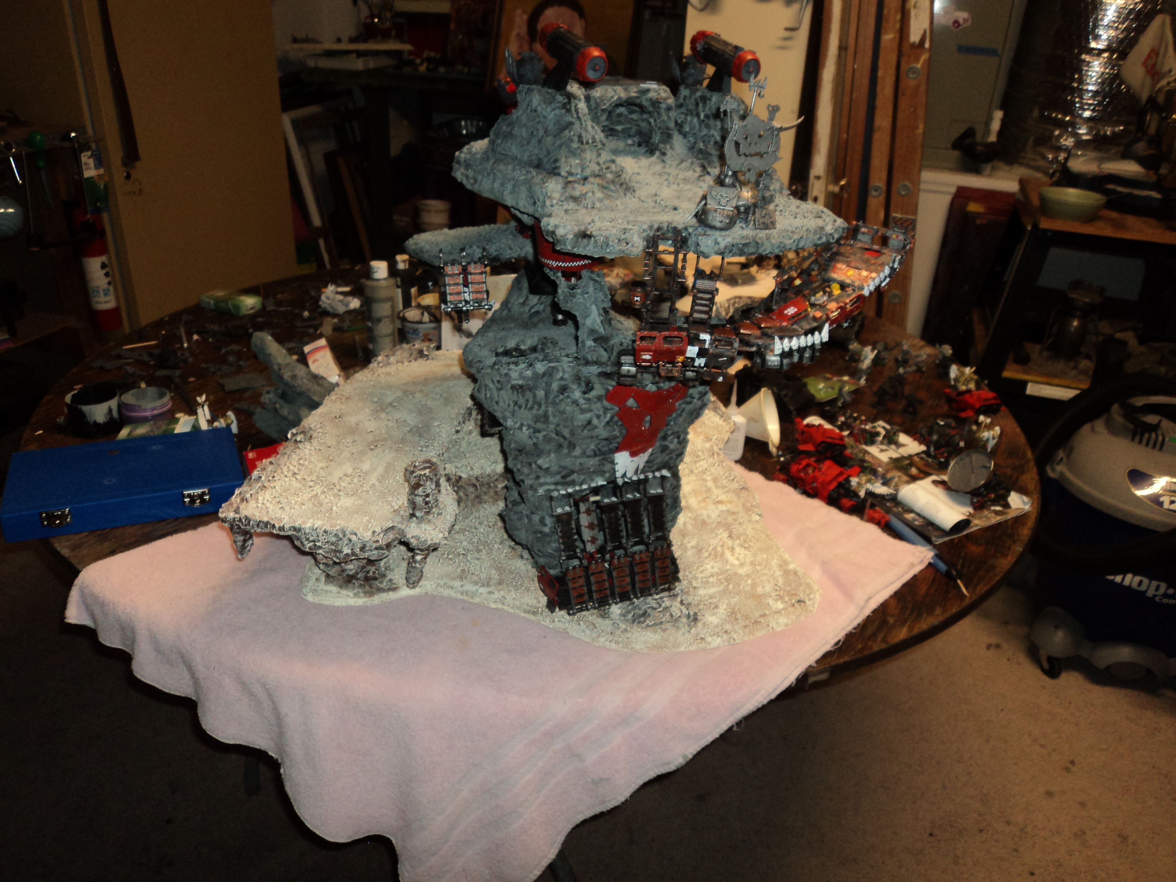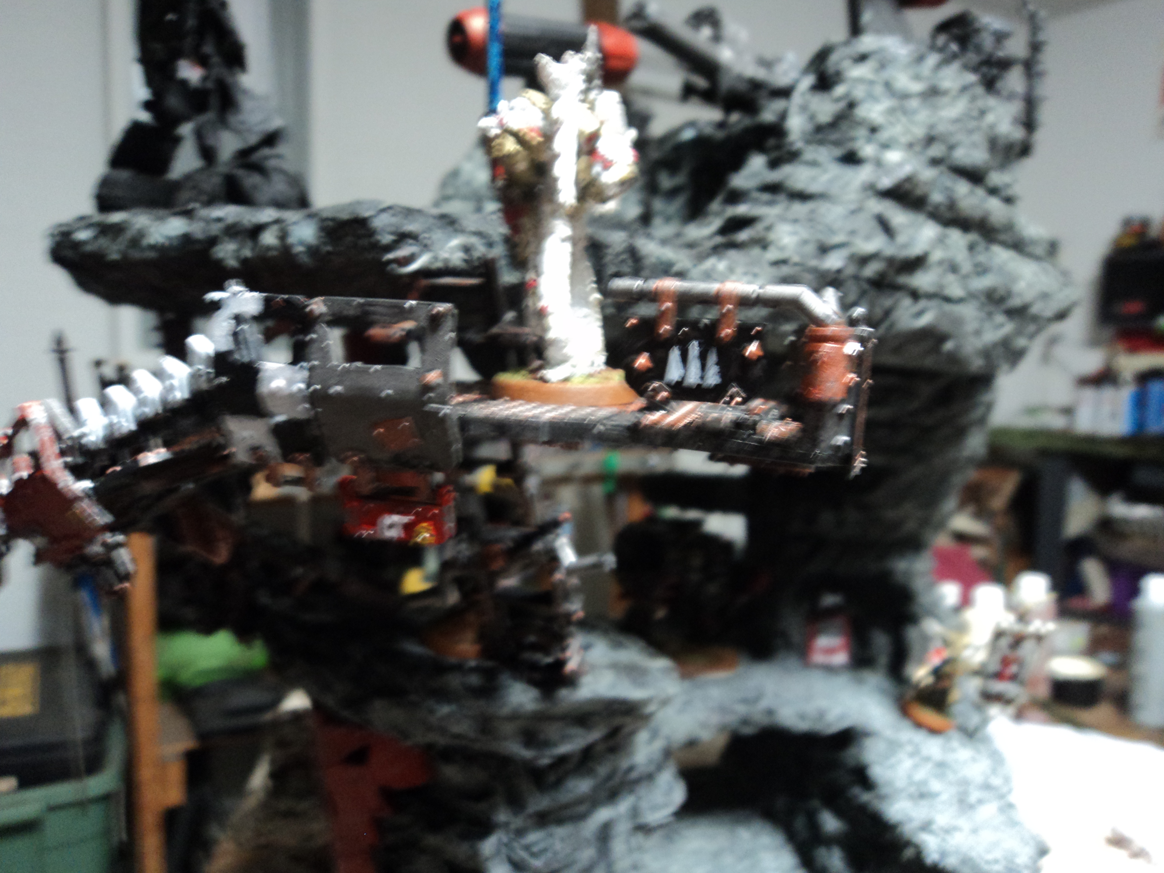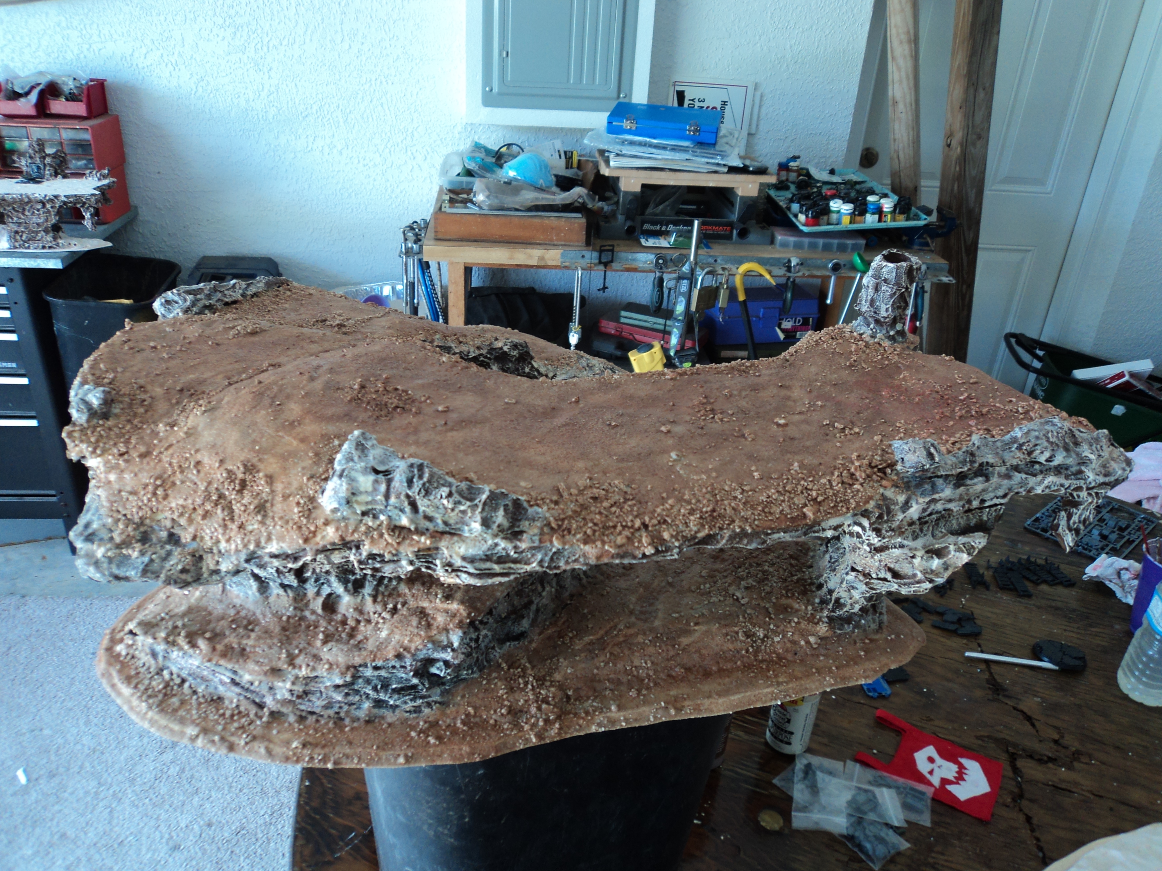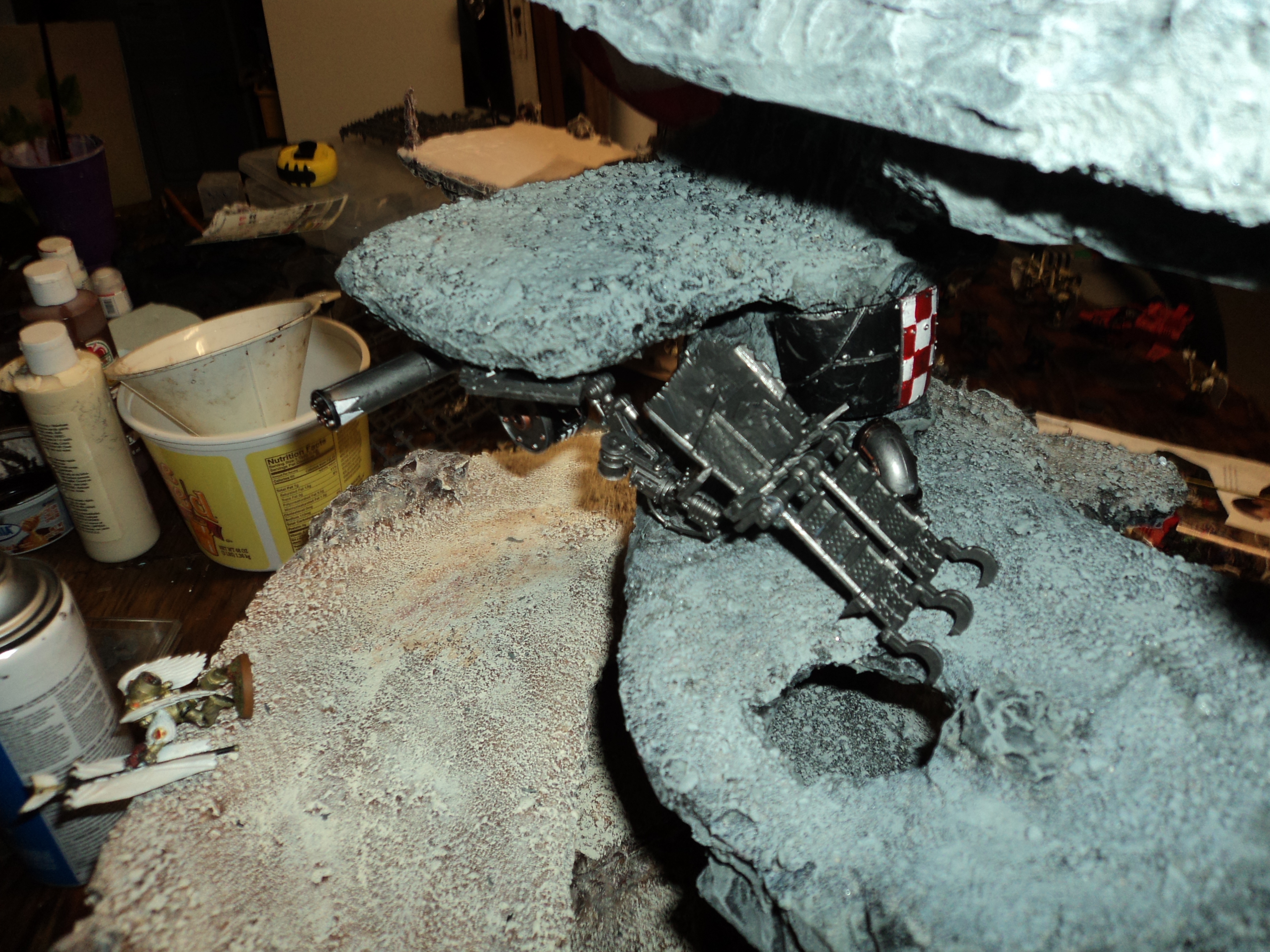 Ork Rok: The Rok is over 19in tall. It features 4 separate levels (as far as CoD would classify), and each level has multiple access points connecting to the base of the terrain. Bits will soon be covering this in the next 72 hours. Like the terrain, it is constructed out of blue foam merging with a dremmel, as well as numerous coats of paint. Flocking also lies in its future