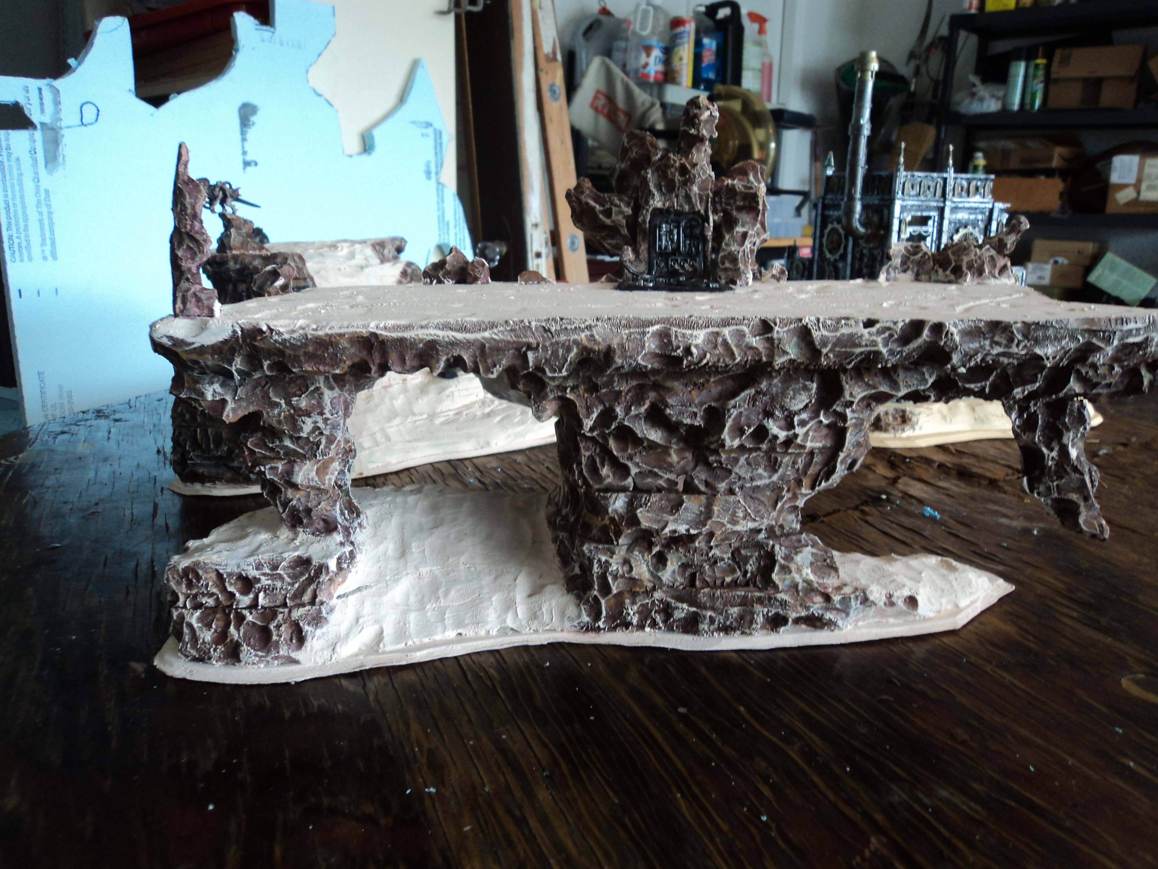 Last edition to the Battlefield is another three level piece. This one forms a bridging piece between the ork hq, nid hill, and some other things in the works. Ideally, the terrain+bridge pieces will be shiftable enough to set the table a few ways. Ive played on all the pieces except the ork hq. Got a game on Sunday well see how that goes! Anyways, this piece will have another Manufactor-esque tunnel/mine-like entrance on one end. It has a shaft going to the top floor ( you can actually see down the manhole soon to have GW ladder in place). The rock formation on the top is interesting, and it will soon see a representation of the Nids, Orks, and SM battling it out. The terrain will have a Mechanium-overrun-by-ork-but-contested-junction feel to it!