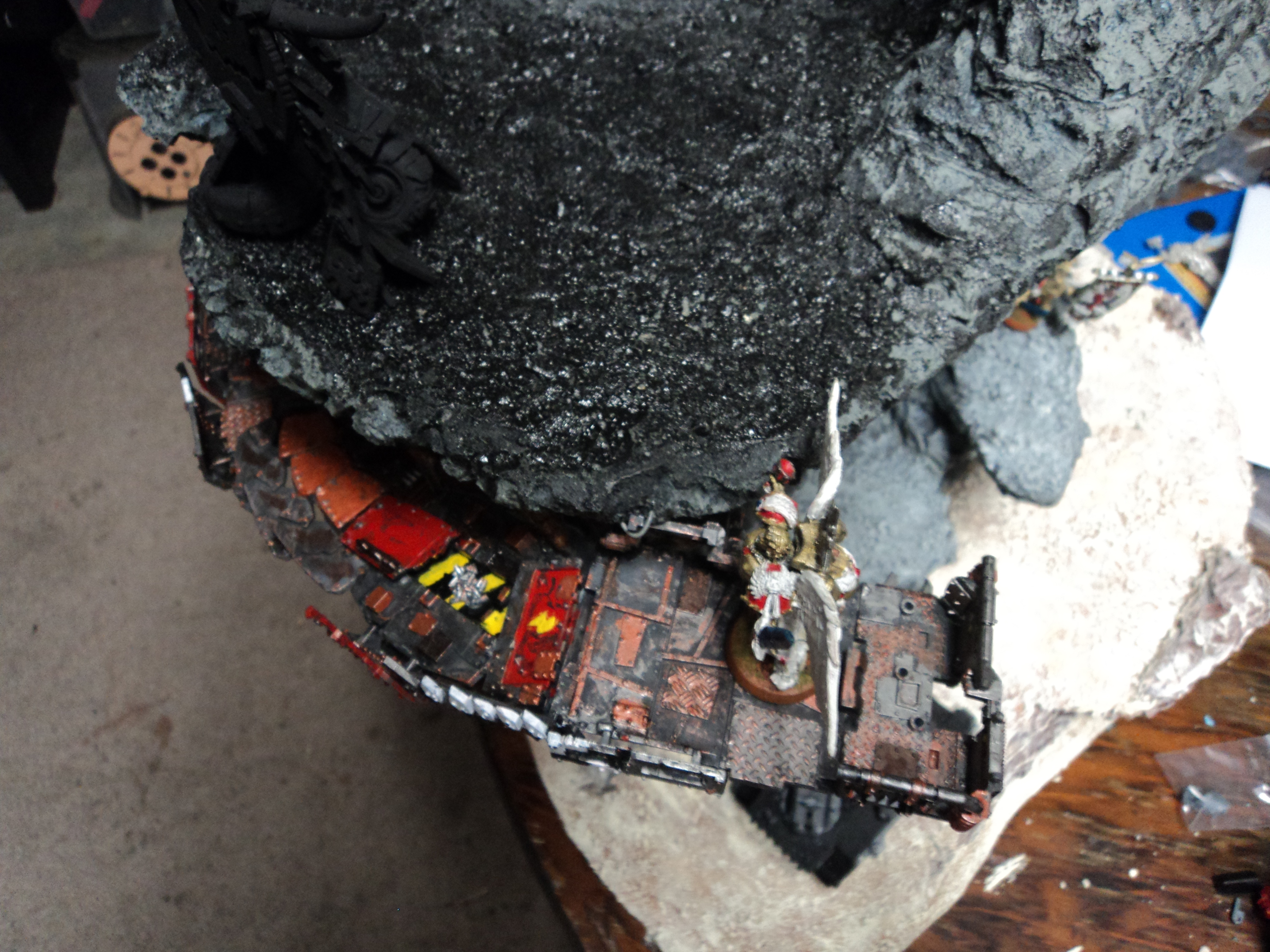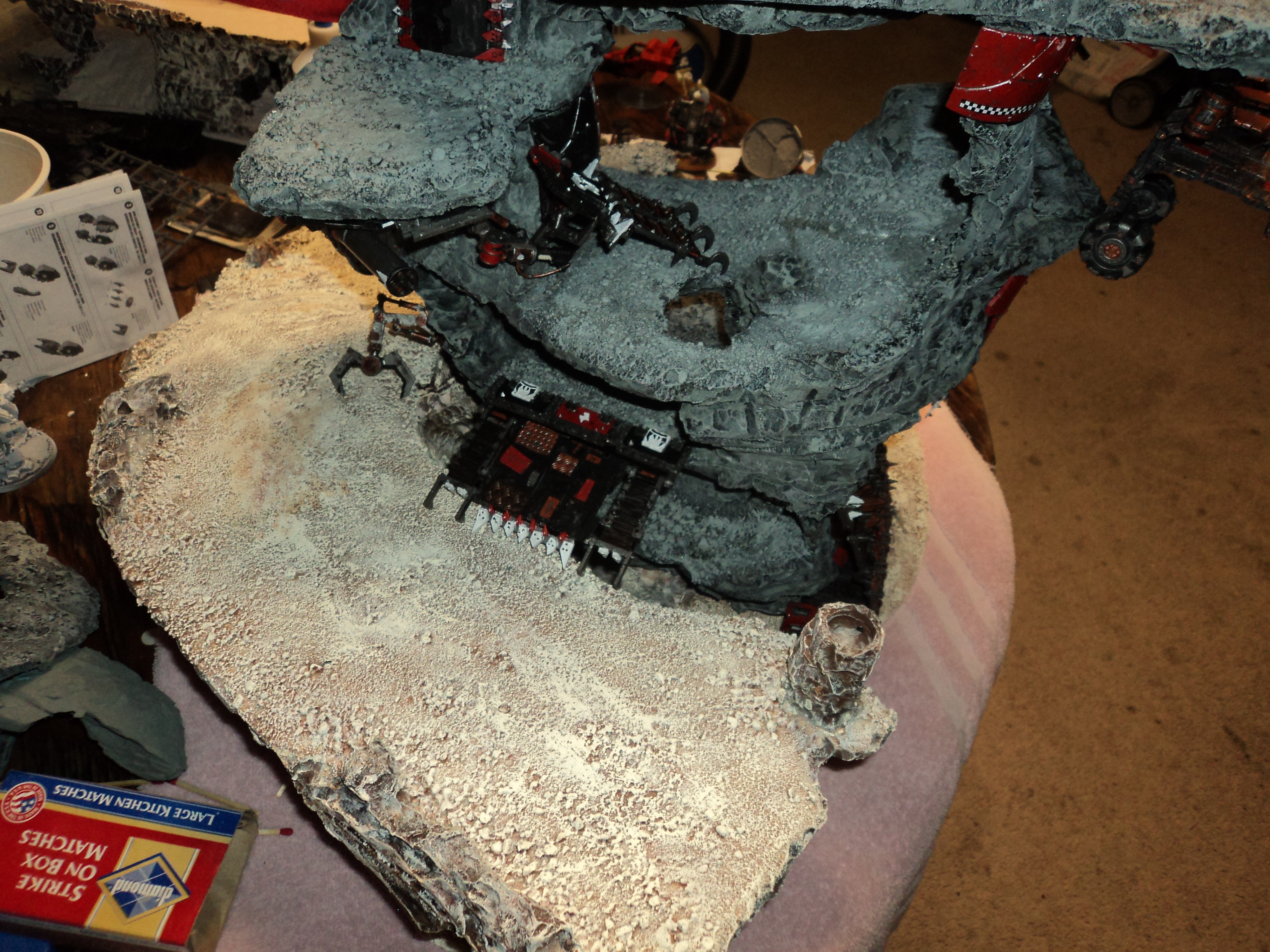 Landing Site/HQ Base complete! All thats left is the detailing pieces, but most of those will be on the actual Rok! I can't wait to apply the flocking technique to the other four pieces once this beast of a project is finished! I added a few of my personal Blood Angels to show a scale of just how massive this terrain is! Onward!